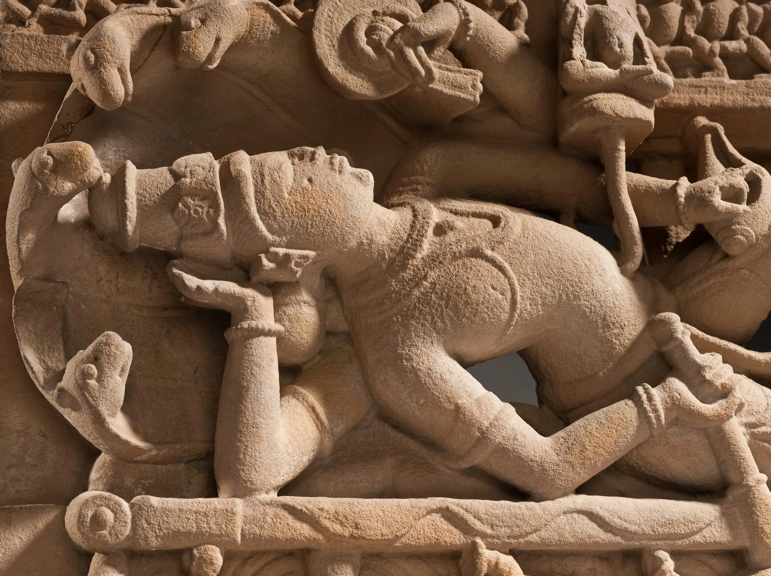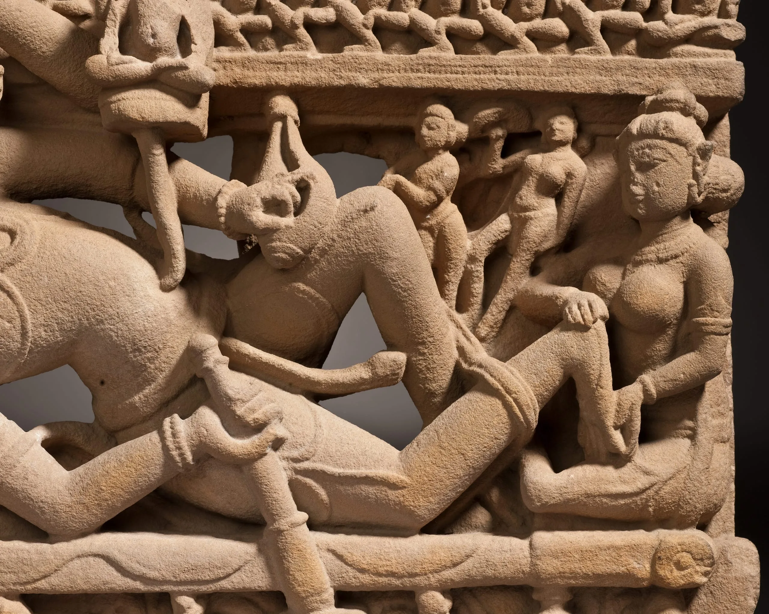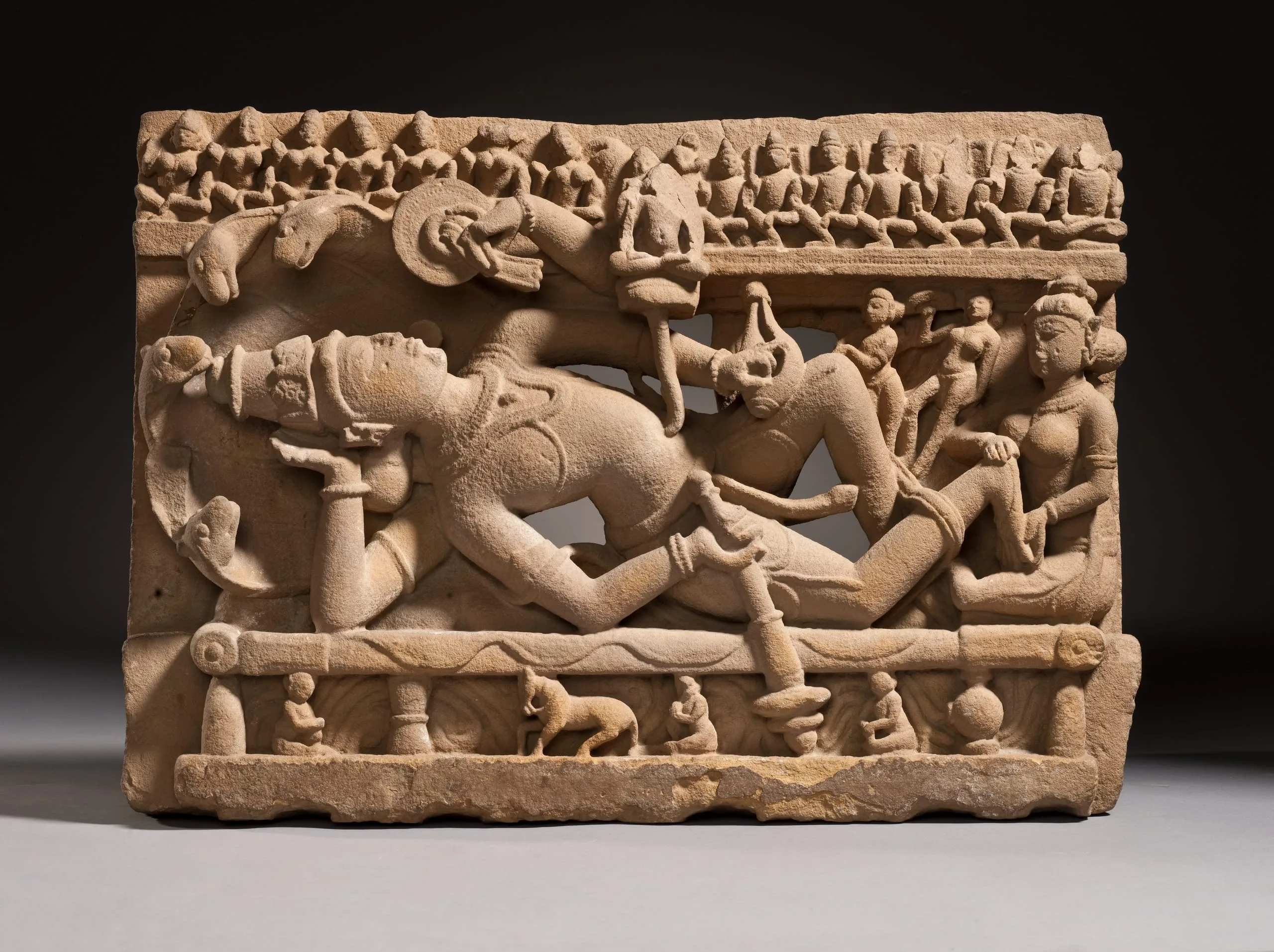 Vishnu, the Hindu God of Preservation, is asleep on the five-headed serpent named Ananta (Eternity) or Shesha (Remainder), who is atypically shown supported by a cot (charpoi) floating on the primordial ocean of milk. His wife Lakshmi is massaging his foot, thereby stimulating him to dream the history of the universe during each cosmic age (kalpa). Vishnu is crowned and has four arms. His upper right hand supports his head. His lower right hand holds his mace. His upper left hand holds his discus. His upper lower left hand grasps his conch. A now-damaged figure of Brahma, the God of Creation, sits on a lotus rising out of Vishnu’s naval. Seated along the top edge are the seven mother goddesses (sapta matrikas) on the left and the nine planetary deities (nava grahas) on the right. The planetary deities are represented from right to left, with the final divinity somewhat obscured behind Brahma. Beneath the cot are three seated figures, two vessels, and a horse. They likely represent Lakshmi, the divine physician Dhanvantari, the elixir of immortality (amrita), and a poison, all of which emerged from the sea with Vishnu’s help in a related myth, the churning of the milk ocean.
