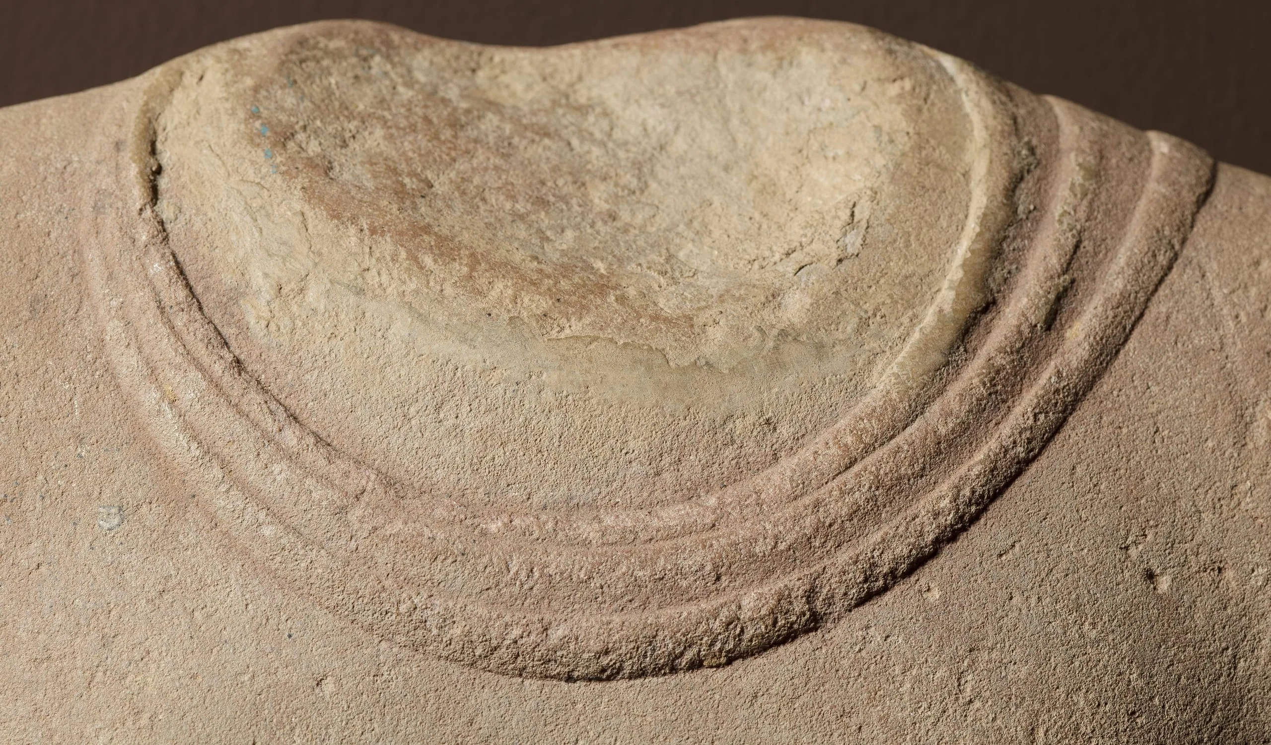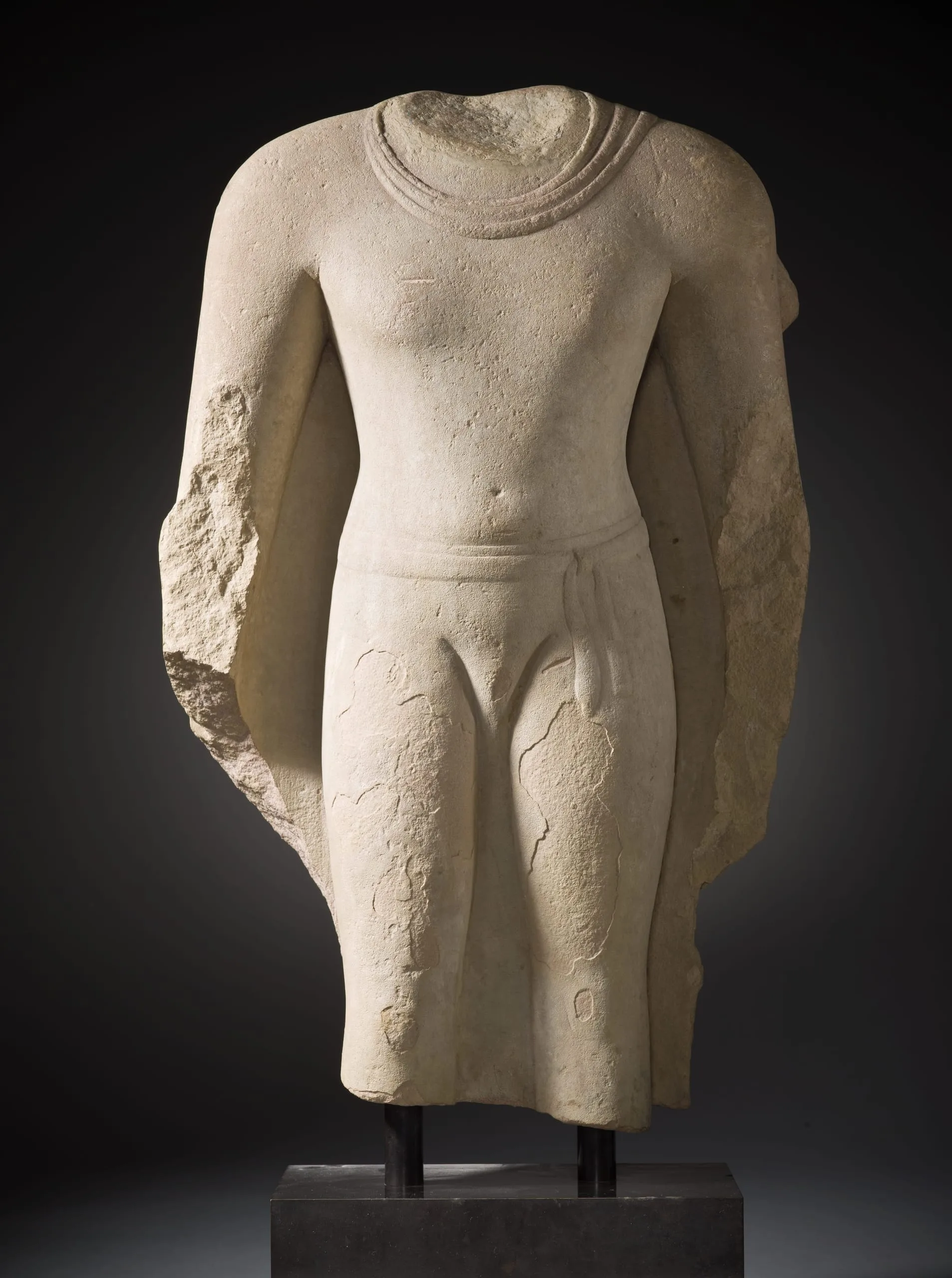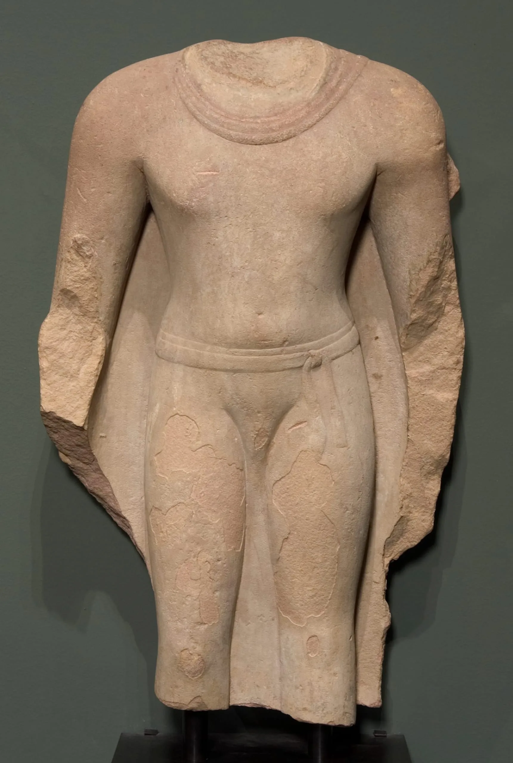 The sculpture is made of a distinctive pale grayish pink sandstone with black inclusion spots (quartz/quartzrose wacke). Known as ‘Chunar’ sandstone, it was used in the 3rd century BCE to make the highly polished edict pillars of the Mauryan King Ashoka and several extant early sculptures from Sarnath dating from the 3rd–1st century BCE, and myriad Buddhas from Sarnath dating from the 5th century CE. Formerly believed to be from the Chunar quarry in the Mirzapur District, it is now thought to be from the Pabosa (Pabhosa) quarry in the Allahabad District (Harry Falk 2006).