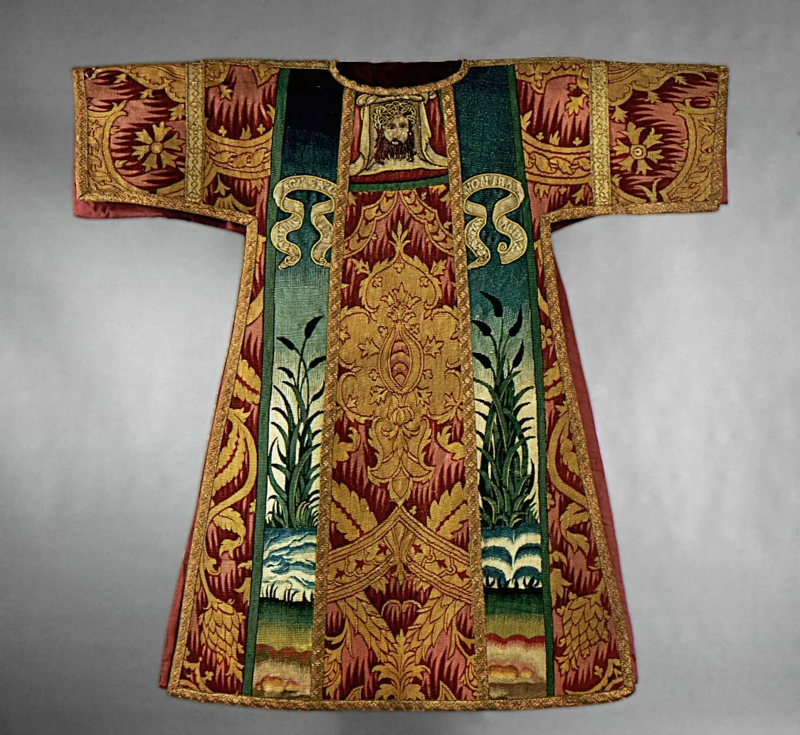 This message of salvation has been interpreted with technical virtuosity. The dalmatic is done in a flat tapestry weave, but its design imitates piled Italian velvets. The fabric panels also include embroidery accentuating details of the design, suggesting that this unusual combination of techniques was an effort to achieve a richness of surface normally associated with more costly imported textiles.