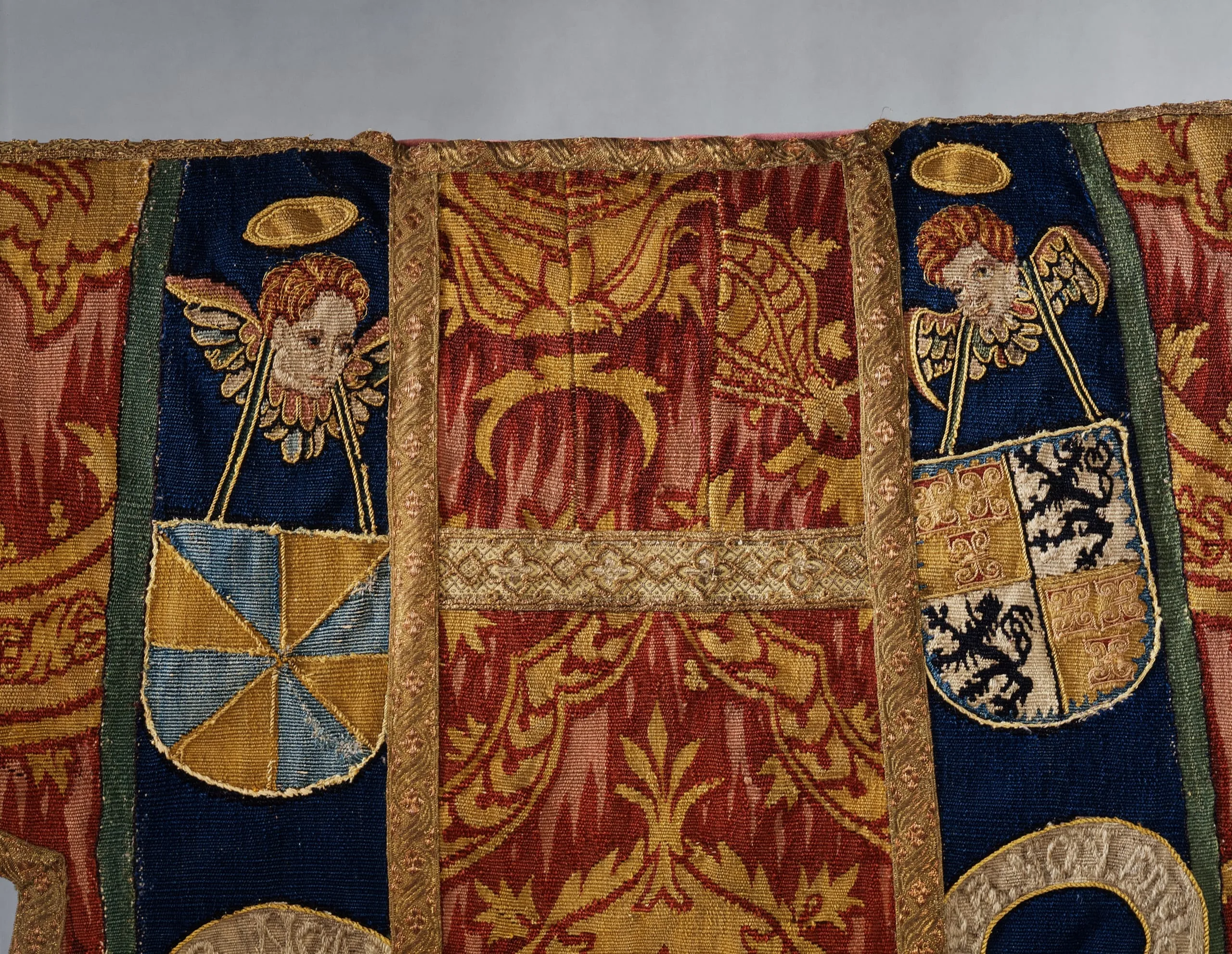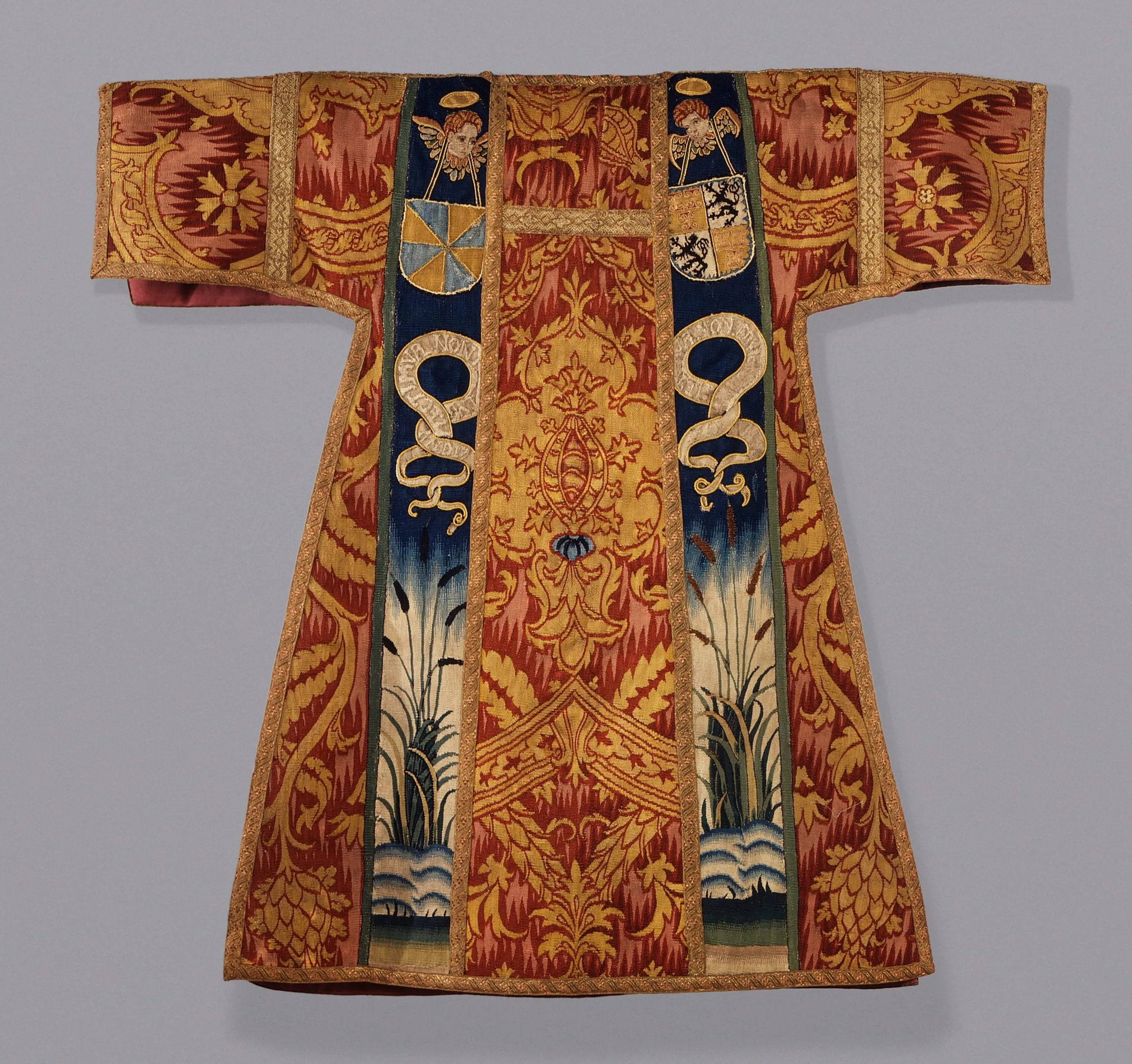 This robe bears the coats of arms of the Van Der Geer and Van Culenborch families of Utrecht, probably confirming that the set was commissioned for use in a private chapel, a timely decision in light of events. The biblical imagery is also fitting; the bulrushes rising above the waves allude both to the inscription and to Moses, who led the Israelites out of their bondage in Egypt.