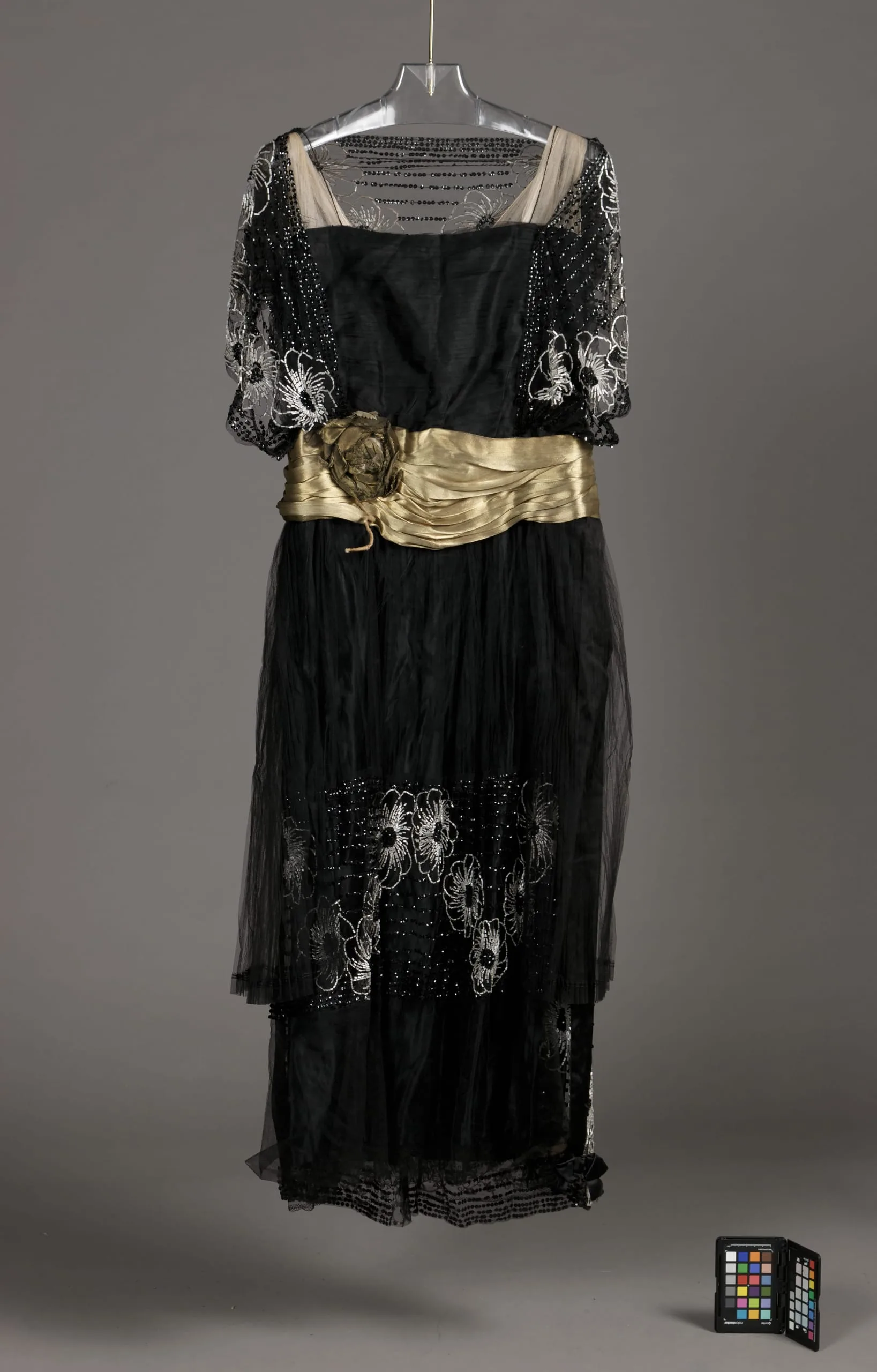 - Silk satin and silk net with metallic-thread and silk satin (lamé), glass beads, and plastic sequins