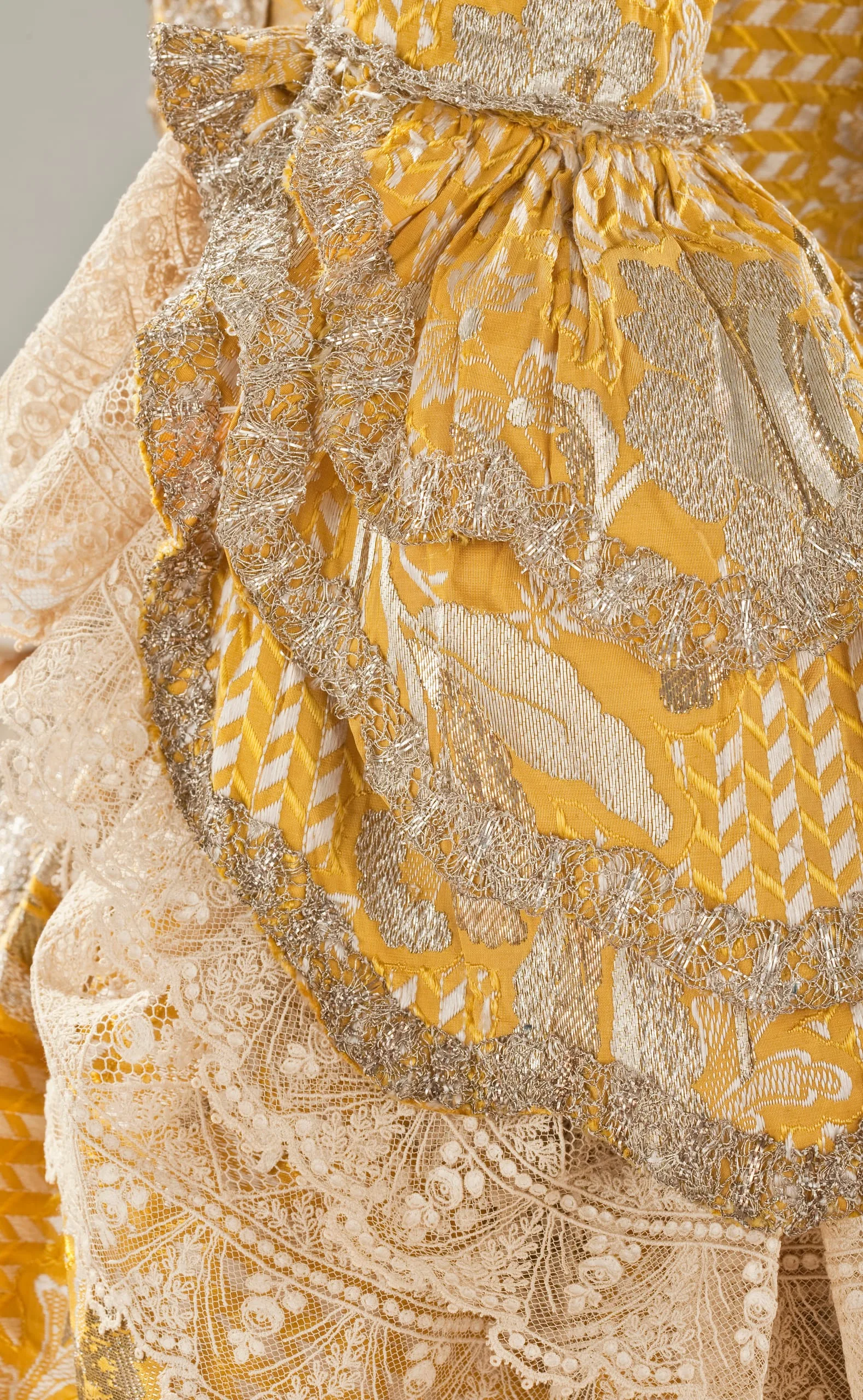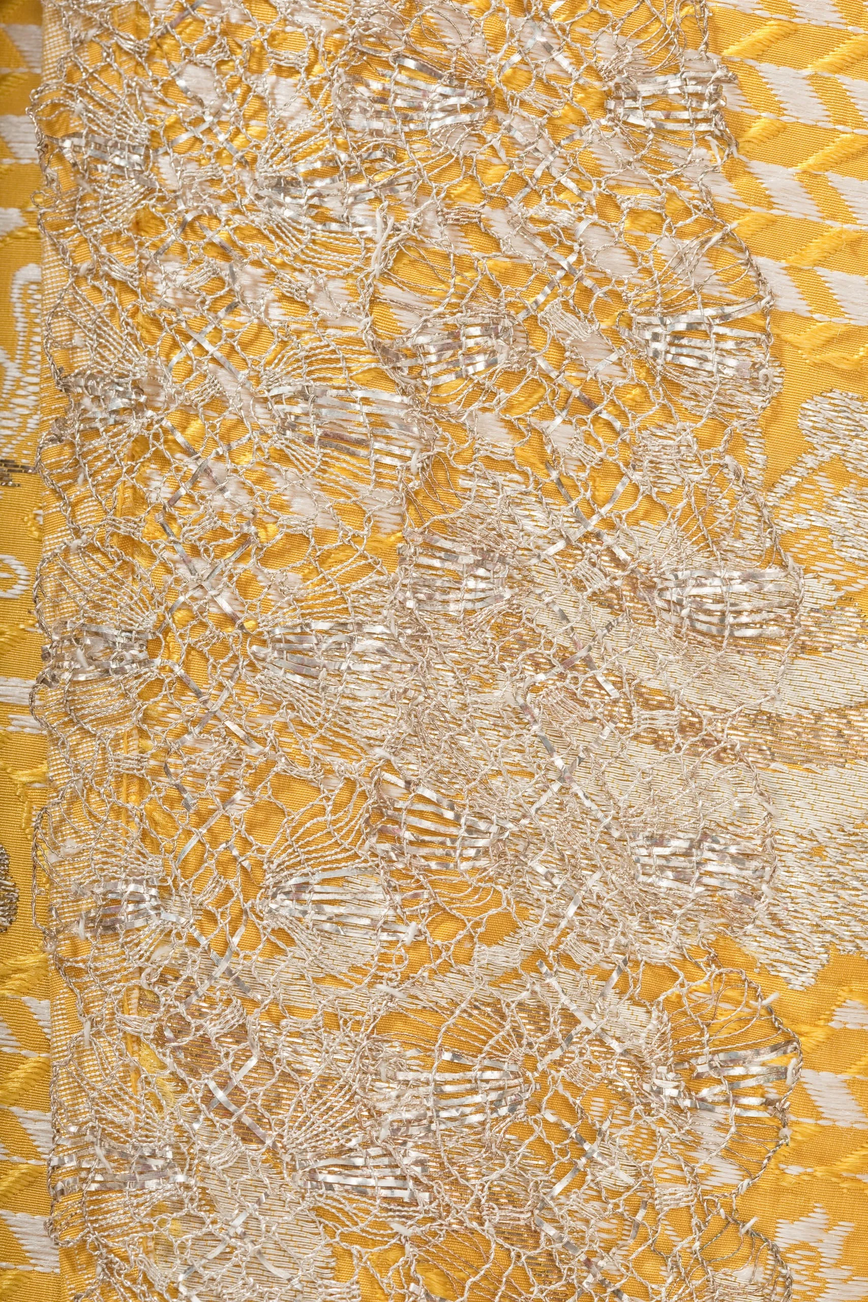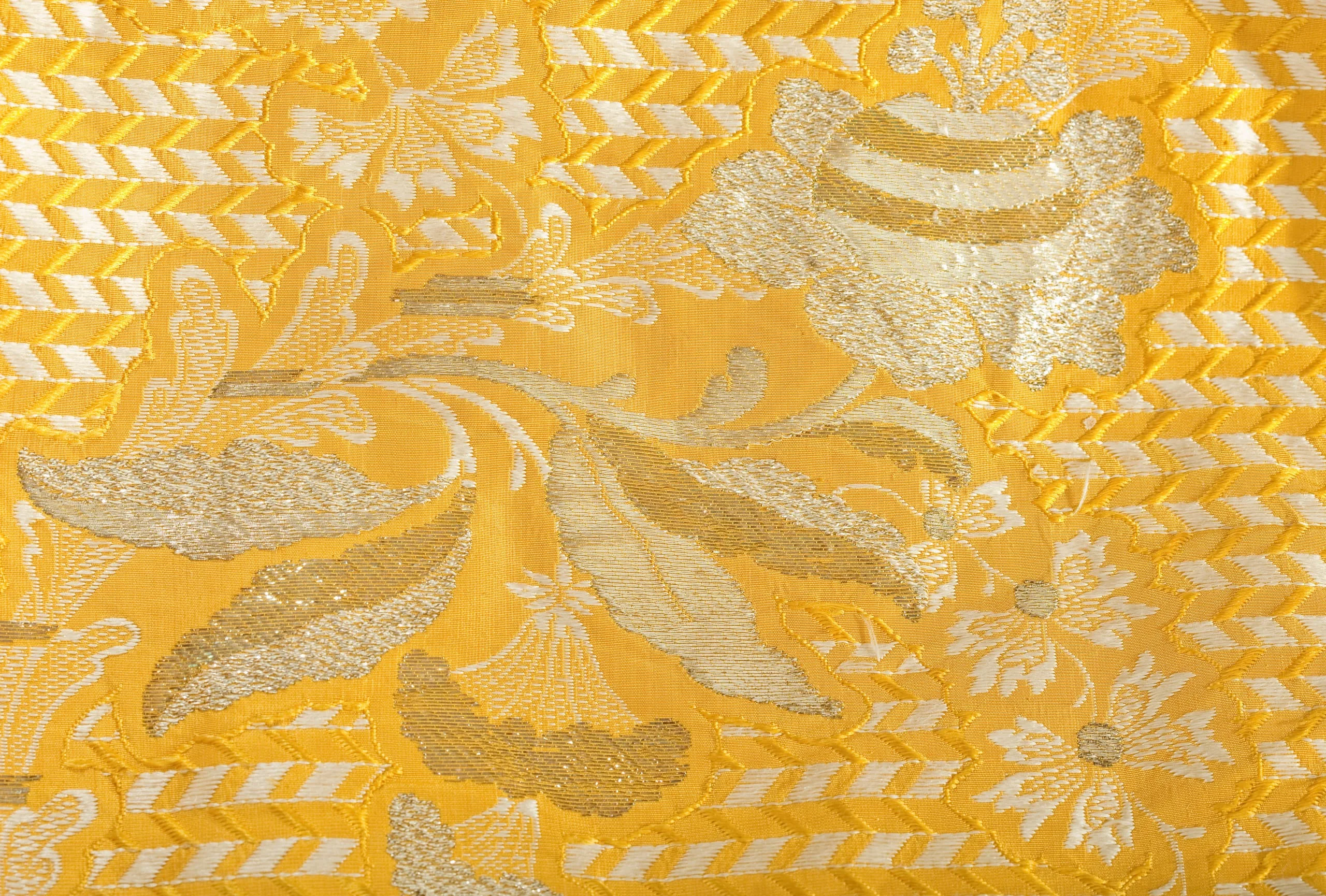 - Silk plain weave with weft-float patterning and silk with metallic-thread supplementary-weft patterning, and metallic lace