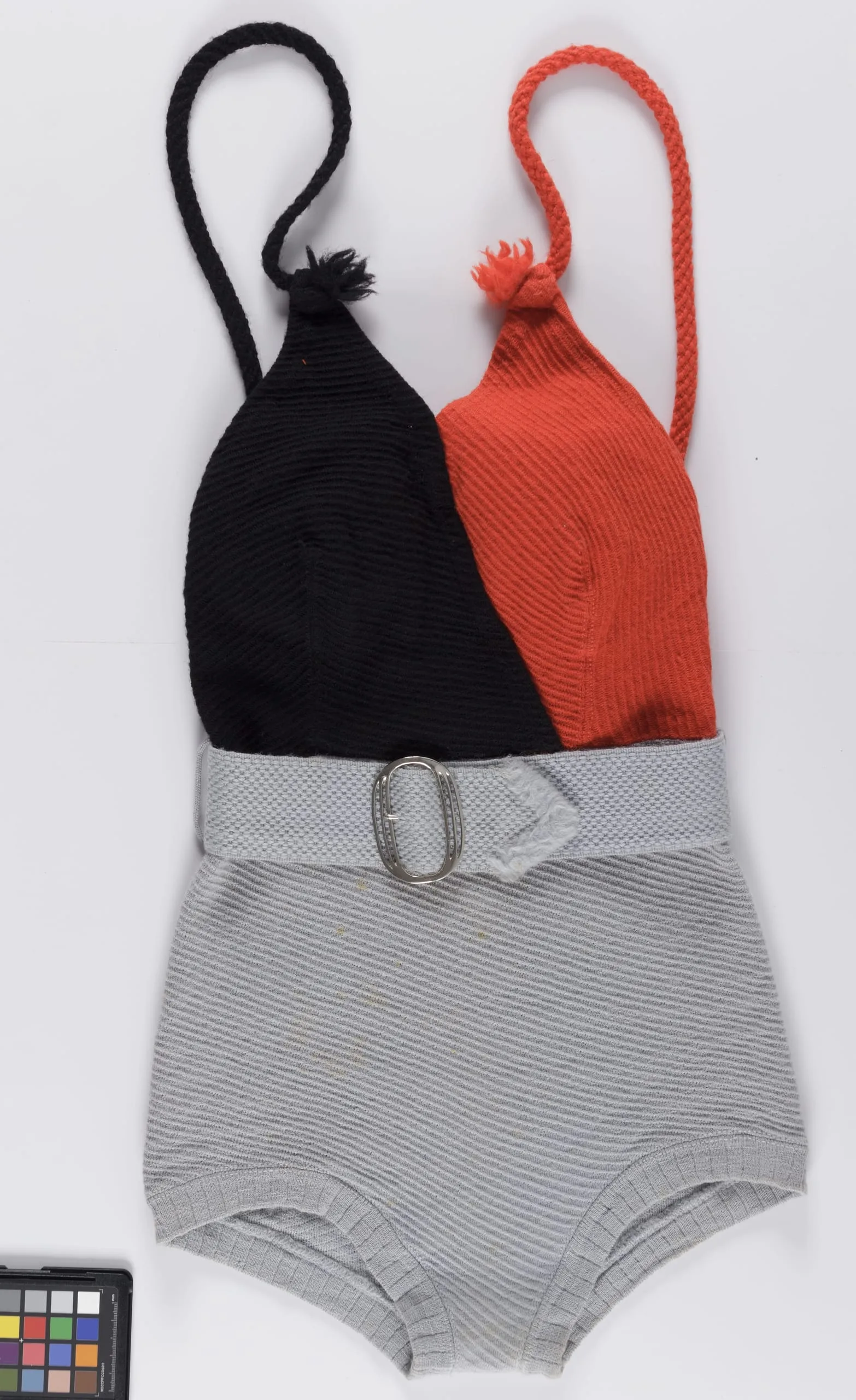 - Swimsuit: wool knit and wool braid; Belt: wool braid (webbing) and metal