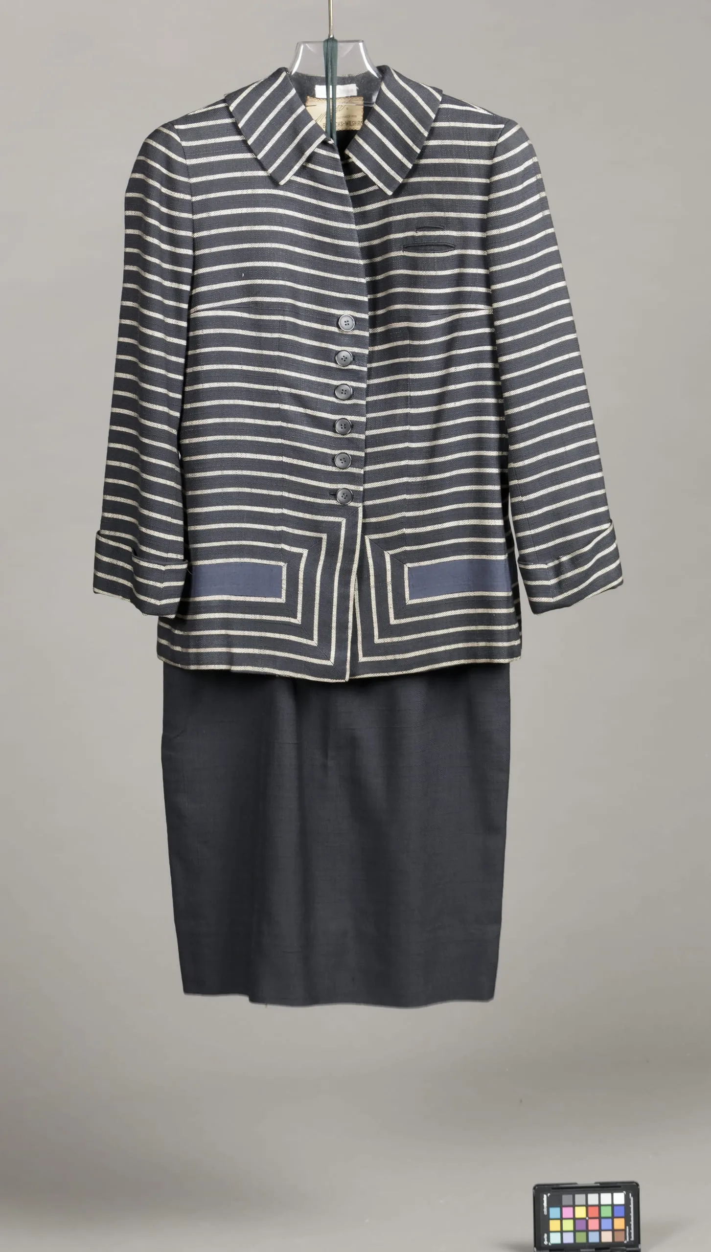 - Jacket: silk twill and silk plain weave with plastic buttons; Skirt: silk twill and silk plain weave