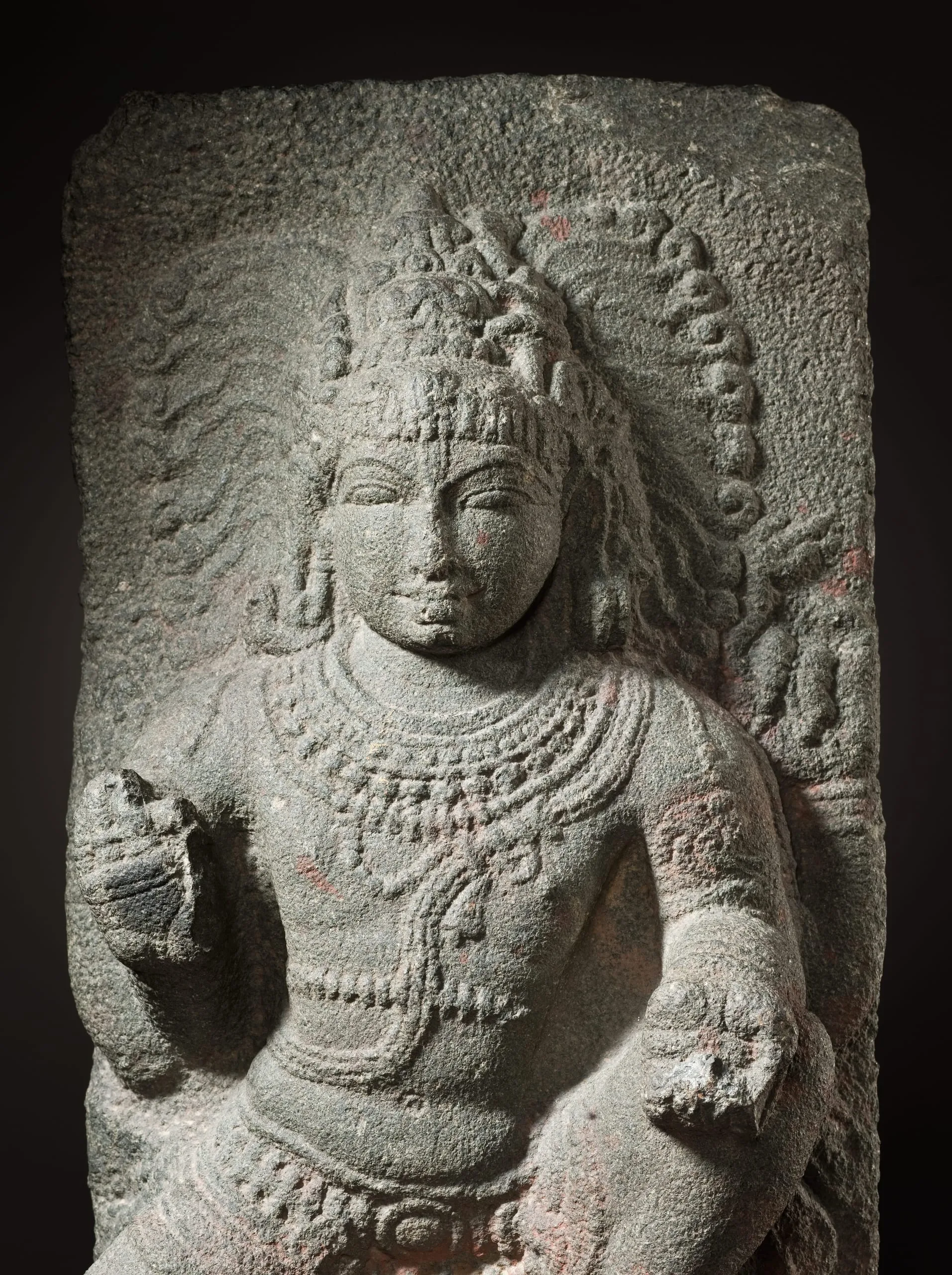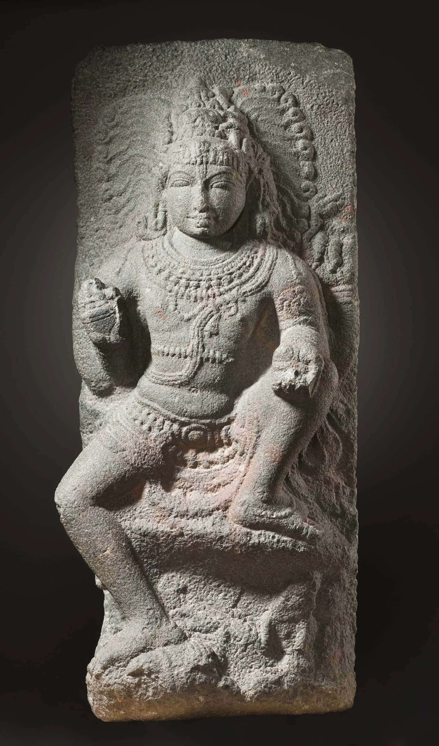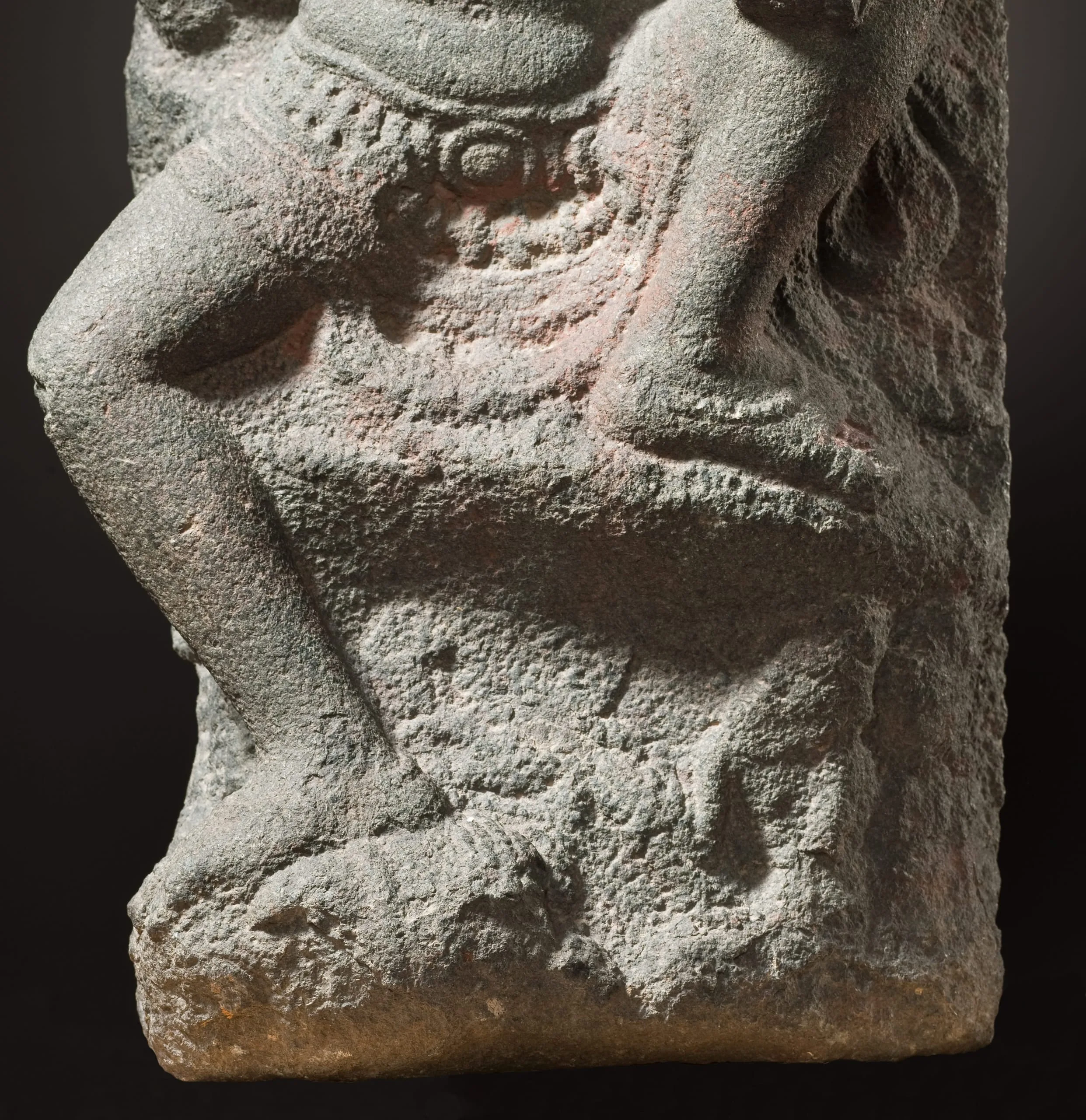 This is a representation of the Hindu god Shiva as the Supreme Teacher of yoga, music, and knowledge. This form of the deity is known in Sanskrit as Dakshinamurti (south-facing image) and is typically installed on the southern wall of a Shiva temple. He has an ascetic’s piled hair (jata mukuta) with his long locks streaming out to the side. He has a third eye of wisdom (jñana netra). He wears standard jewelry, including the Brahmanical sacred thread (yajñopavita) worn over his left shoulder. Shiva sits in a relaxed posture (lalita asana) with his right leg pendant and resting on the Dwarf of Ignorance (Apasmara Purusha). He has four arms. His lower right hand is held in a gesture of teaching (vyakhyana mudra). He holds a sacred manuscript (sutra) in his lower left hand. Although difficult to discern due to weathering, his upper left hand may hold a flaming torch and his upper right hand may hold a serpent or rosary. Two bearded sages on the right side of the base represent the audience to which Shiva imparted his divine wisdom. See also M.76.98a-b.