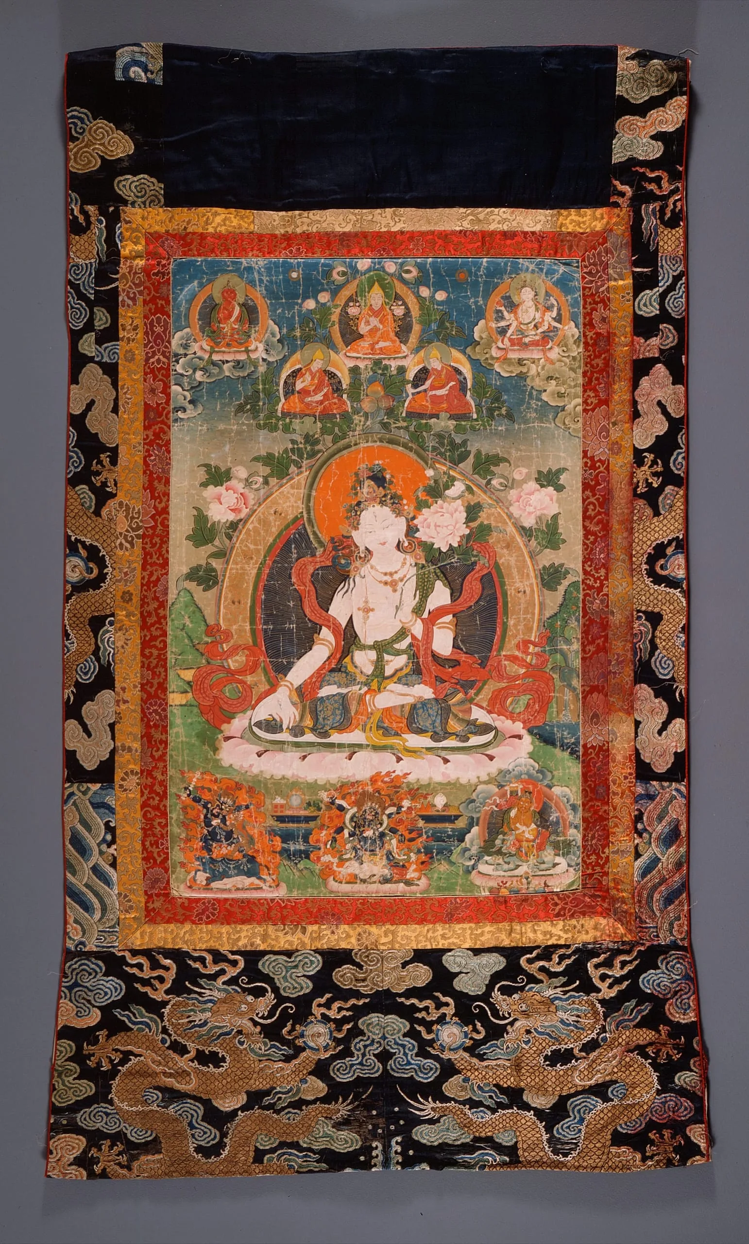 The goddess is appropriately white-skinned and has lush flowers in her hair tied in a bun. She has a third eye and a small forehead image (bimba) of the Jina Buddha Amoghasiddhi. She has a white lotus in her left hand, and her right hand is extended in the gesture of charity (varada mudra). The palms of both hands are graced with an eye symbolic of her omniscience. She is seated in the meditation posture (padma asana) on a lotus base. Behind her is an elaborate aureole (prabhavali) and nimbus. She wears rich jewelry and exquisite textiles. Above her is a triad of Buddhist monks, Tsongkhapa (circa 1357-1419) and his two principal disciples, of the Gelug school wearing their renowned yellow hats. In the upper left corner is the red-skinned Amitayus, while the multiarmed goddess Ushnishavijaya is in the upper right corner. Below Sita Tara are the protective deities from left to right, Yama (see M.71.78), Mahakala (see M.81.90.4 and M.85.293.2), and Kubera or Vaishravana (see M.69.13.8 and AC1992.204.1a-b). The painting is mounted in embroidered silk brocades with imperial five-clawed dragons (see M.2010.81.3).