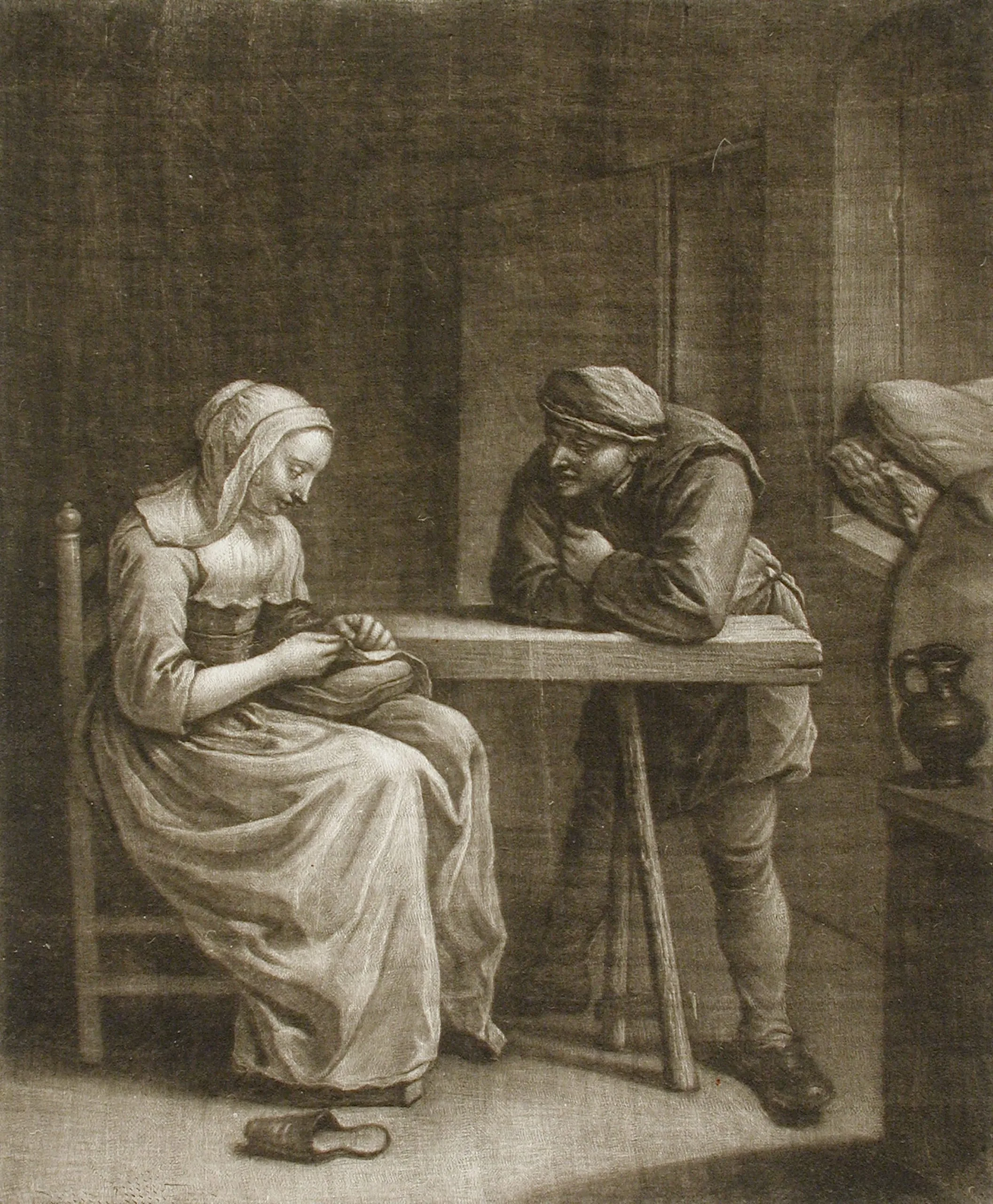 - Man Leaning on Table Watching a Woman Sew