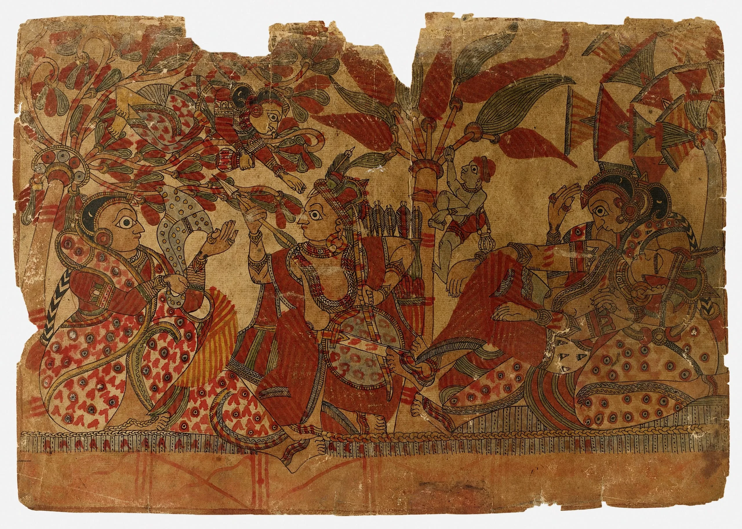 - Subhadra and Abhimanyu Converse as Ghatotkacha Lies Unconscious, Scene from the Story of the Marriage of Abhimanyu and Vatsala, Folio from a Mahabharata ([War of the] Great Bharatas)