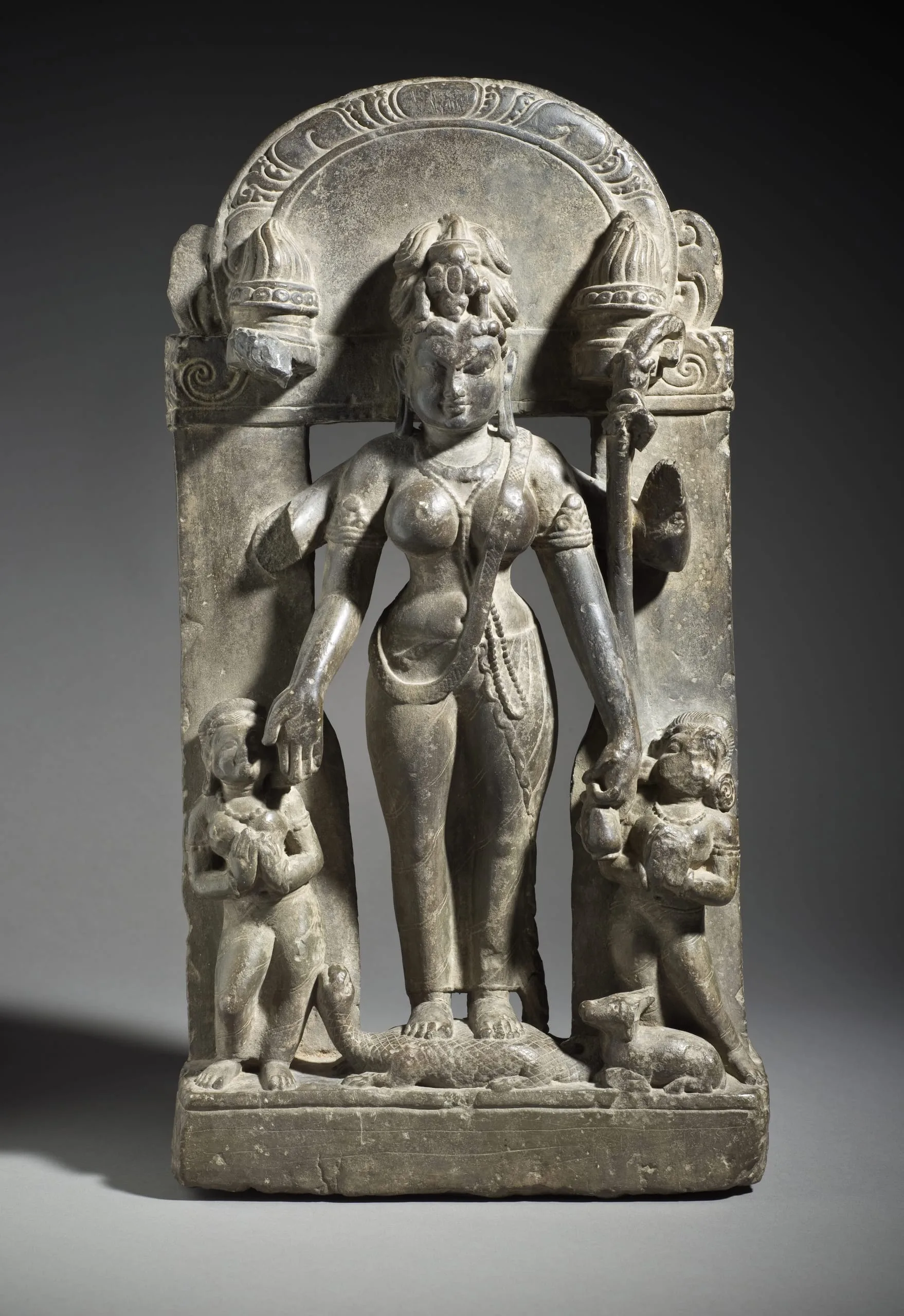 The Hindu Goddess Gauri, an epithet of Parvati, is identified by the iguana (godha) upon which she stands. Her ascetic nature is expressed by her piled hair (jata mukuta) and distended earlobes. She wears an ascetic’s sash (yoga patta) across her left shoulder, a long pearl necklace, and armlets. She has four arms. Her lower right hand is held in the gesture of charity (varada mudra). Her lower left hand holds an ascetic’s waterpot (kamandalu). Her upper left hand holds what appears to be a shepherd’s crook, while her upper right hand is now missing. The goddess is flanked by two worshiping attendants. On either side of her head are two flaming torches (agni kunda). Their presence refers to when the Goddess Uma undertook severe austerities, including meditating while surrounded by five fires (pancha agni or pancha tapas), to lighten her dark complexion. Thereafter, she was known as Gauri (Fair One). See also AC1992.209.1.