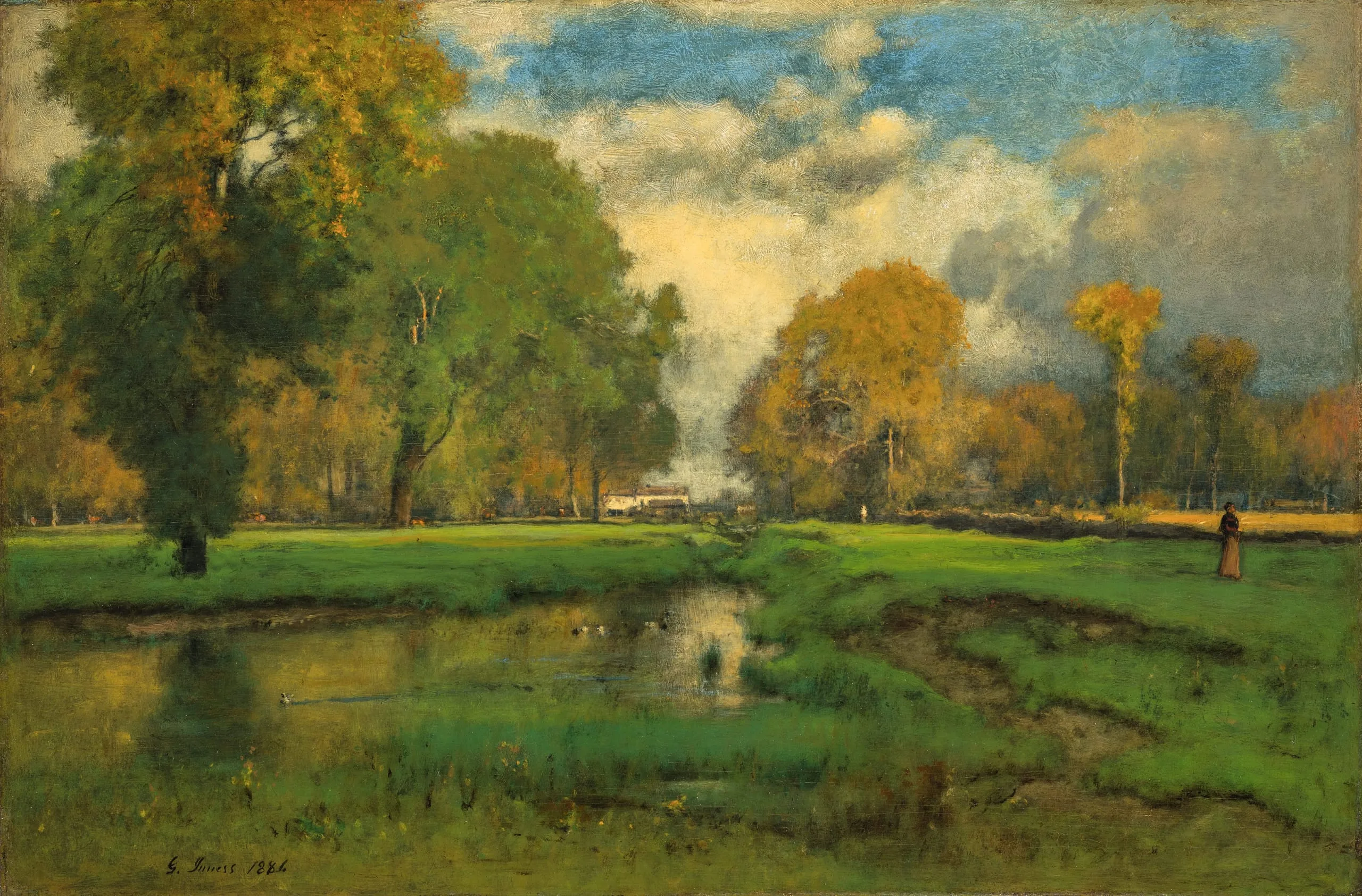 The painting’s very deliberate structure was advanced for 1882 and even 1886 and may be considered among the earliest works organized according to such a conspicuously geometrical scheme. It is cut into equal quadrants by the horizon halfway up the picture surface and the central vertical line of the gap in the trees and its corresponding reflection halfway across the surface. The trees are arranged at measured intervals to add a rhythm to this balance. It is noteworthy, however, that Inness shortened the tall tree on the right, perhaps to avoid the monotony of too close a symmetry.