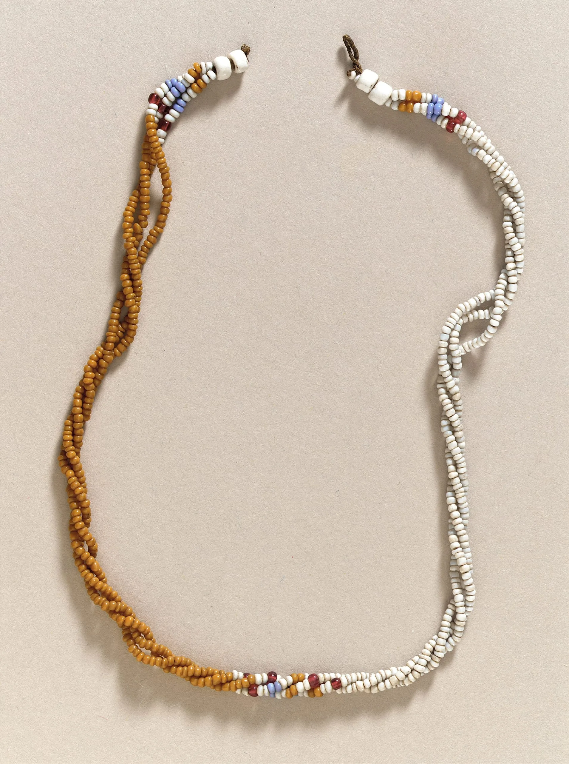 Beaded necklace with two twisted strands — one honey-amber, one chalk-white — with multicolored accent beads near a small metal clasp