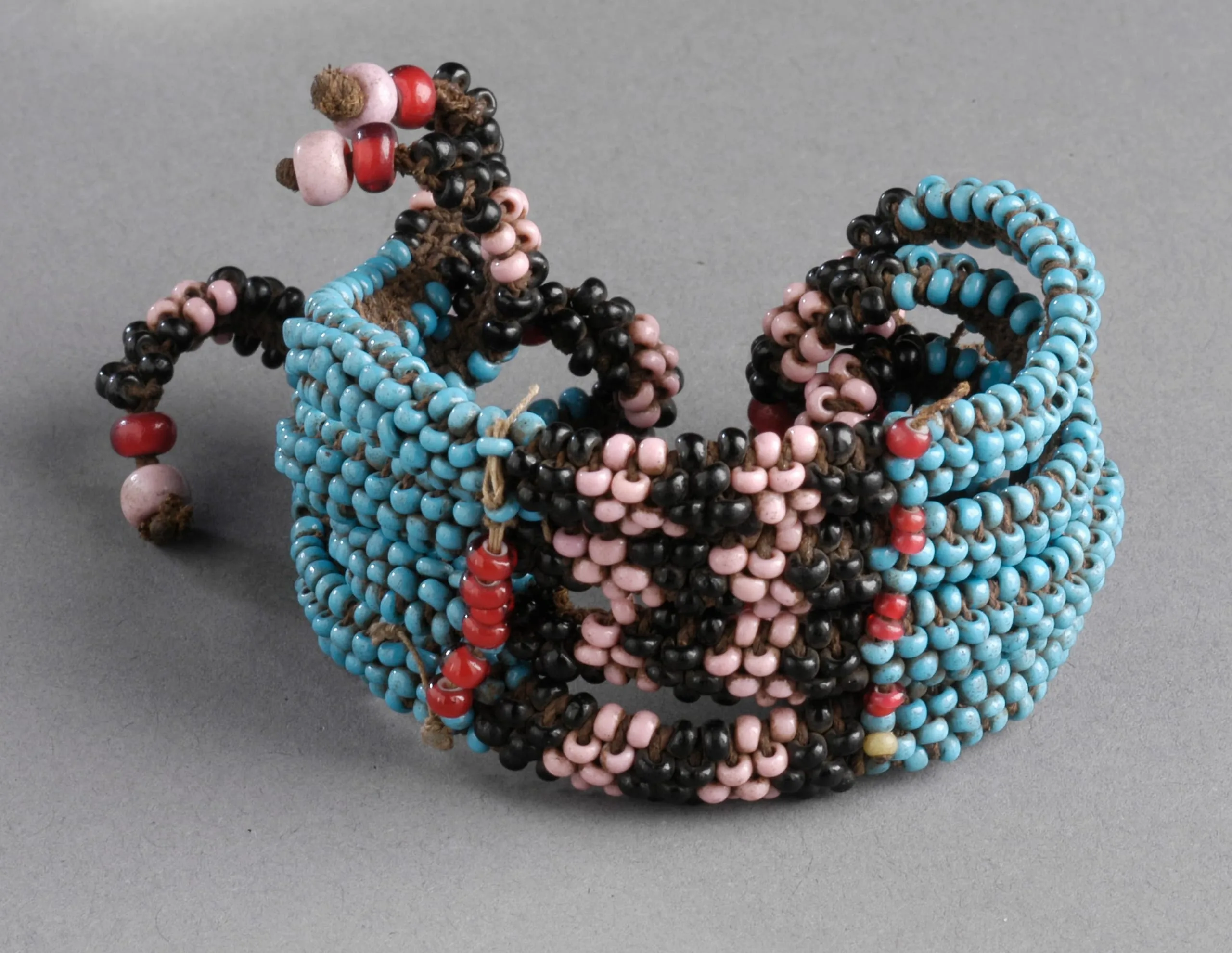 Beaded cuff bracelet with wide band of turquoise blue seed beads bordering a black and pink geometric pattern, with red bead dangles along the lower edge