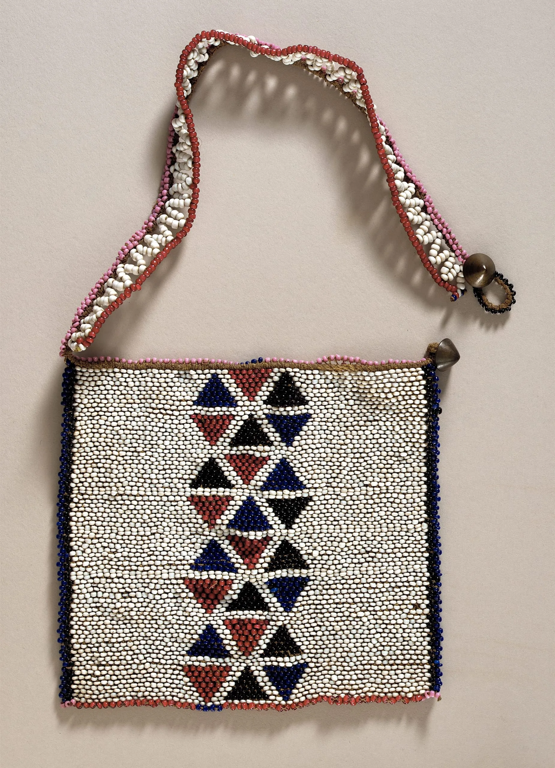 Beaded bag with white ground and central column of cobalt blue and dusty rose triangles, beaded strap with pink and red borders, and small metal bells at upper right corner