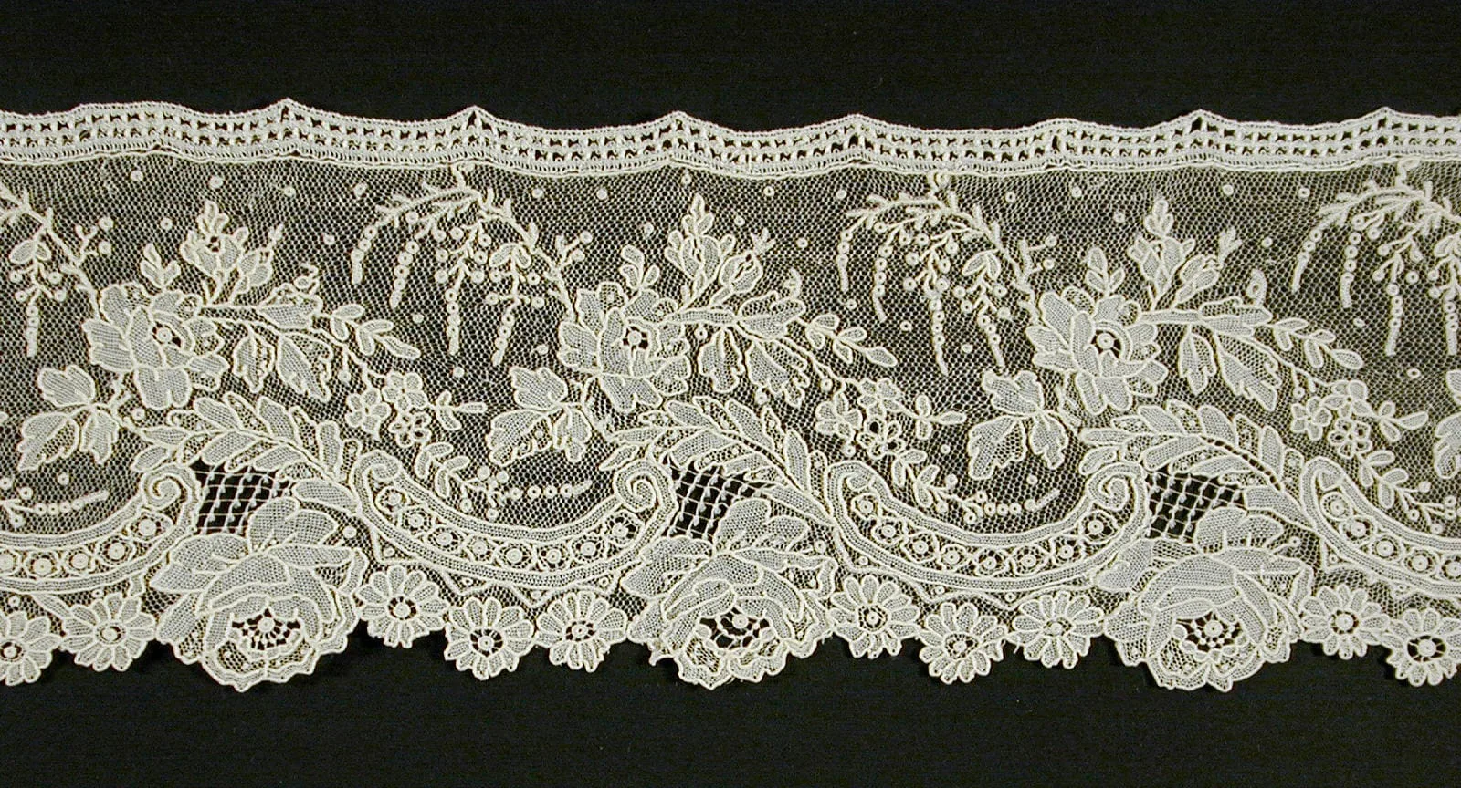 Horizontal strip of ivory needle or bobbin lace with a scalloped lower edge, worked with a continuous floral and vine pattern on a fine net ground