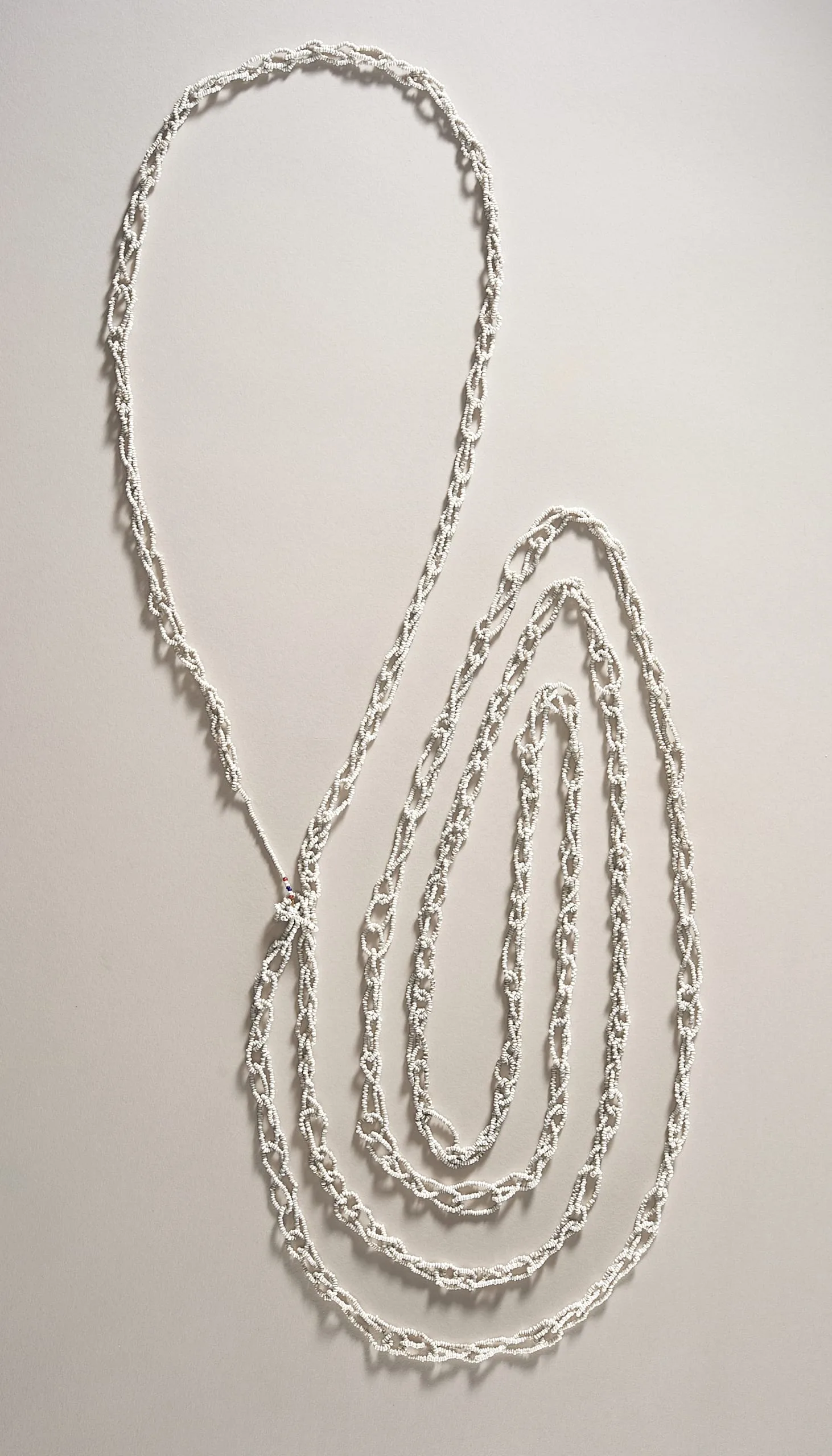 Long braided or twisted white and silver chain arranged in two overlapping oval loops against a pale gray wall, with nested concentric strands in the lower loop