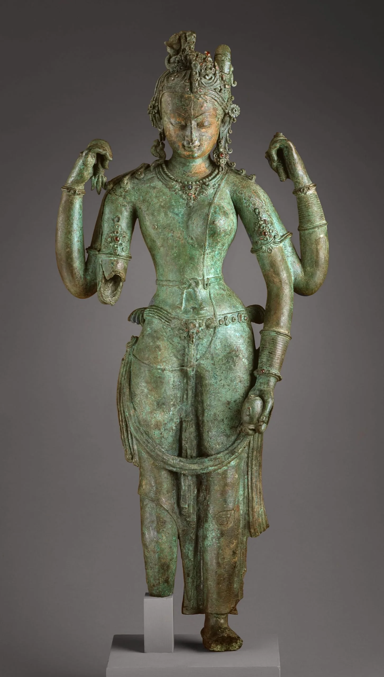 The gods of the Hindu pantheon are considered to be timeless and unaging beings. They are often represented with a lithe, feminine grace, which permitted the artist to join this figure's distinctly male and female halves with minimal disorientation. Uma has a wide hip and prominent breast; Siva is more angular, his waist less sharply curved. His knee-length roman dips gracefully downward to become Uma's ankle-length garment. His matted locks are piled high in contrast to Uma's elegant coiffure. Balancing these carefully delineated distinctions, the three surviving arms have similar slender, rounded shapes. A strong vertical ellipse, described by the shoulders, lowered arm, and the sash slung across the lower legs, unites the composition. A second ellipse, suggested by the two raised arms, with its apex at the brow, overlaps and encompasses the first. These circumferences reveal themselves slowly, encouraging an unhurried meditation on the smooth, curved forms and reinforcing the sense of cosmic unity the image is intended to convey. Its sense of calm and balance shows the influence of Indian Gupta art.