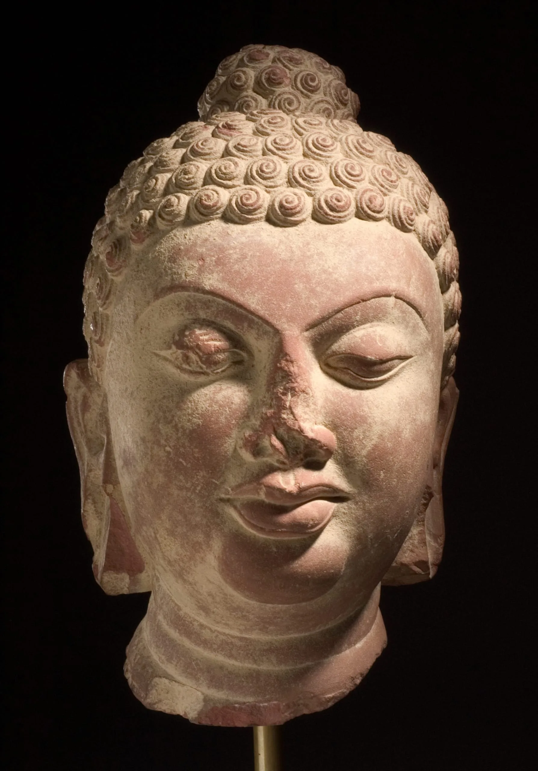 This is a classic representation of the Buddha Shakyamuni’s head made in Mathura, Uttar Pradesh, in circa 450 during the mature stylistic phase of the Gupta Dynasty (319-467 CE). Although it is the same subject as the earlier Buddha head made during the Kushan Dynasty (circa 30-375) in circa 150-200 (M.69.13.9), its physiognomic iconography exhibits the evolved artistic and theological preferences of the Gupta era. Rather than the earlier image’s open eyes staring straight ahead to engage the devotee, the later work’s eyes are half shut and look downward to convey his inner contemplation and compassion. Both depictions feature empty distended earlobes representing his renunciation of the material world. Each head has a cranial protuberance symbolizing the Buddha’s omniscience and enlightened insight, but the Gupta head has crisp snail-shell curls in place of the topknot and otherwise nondescript cropped hair of the Kushan head. The later head’s countenance has fuller, more sensuous lips than the thinner pursed lips of the earlier head. Finally, the circular sacred marking (urna) on the Kushan head’s brows is absent on the Gupta visage.