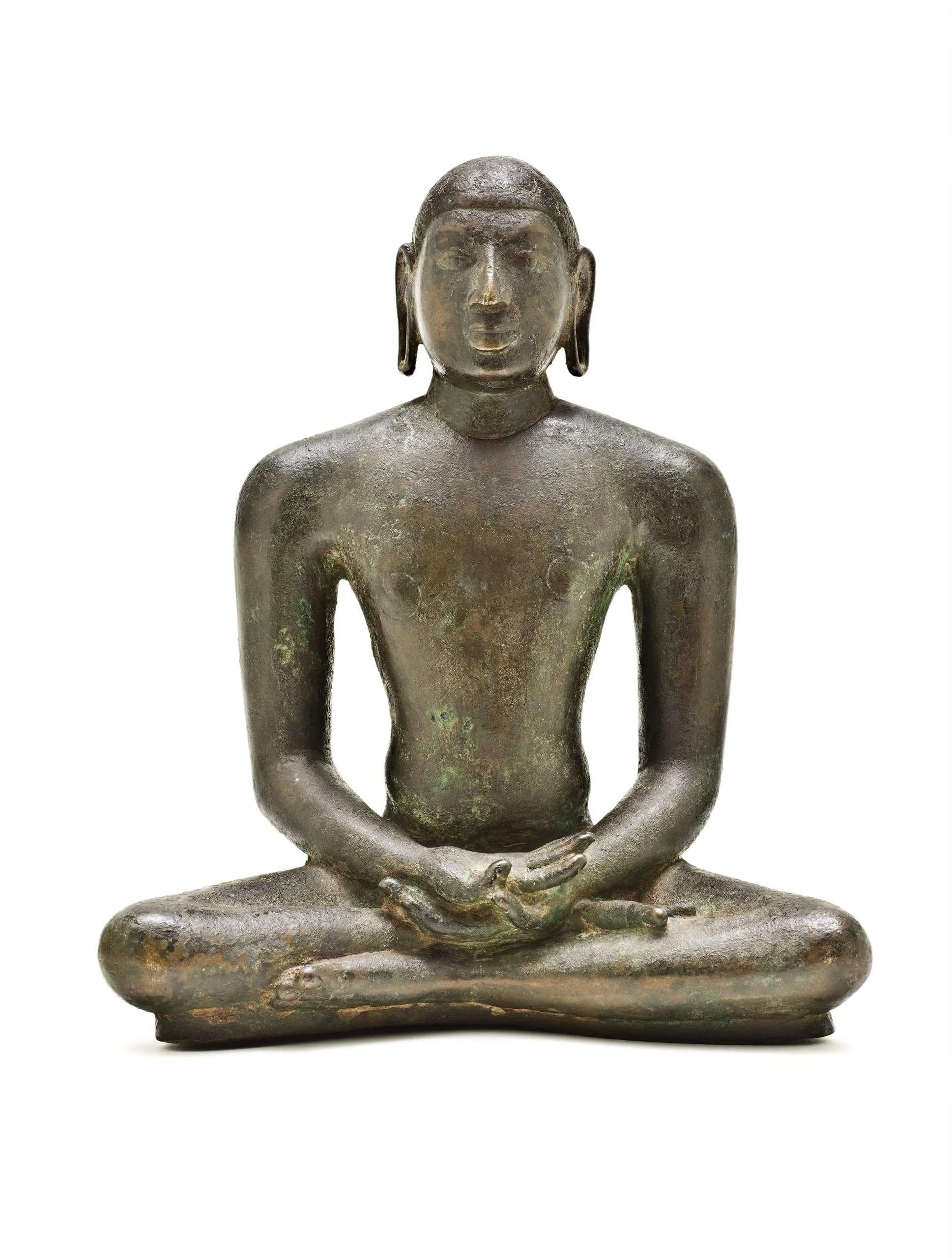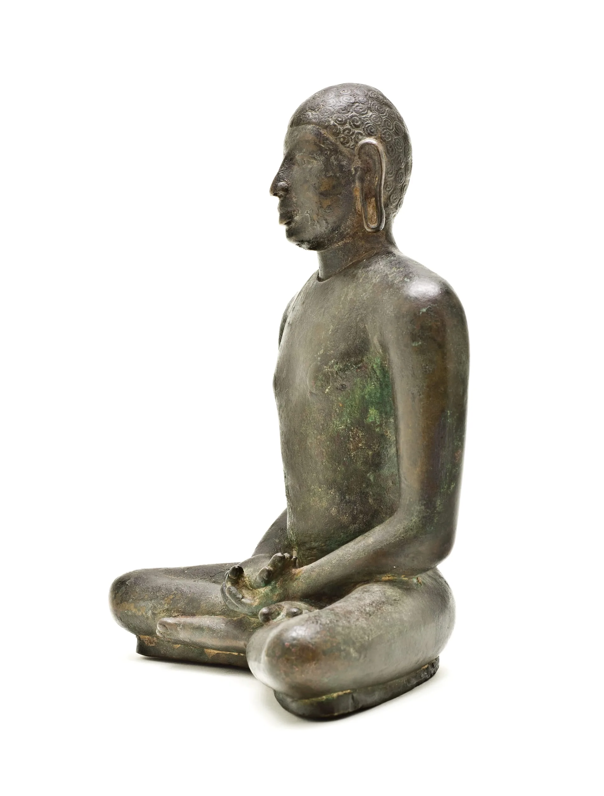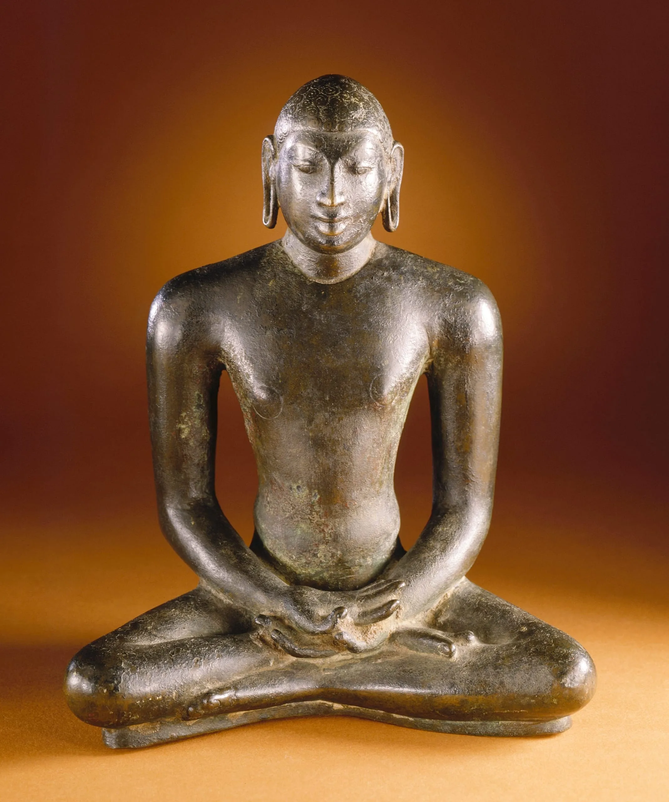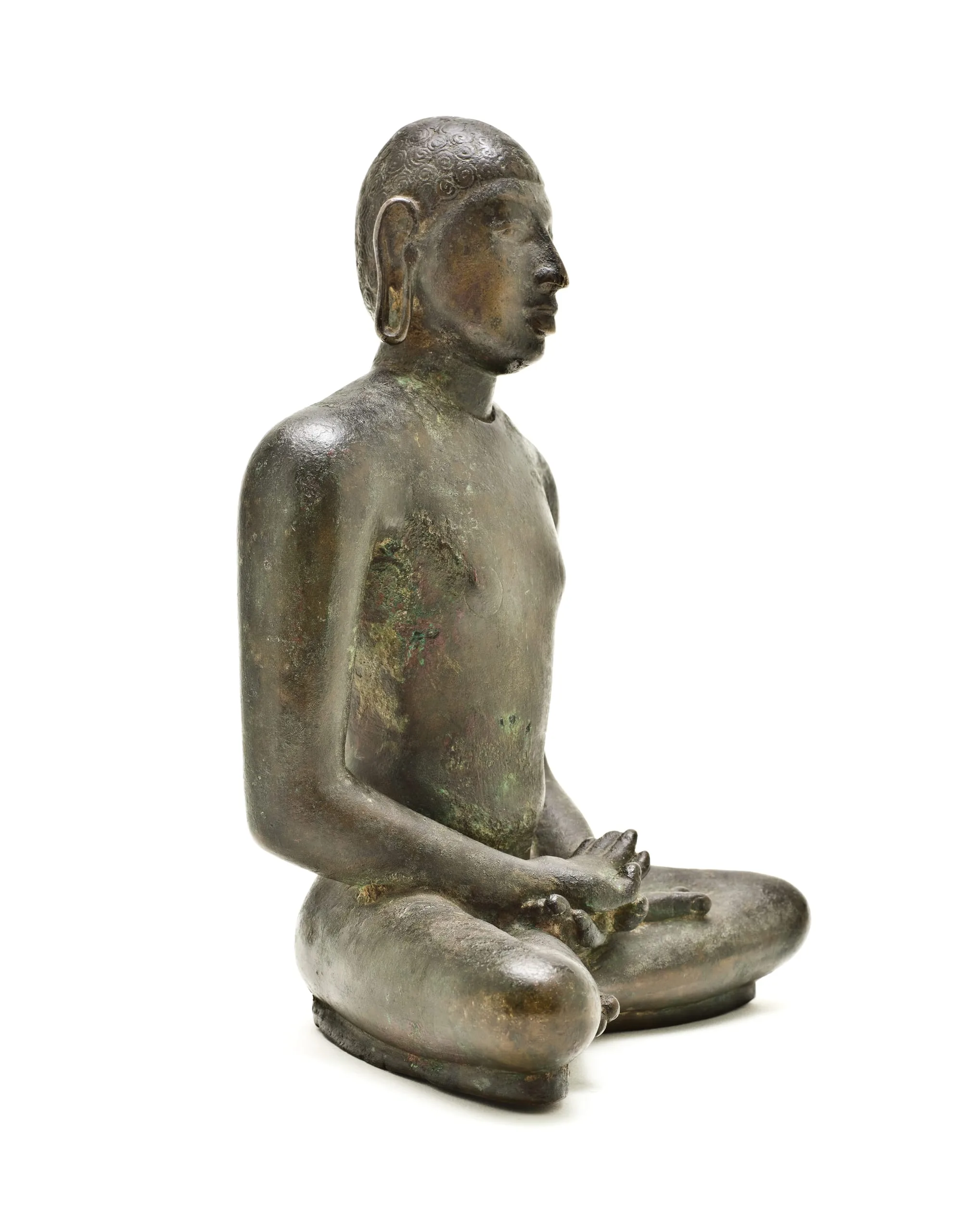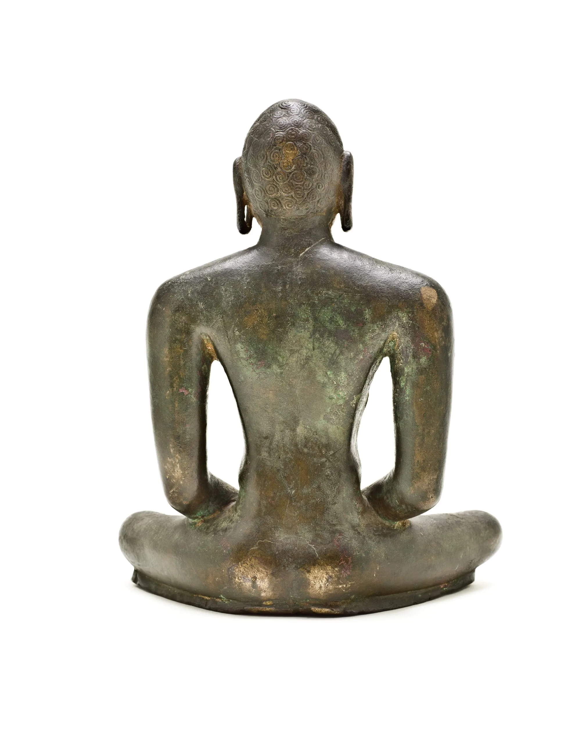 Jina Mahavira (circa 599-527 BCE) was born a prince of the Lichchhavi clan of Vaishali, Bihar. He became the 24th Jain savior (Jina or tirthankara [‘forder’ between the phenomenal world and enlightenment]). Conceived as an ideal yogi, the Jina gazes serenely while seated in the meditation posture (dhyana asana) with his legs crossed beneath him and his hands laid on top of one another in his lap (dhyana mudra). He has short snail curl hair and distended earlobes, both symbolizing his renunciation from the princely realm when he previously had long locks and wore heavy golden ear ornaments. This representation of Jina Mahavira depicts him totally naked in accordance with the rules of the Digambara (‘sky-clad’) Jain order. This sectarian affiliation is corroborated by the atypical depiction of the Jina’s genitalia on the underside of the sculpture.