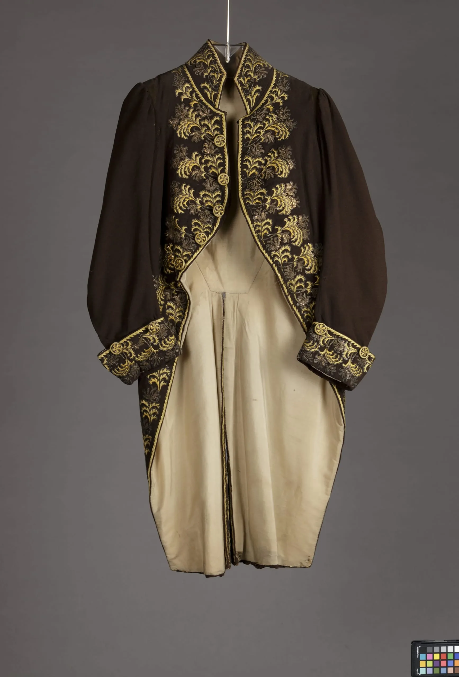 - Wool plain weave with silk embroidery, metallic-thread embroidery, and metal sequins