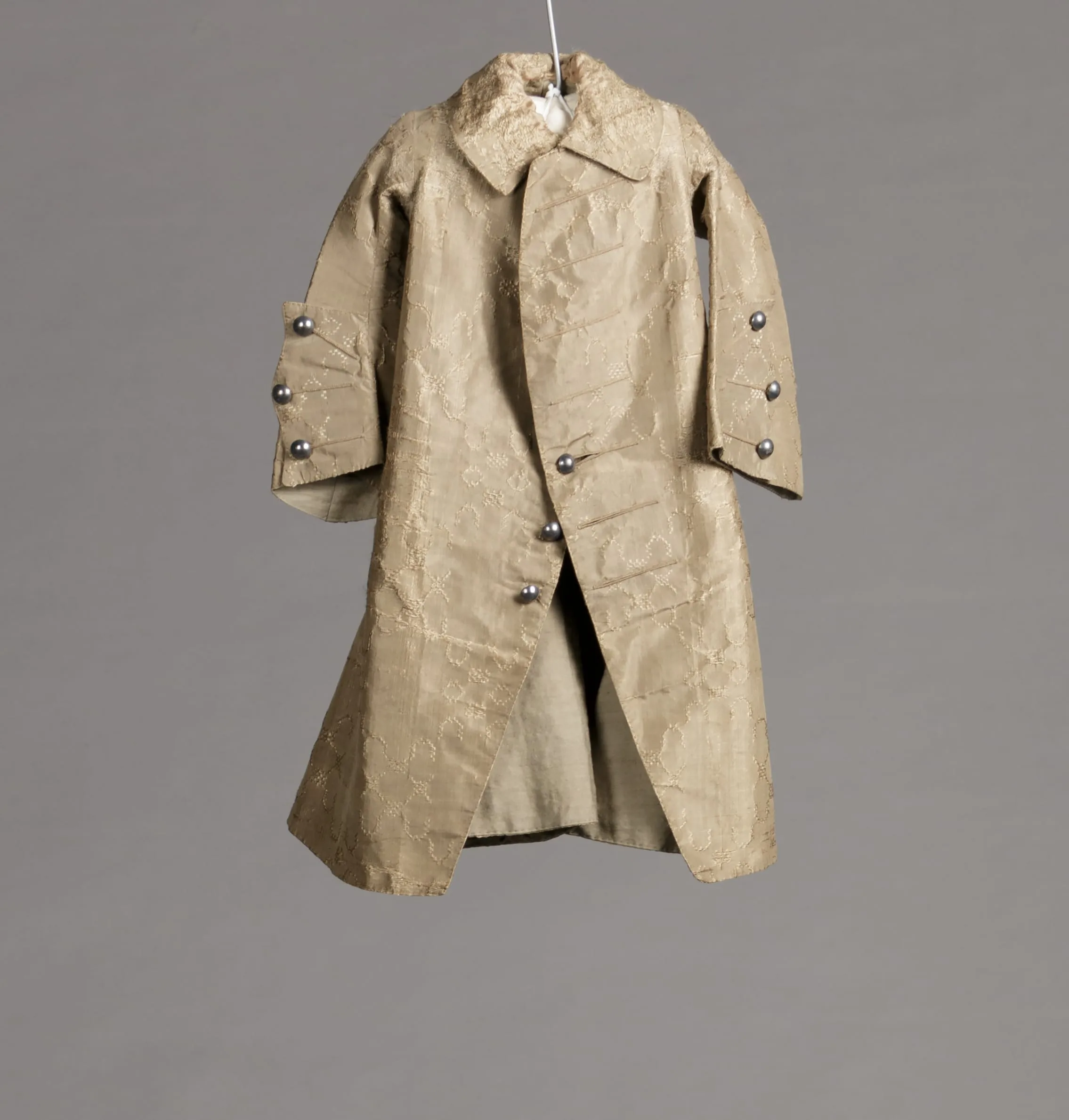 - Silk plain weave with supplementary weft patterning and metal buttons