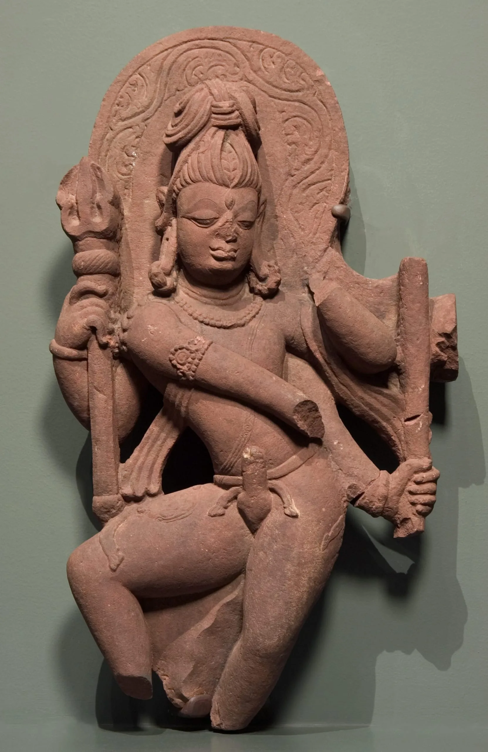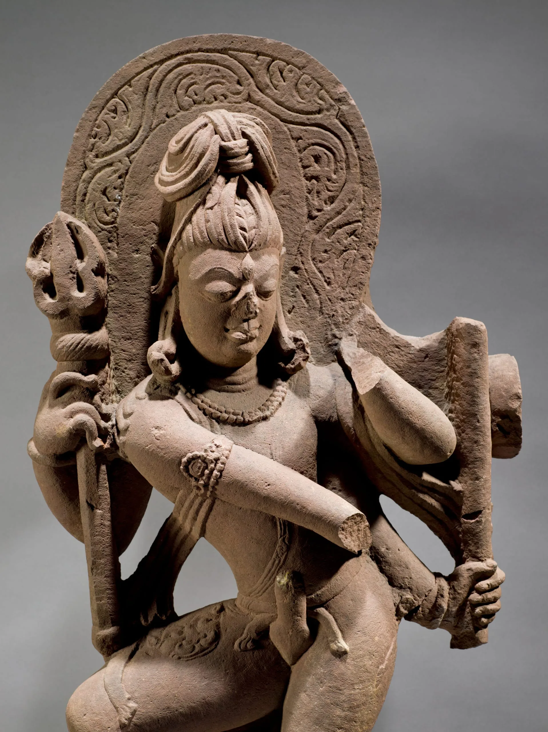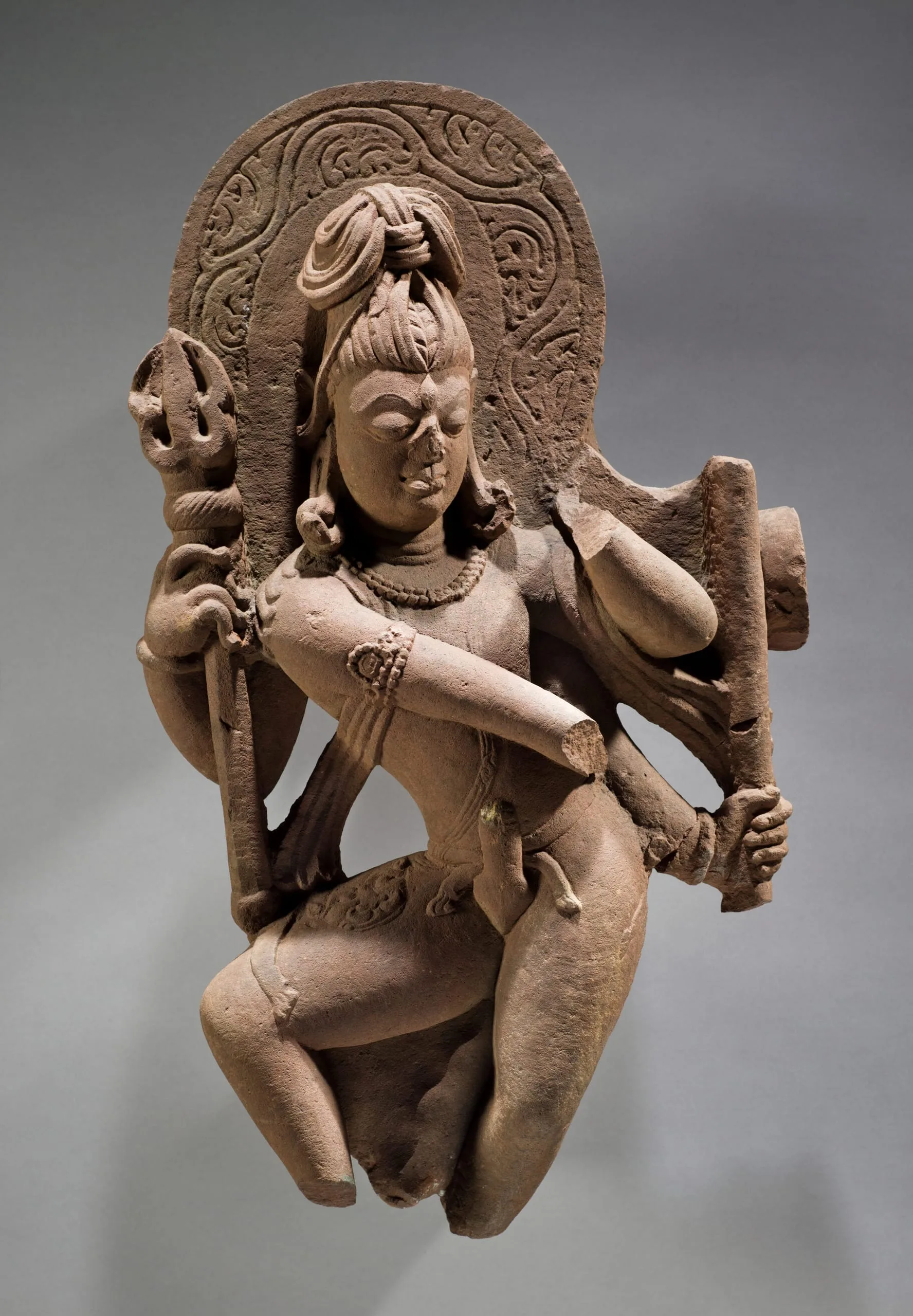 Shiva is nimbate and has an ascetic’s piled hair (jata mukuta) and a third eye of wisdom (jñana netra). He wears an ascetic’s sash (yoga patta) worn across his left shoulder and a tiger skin over his right thigh. He has four arms. In his upper right hand, he holds a trident (trishula). It is upper left hand, he holds a now-broken ‘cot’s leg’ ritual staff once topped with a skull (khatvanga). His lower right arm extends across his body. It’s now-missing hand likely displayed the ring gesture (kataka mudra) often used to hold a flower. It also grants fearlessness to his devotees. His now-lost lower left hand raised to the shoulder probably once displayed the gesture of exposition (chin mudra). Shiva is ithyphallic (urdhva linga) symbolizing the generative energy of the universe.