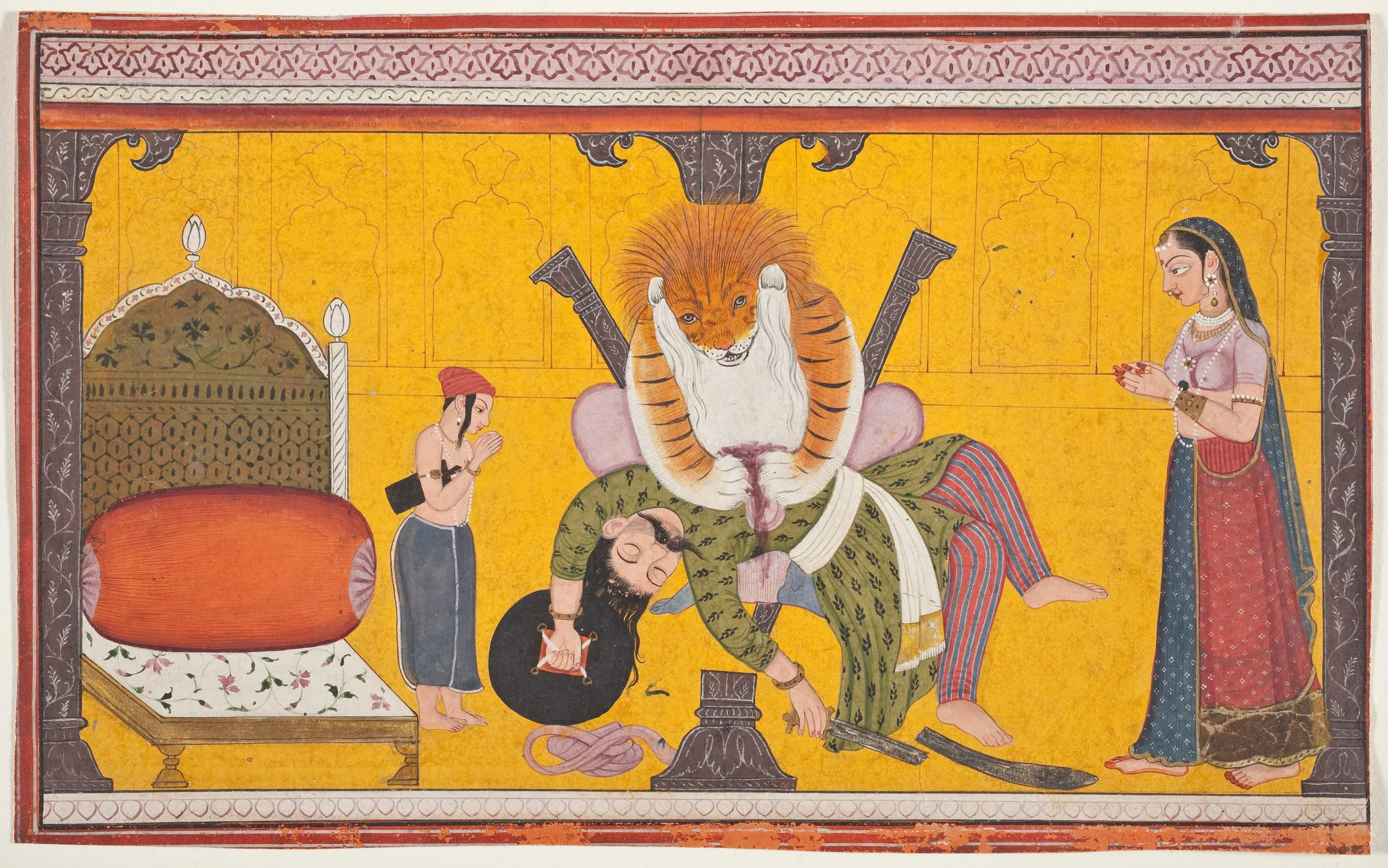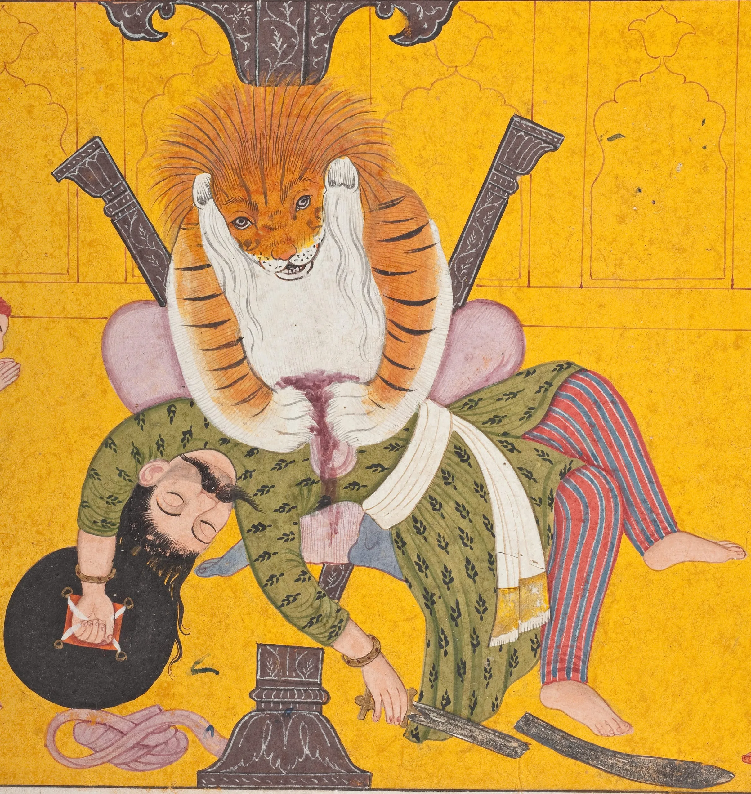 Here, Narasimha emerges from the porch pillar and disembowels the dethroned Hiranyakashipu. Prahlada and Hiranyakashipu’s wife Kayadhu observe the divine act with gestures of devotion.