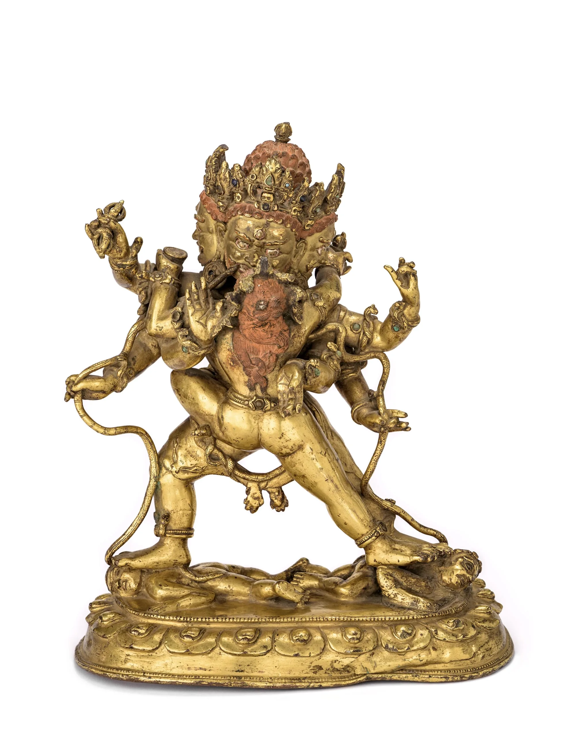 Mahachakra Vajrapani (The Great Wheel Vajra Holder) is a Tantric emanation of the Bodhisattva Vajrapani appearing as a meditational deity (yidam). He has three faces on a single head with red hair and crowned with the prongs of a thunderbolt (vajra). He has six arms. His two lower hands hold serpents relating to his primary function of subduing the Nagas (subterranean and suboceanic serpentine dragons), who are personified by the prostrate figures representing evil that are being trampled by Vajrapani. He is biting the serpents, which is a distinctive iconographic element. His remaining hands hold the thunderbolt and display the gestures of reassurance (abhaya mudra), admonition (tarjani mudra), and charity (varada mudra). He wears a leonine skin around his waist and a scarf with floral motifs around his shoulders. His consort Mamaki (Greedy) embraces Vajrapani in the “father-mother” (yab-yum) sexual posture. She has one head and two arms holding a flaying knife (kartrika) in her right hand and a skullcup in her left hand.