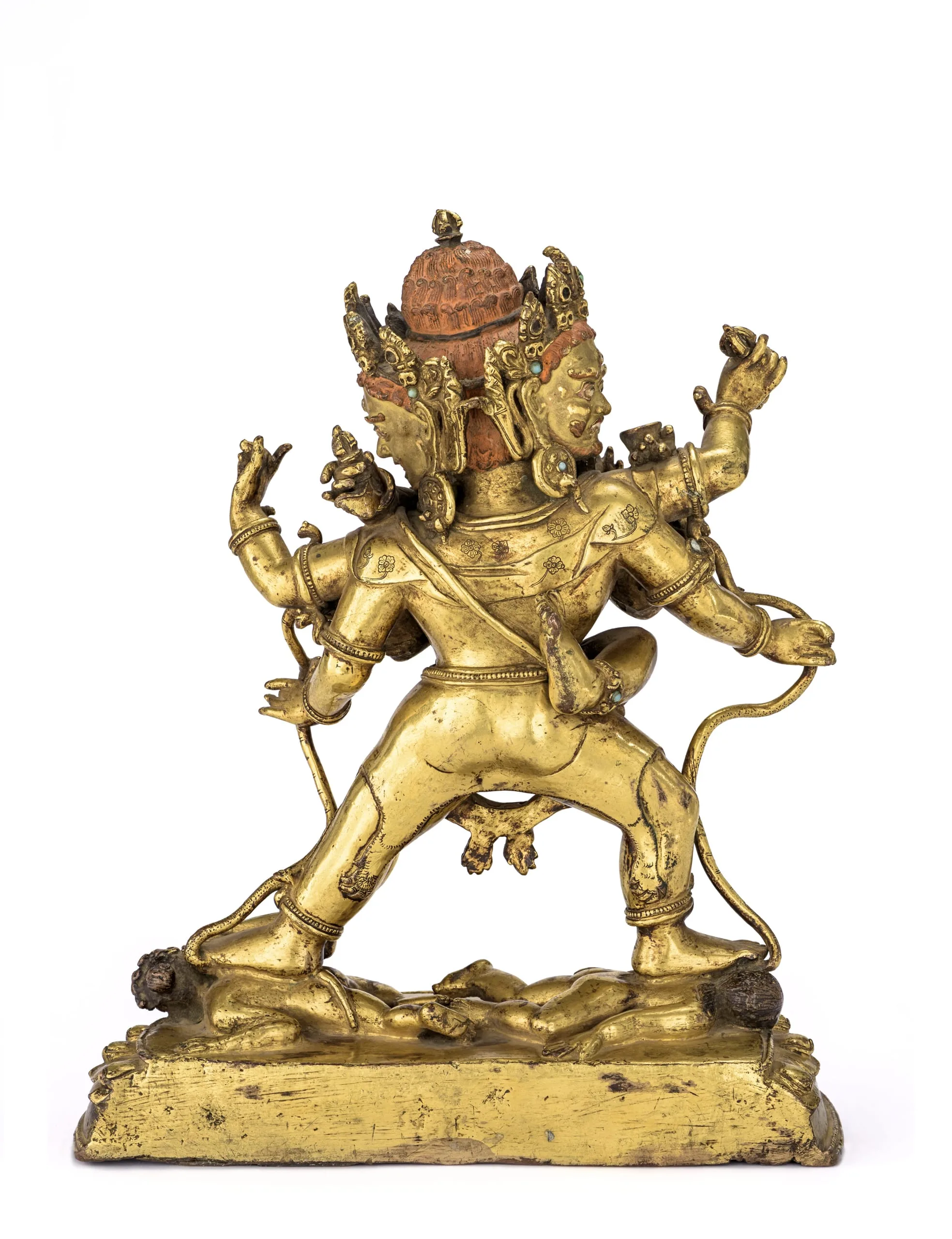 - Gilt unalloyed copper inlaid with turquoise and other gemstones; cold gold paste and paint