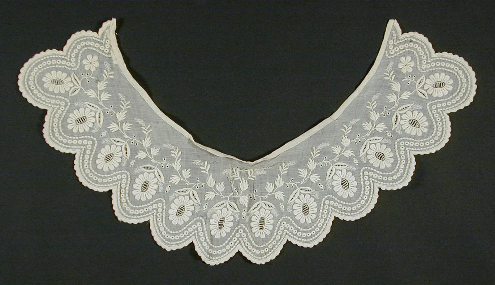 Ivory white embroidered lace collar, crescent-shaped, with scalloped eyelet border and allover floral embroidery including daisy-like blooms and leafy stems