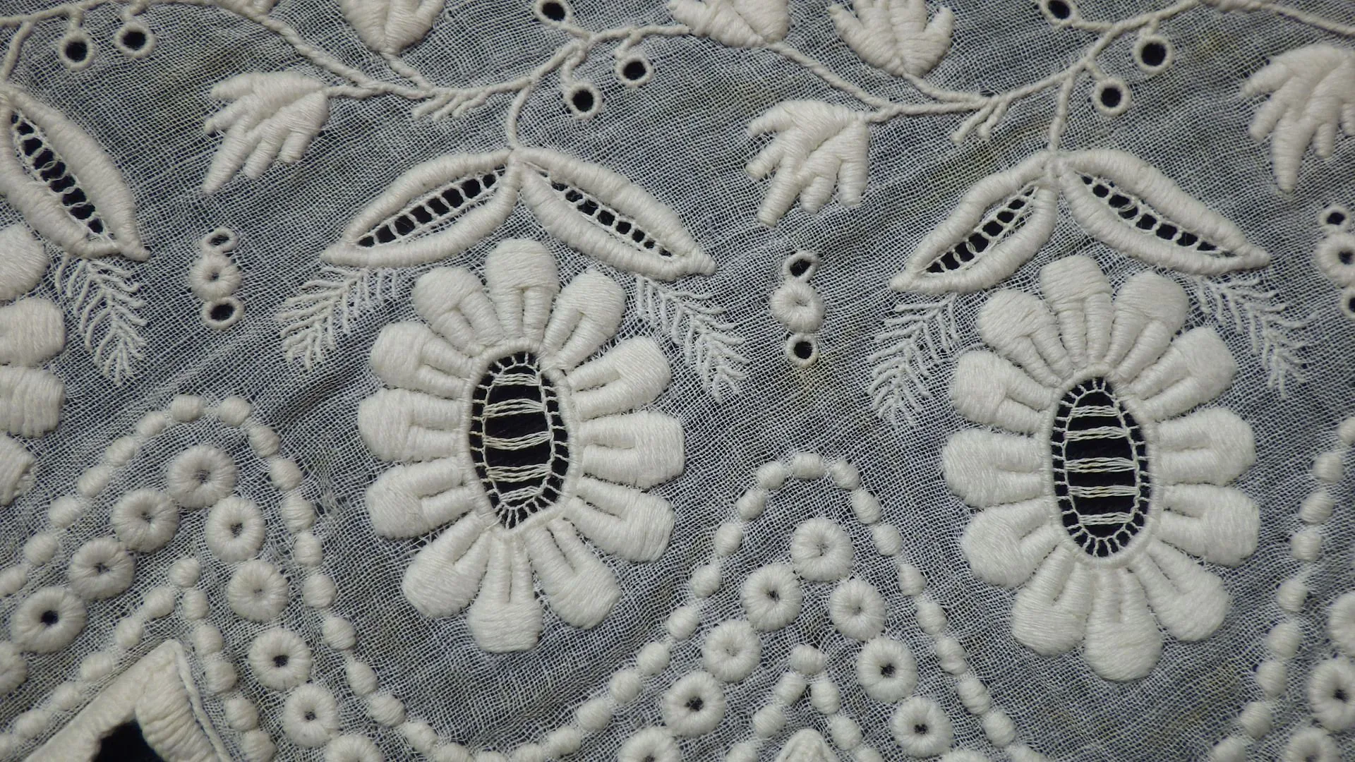 Linen plain weave with cotton cutwork and drawn thread work embroidery