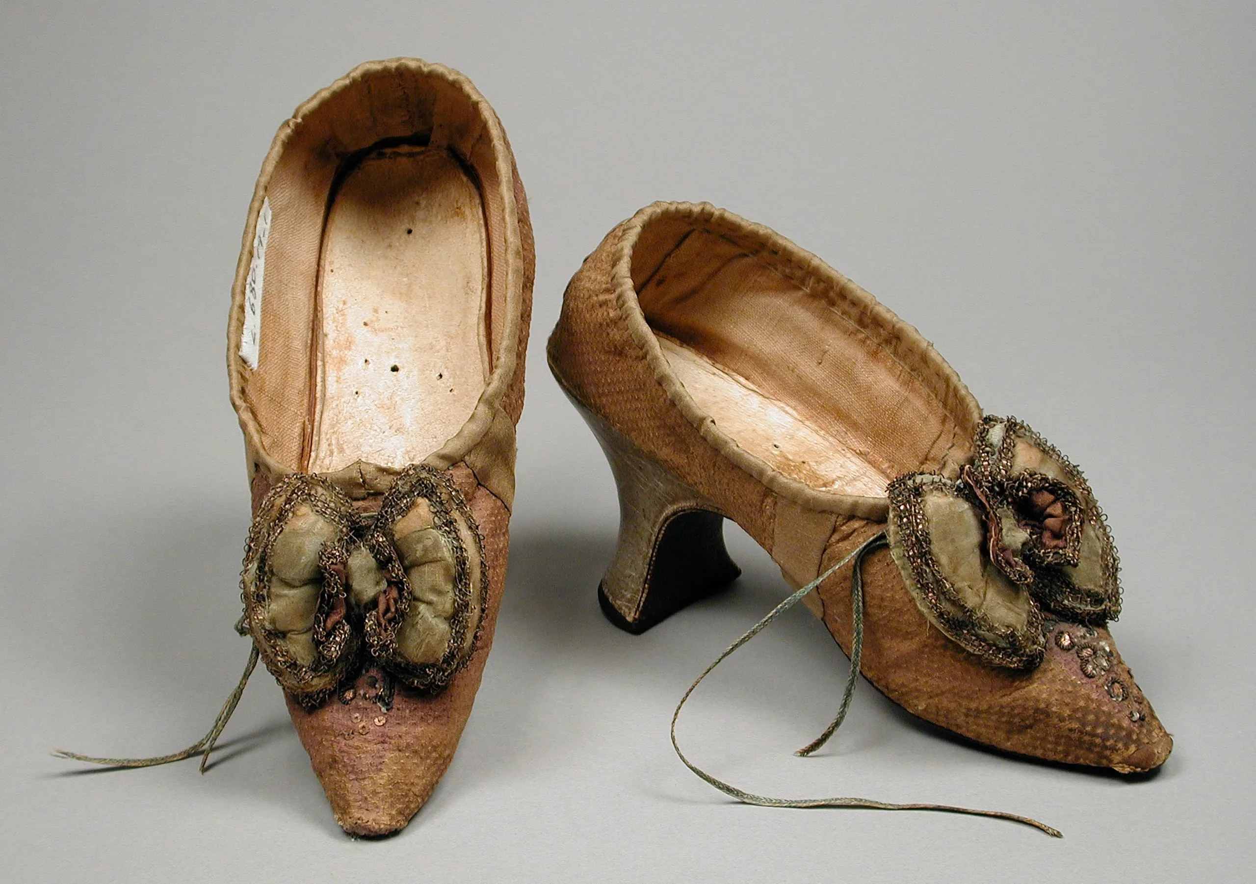 - Metal thread and sequin embroidery on silk damask; gilt passementrie; kid leather heel; sueded leather sole