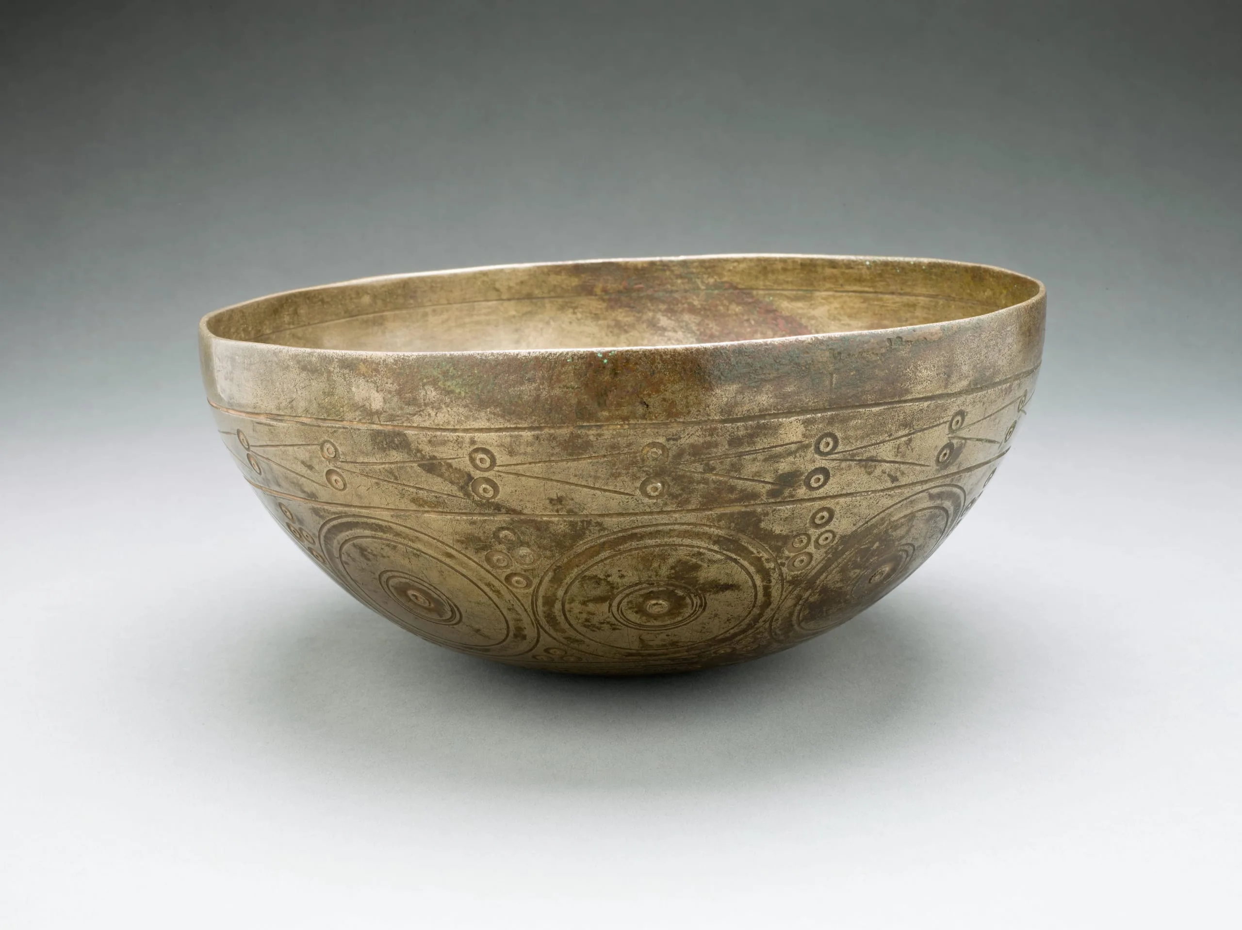 Hemispherical metal bowl with tarnished silver-gold patina, decorated with incised concentric circle rosettes on the lower body and diagonal line-and-dot pattern near the rim