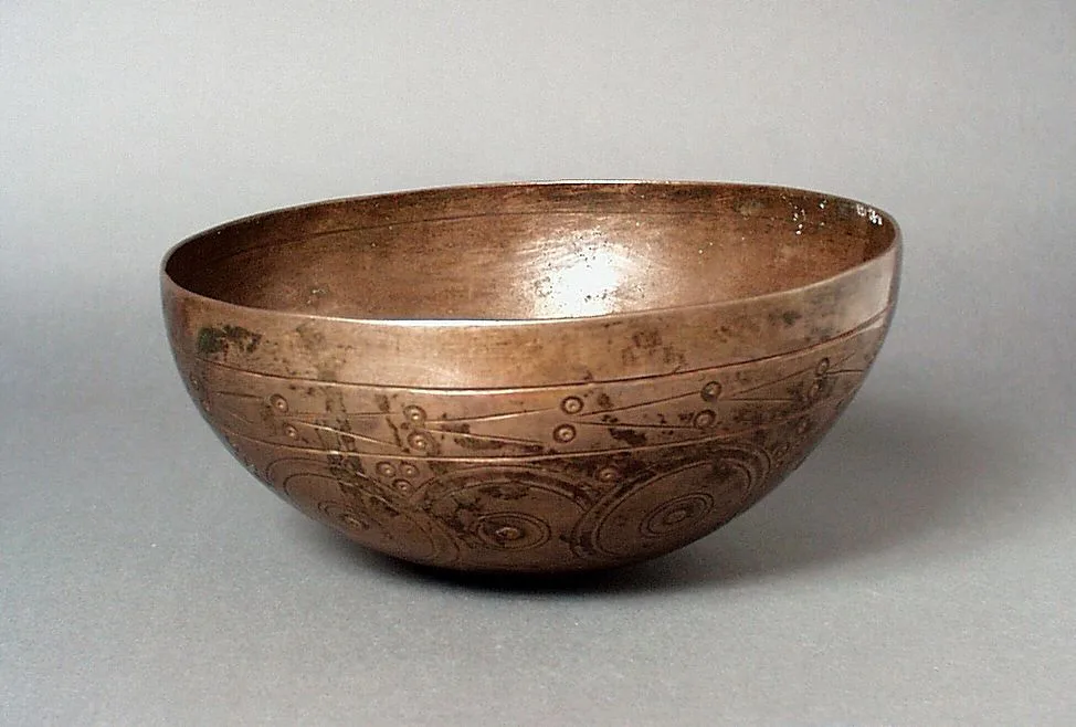 Hemispherical metal bowl with warm copper-brown patina, decorated with incised concentric circles and fine linear patterns encircling the exterior.
