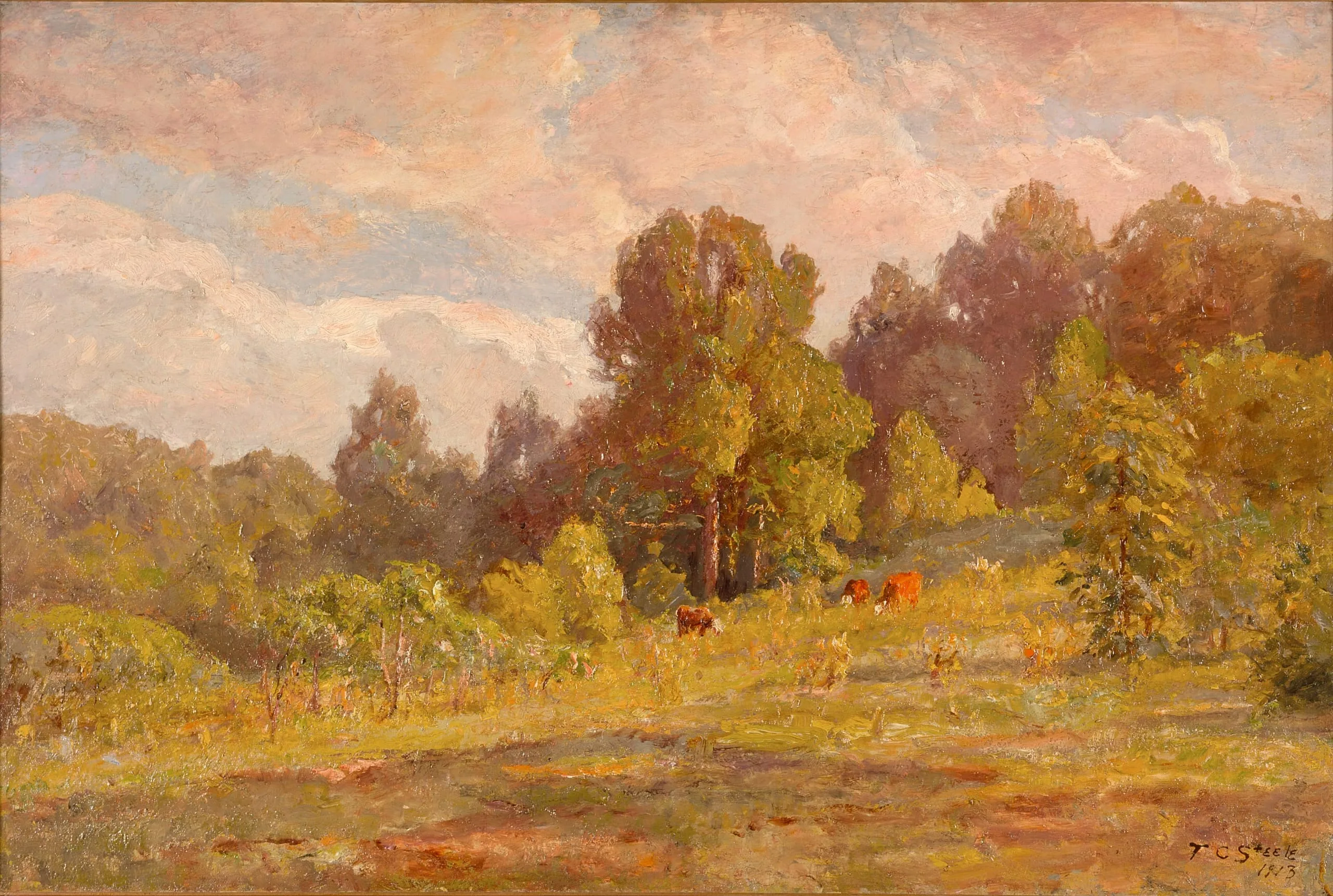 This example of Steele’s mature style is characteristic of his interest in expressing the simple beauty of the hills and fields of Indiana while applying impressionist techniques toward the development of a distinctly American school of art. Its free paint handling and informal composition contribute to the sense that it is a fresh transcription of nature. The site is reminiscent of the Salt Creek and nearby smaller Schooner Creek valleys that lie at the foot of the high, wooded crest where Steele’s House of the Singing Winds was located.