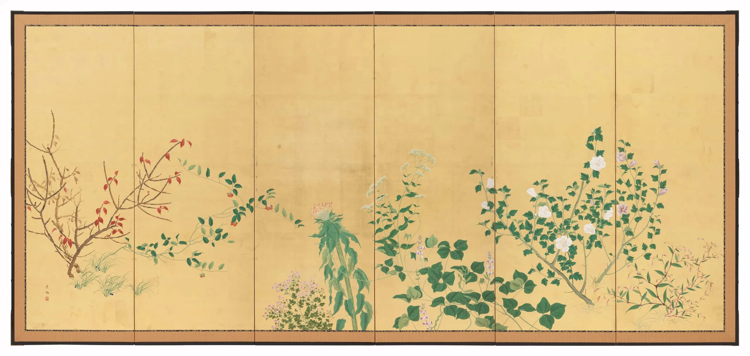 - One from a pair of six-panel screens; ink and color on gold leafedf paper