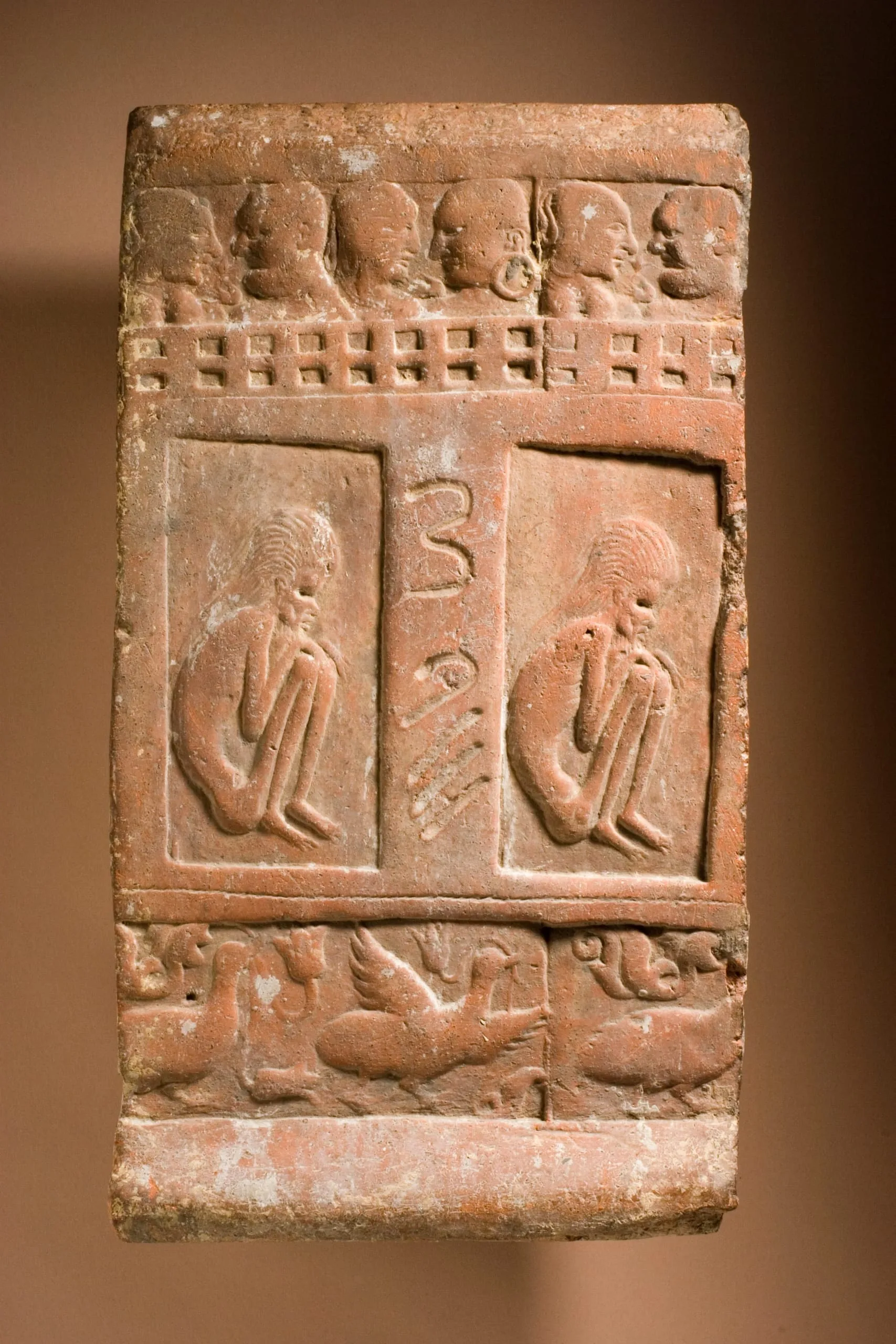 The hillside site of Harwan near Srinagar in Jammu and Kashmir was unearthed in circa 1895 during the construction of the Srinagar waterworks. Numerous earthenware impressed floor and wall tiles were found. The stamped designs include humans engaged in a variety of activities, diverse animals, floral patterns, and abstract designs. Although the majority of the Harwan remains are classified as Buddhist, tiles with squatting ascetics that line the lower walls of an apsidal temple on the upper terrace indicate that the temple was affiliated with the Ajivakas, an heterodox philosophical sect founded in the 5th century BCE by Makkhali Gosala near Shravasti, Uttar Pradesh, and continuing in Karnataka until the 14th century. The Ajivakas apparently practiced an extreme form of asceticism, which is represented by the two ascetics on the tiles who are portrayed as if squatting in a barrel or confined space in what is possibly the "crow posture" (kaka asana). The emaciated ascetics are naked and have long hair down their back. At the top of the tile is a railing with three pairs of tête-à-tête male busts of presumed foreigners. The molding at the bottom of the tile is a row of geese with water lilies in their bills. In the center between the two ascetic panels is an inscription written in the Kharoshthi script providing the numerals 3, 7, and 8, which was likely used for sequencing the tiles on the monument. (See Robert E. Fisher, "The Enigma of Harwan," Art International 25:9-10 (1982): 33-45.)