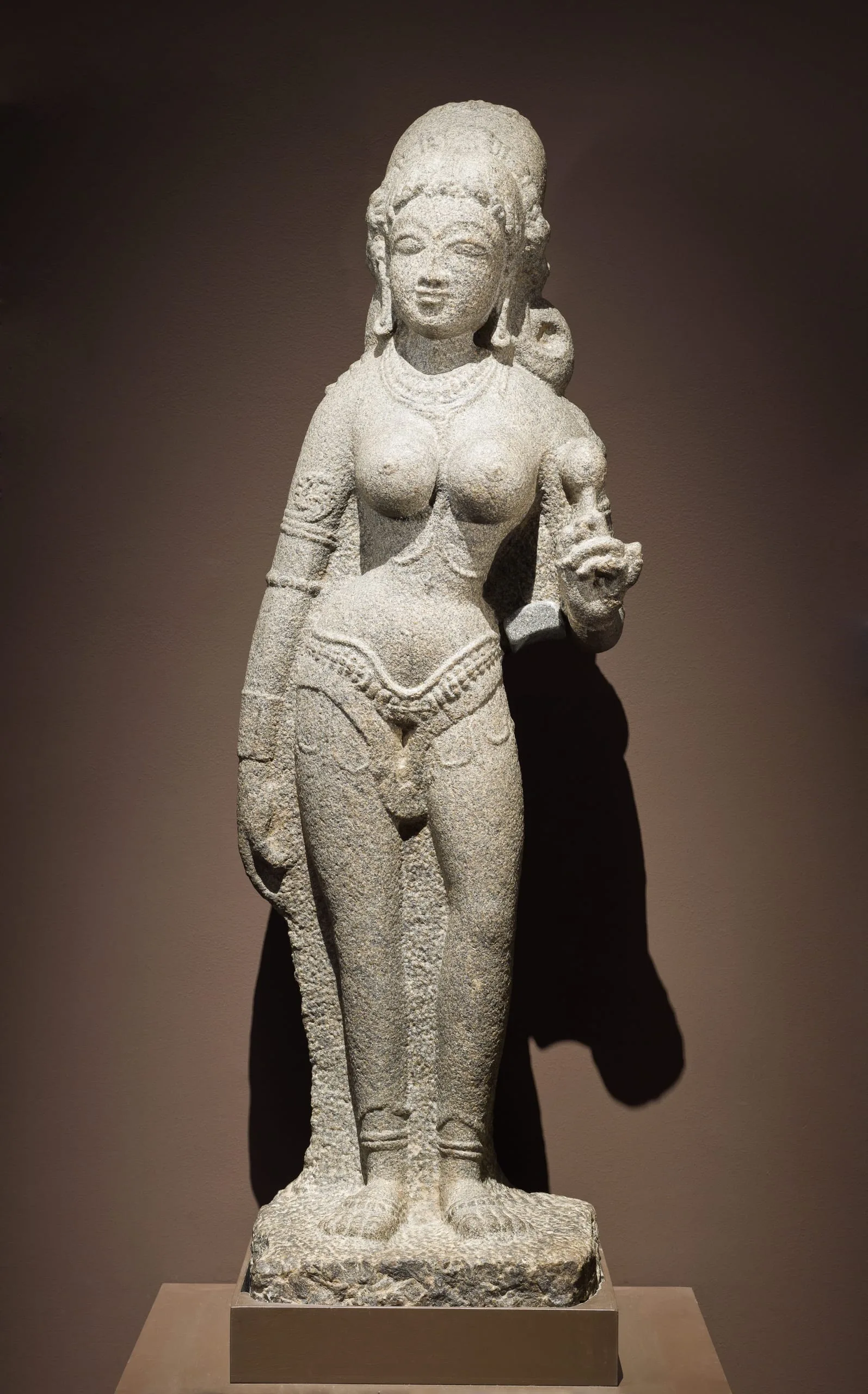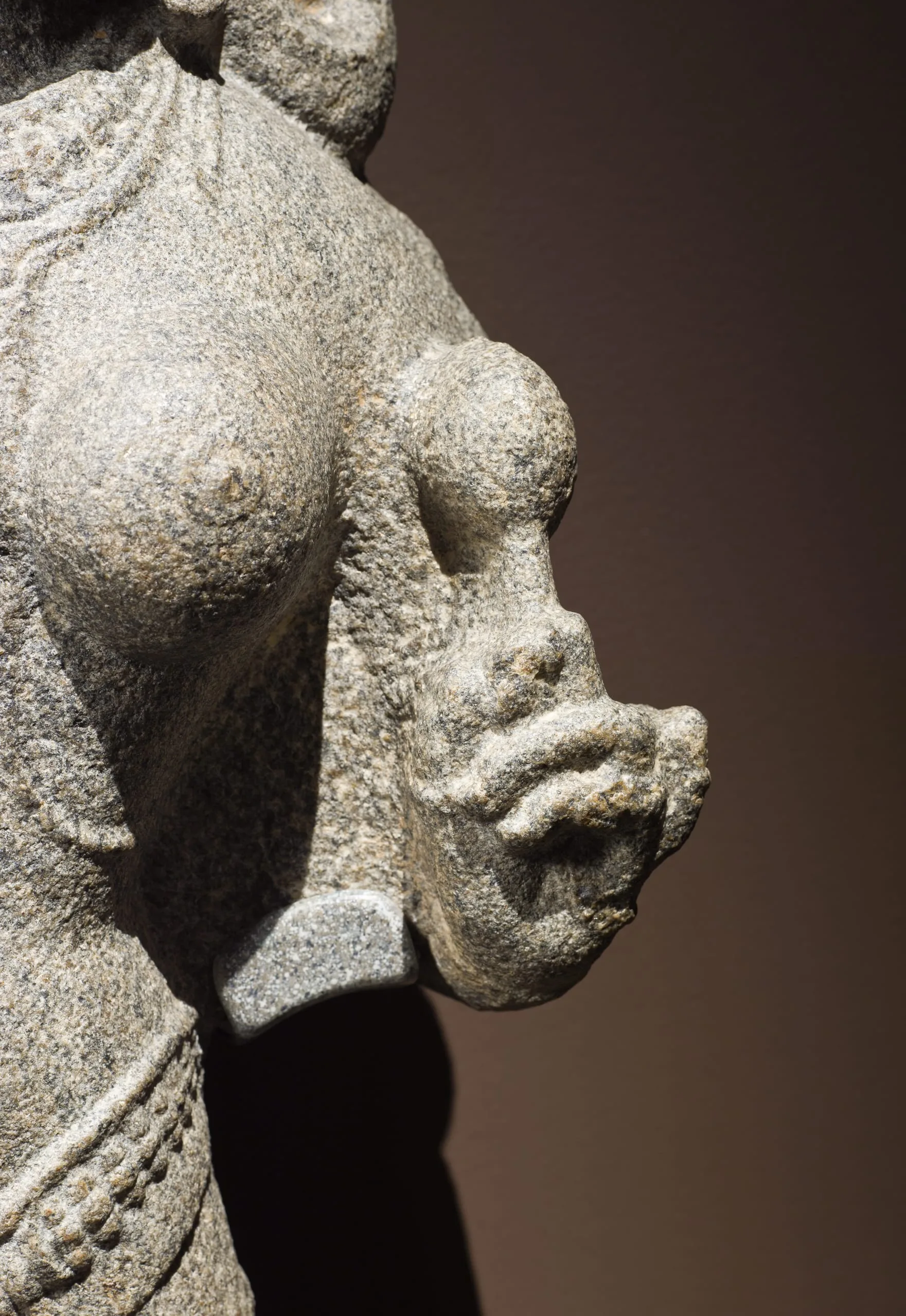 Sita is the heroine of the Ramayana (Adventures of Rama), which narrates the legendary life and times of the valiant Prince Rama and his dutiful wife, Princess Sita, who was abducted by Ravana, the arrogant ten-headed demonic King of Lanka (probably modern Sri Lanka), during Rama’s unjust fourteen-year forest exile from his capital of Ayodhya (near present-day Faizabad in northern India). Upon learning of her captivity by Ravana, Rama and his faithful brother Lakshmana assembled a great army of monkeys and bears led by the Monkey-King Sugriva and his General, Hanuman, in order to attack Lanka and rescue Sita. After several magical battles, the princess was freed and the happy couple returned home to rule. But the public doubted Sita’s loyalty to Rama during her captivity and she was forced to undergo a trial by fire to prove her innocence. Sita is also the Hindu goddess of beauty and devotion, a mother goddess, and an avatar of the goddess Lakshmi. This granulite sculpture likely represents Sita as a goddess rather than in her narrative role.