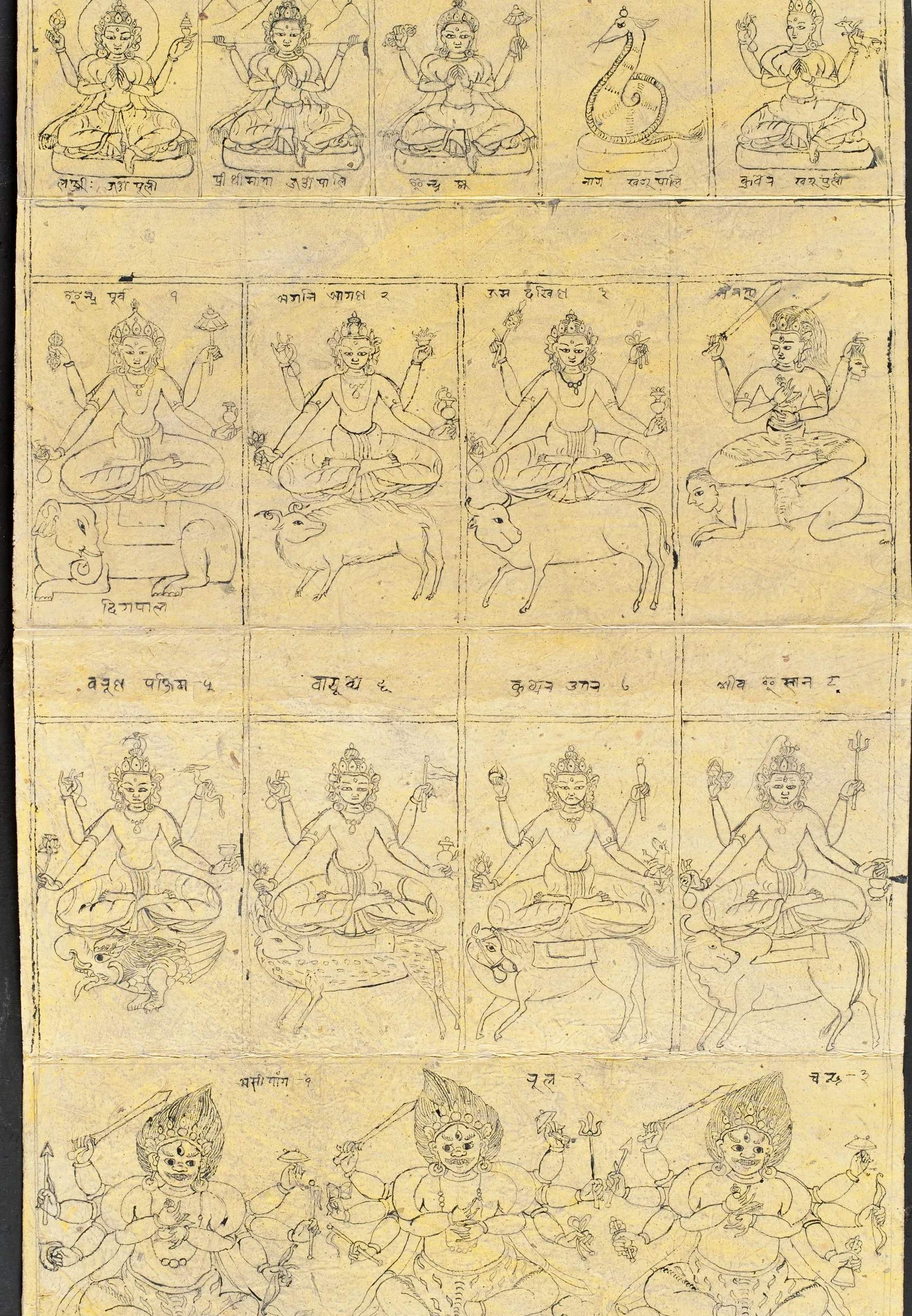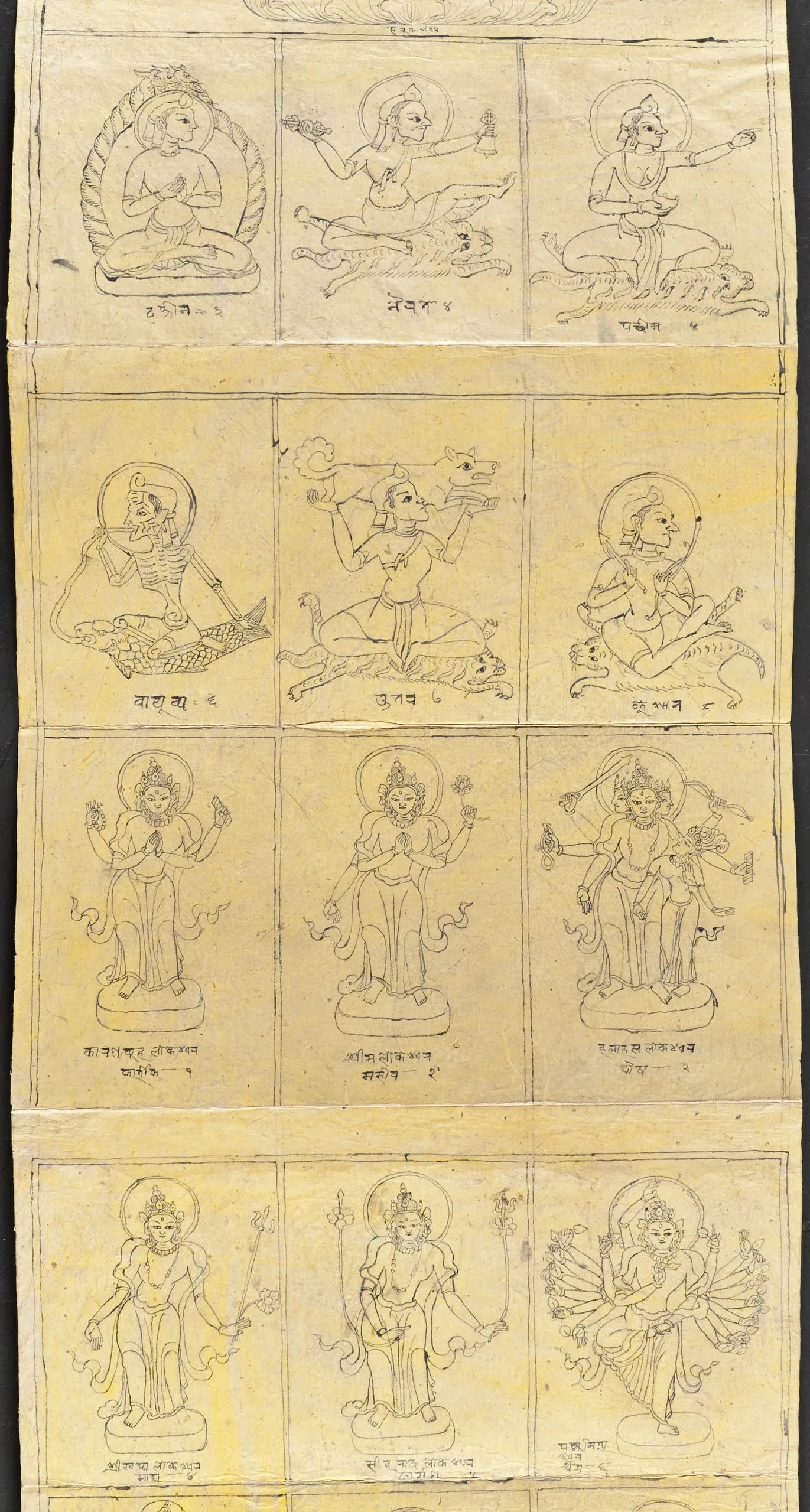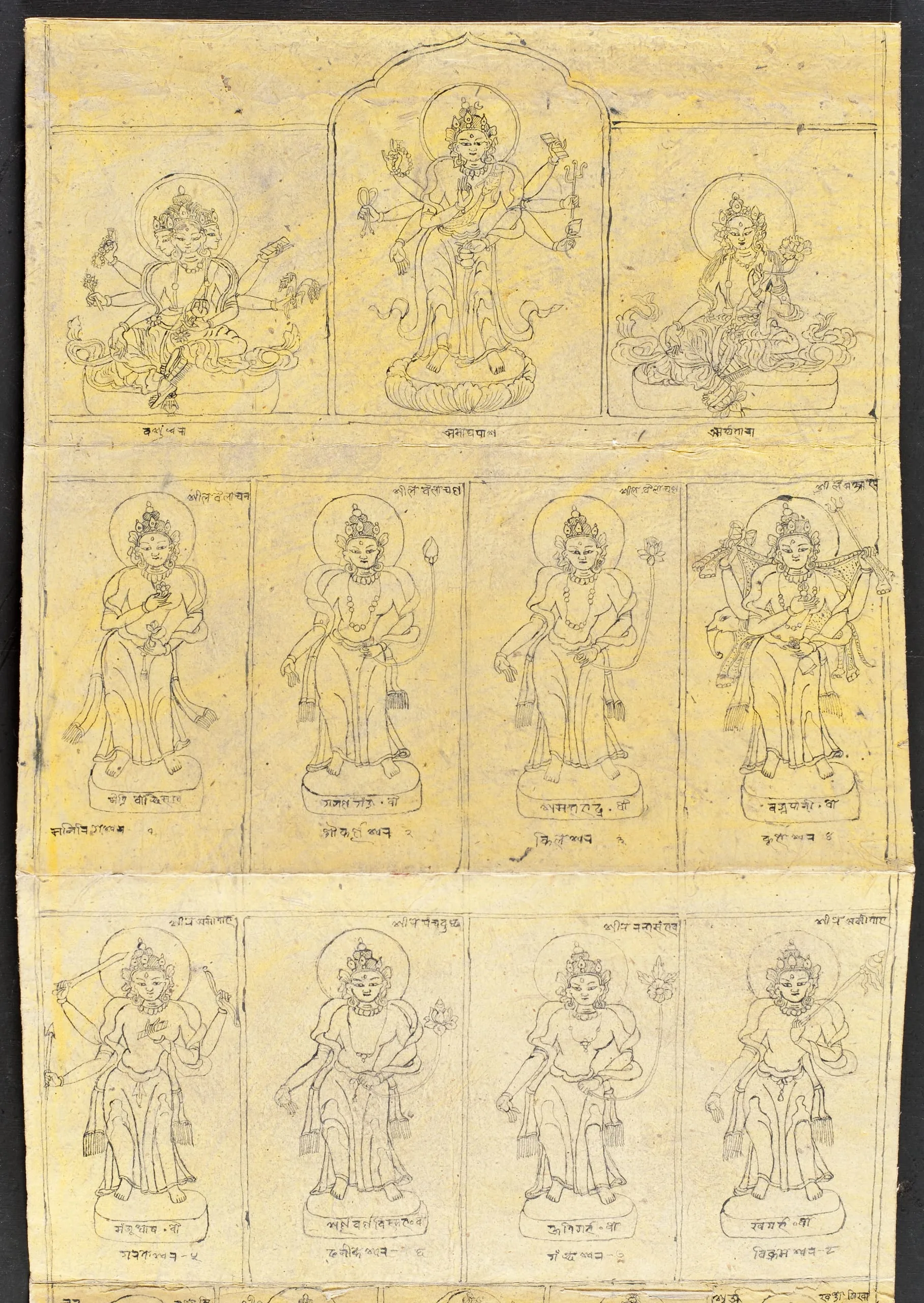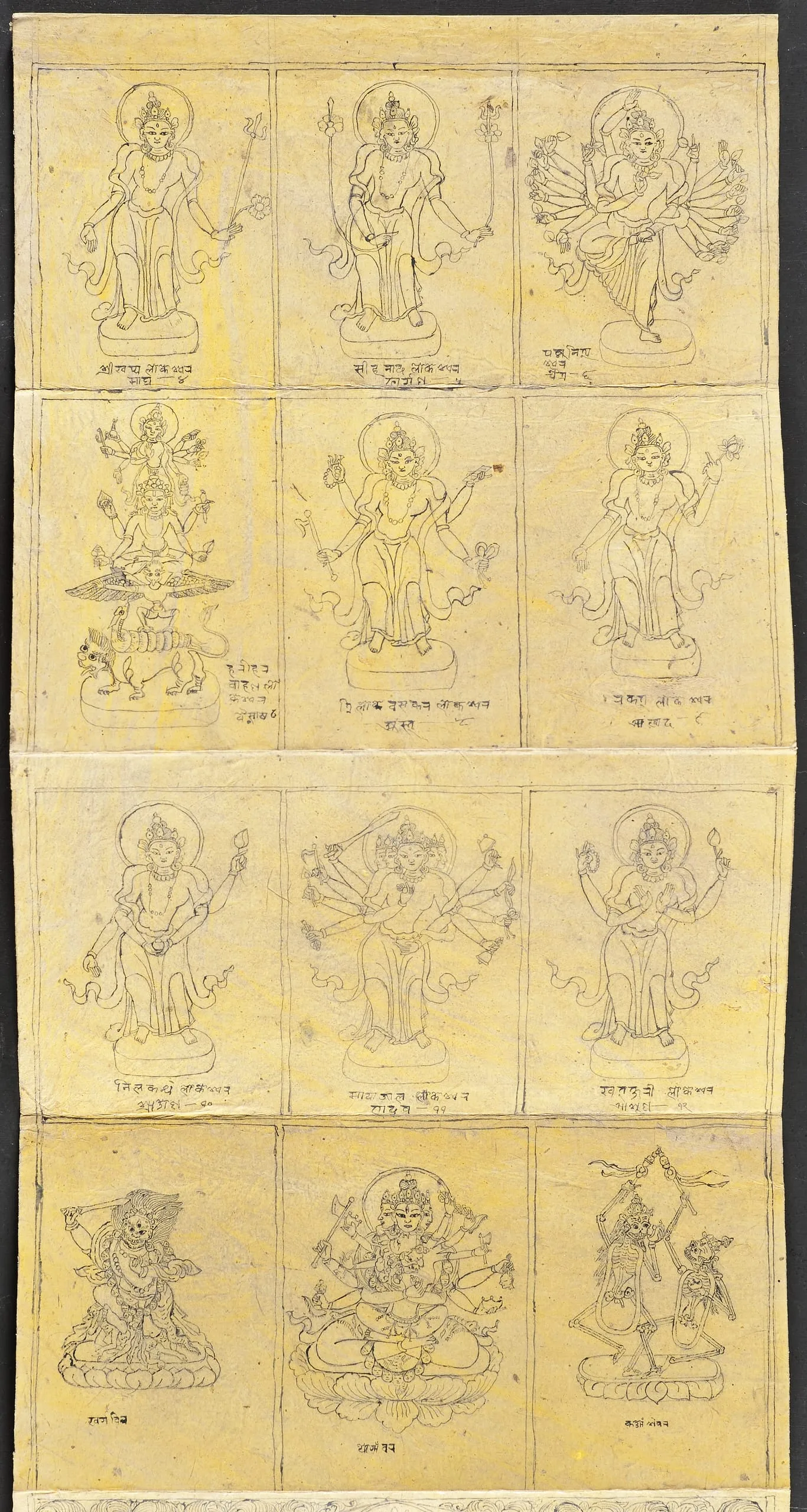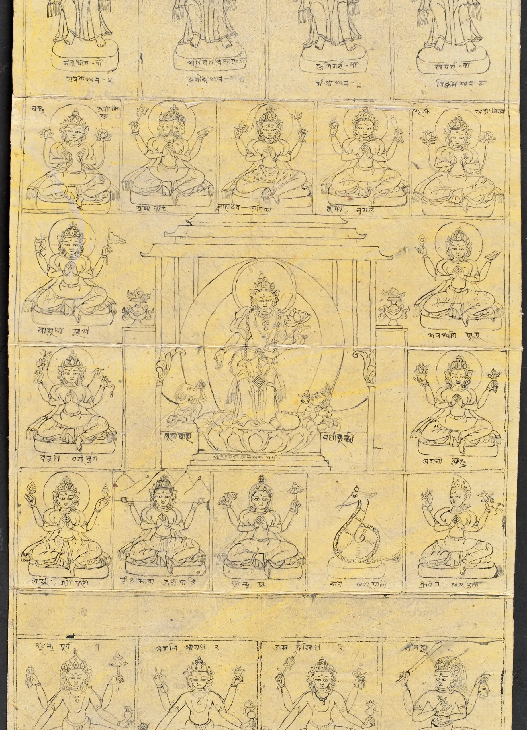 This accordion-fold book (thyasaphu) of thirty-six folios of orpiment (haritala) paper is among the best-preserved and most complete iconographic sources of Newar Buddhist and Hindu imagery. It contains 212 detailed representations of the locally significant Tantric Buddhist deities, such as the eight Mother Goddesses, the primordial goddess Guhyeshvari, and a fully developed iconography of Chakrasamvara and Vajravarahi. There are also illustrations of the life of the Buddha and Buddhist moral fables (avadanas). The book also features Hindu images, such as twelve forms of Vishnu and Shiva, each form associated with a particular month, as well as Vishnu’s twelve avatars and the eight most famous Shivalingas of Nepal.