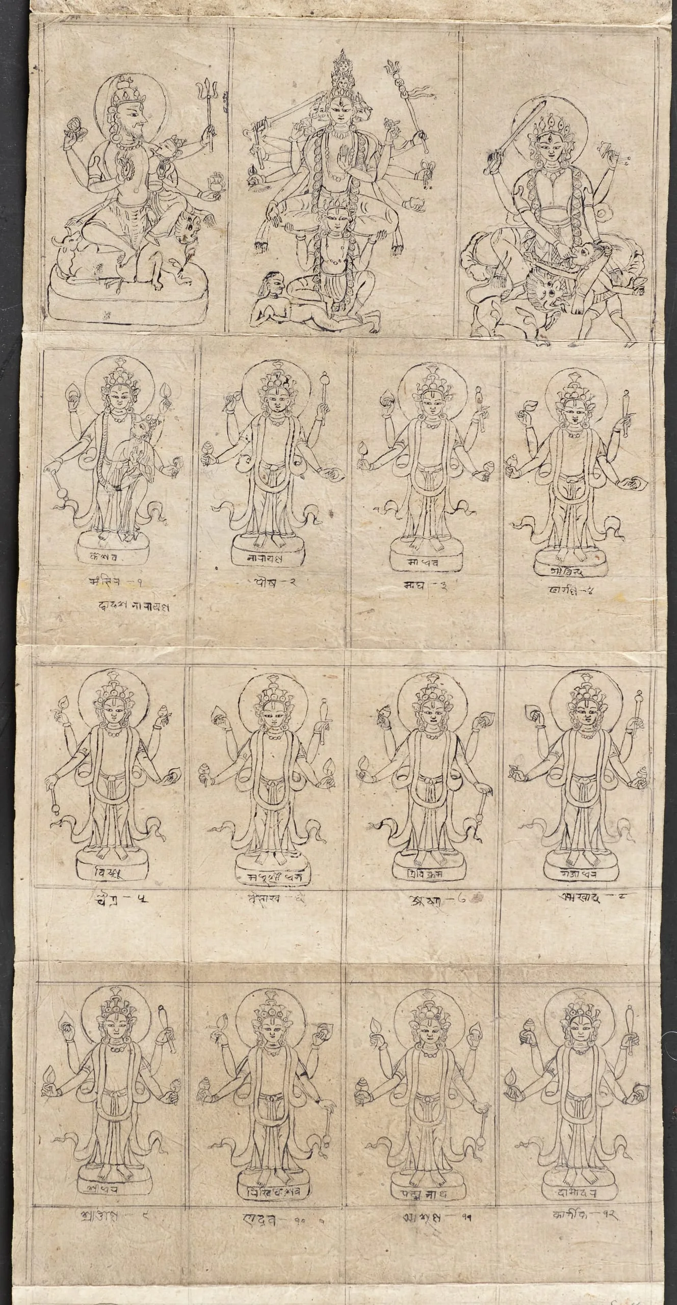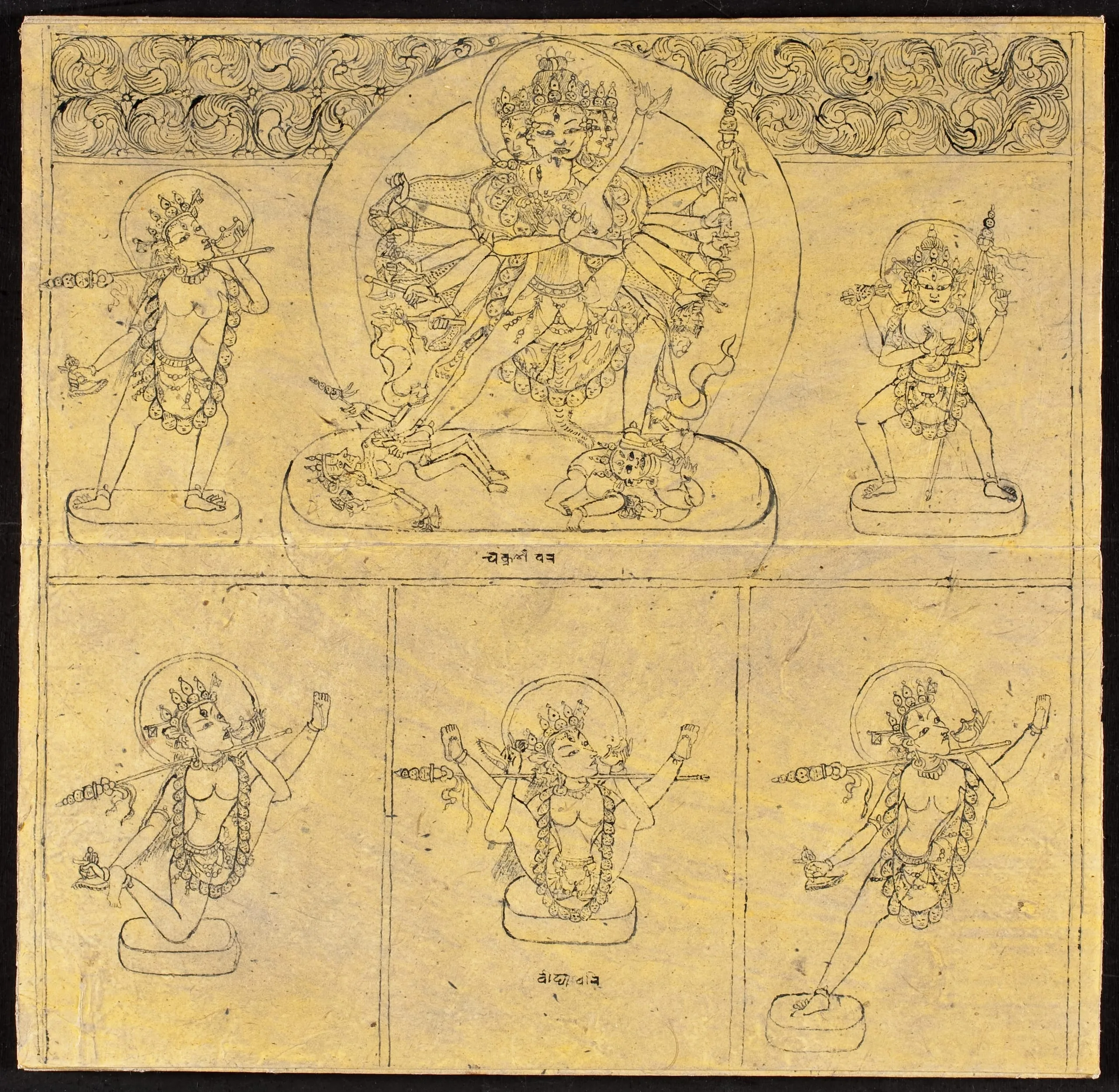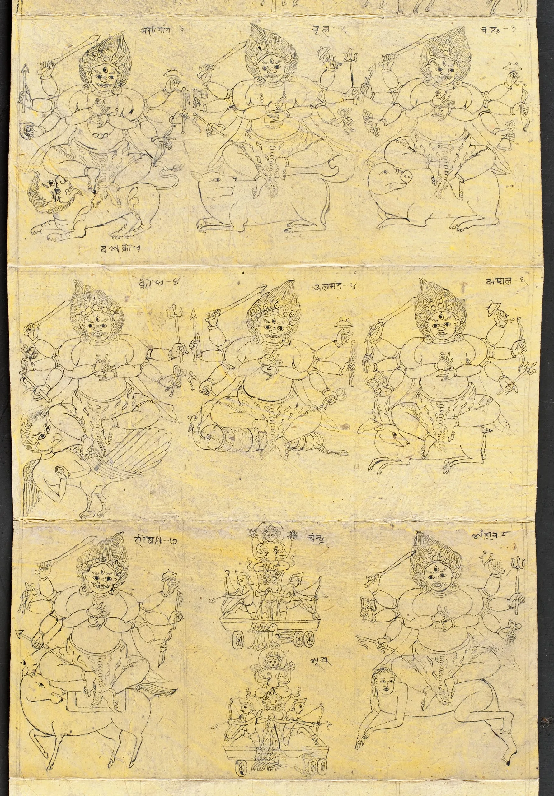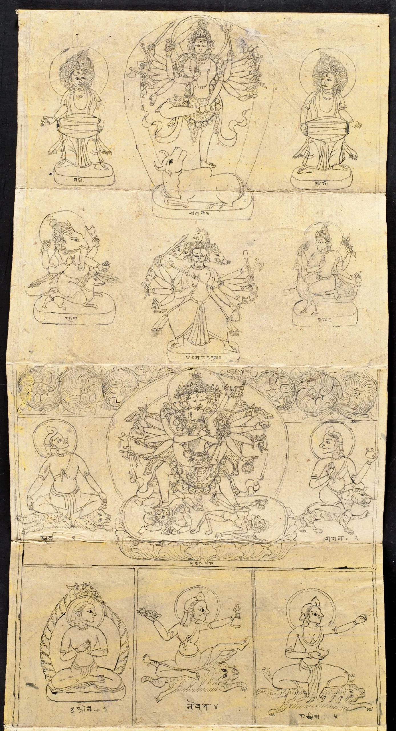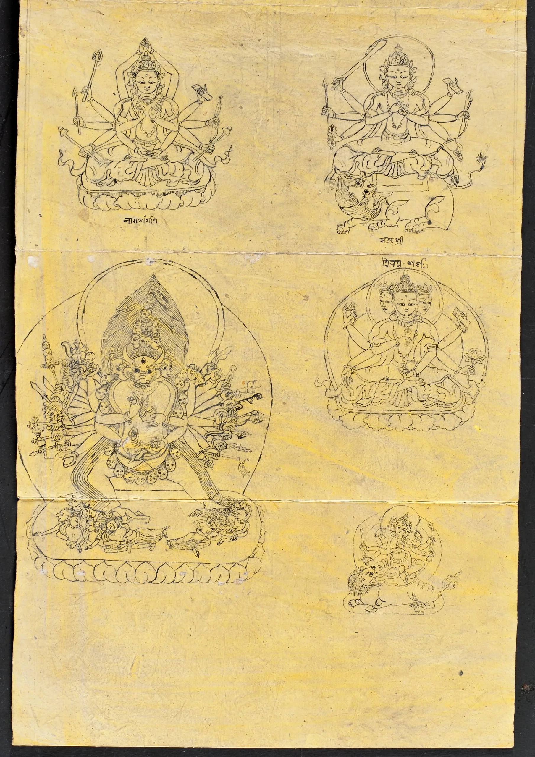 This accordion-fold book (thyasaphu) of thirty-six folios of orpiment (haritala) paper is among the best-preserved and most complete iconographic sources of Newar Buddhist and Hindu imagery. It contains 212 detailed representations of the locally significant Tantric Buddhist deities, such as the eight Mother Goddesses, the primordial goddess Guhyeshvari, and a fully developed iconography of Chakrasamvara and Vajravarahi. There are also illustrations of the life of the Buddha and Buddhist moral fables (avadanas). The book also features Hindu images, such as twelve forms of Vishnu and Shiva, each form associated with a particular month, as well as Vishnu’s twelve avatars and the eight most famous Shivalingas of Nepal.