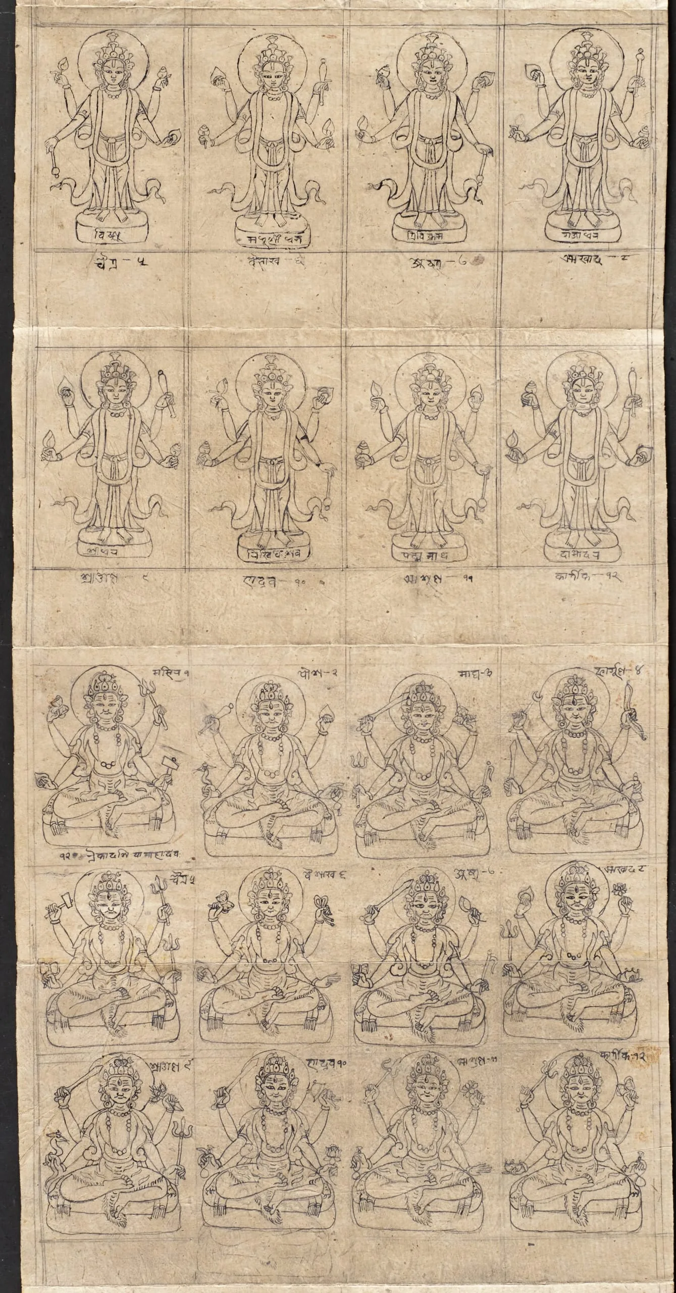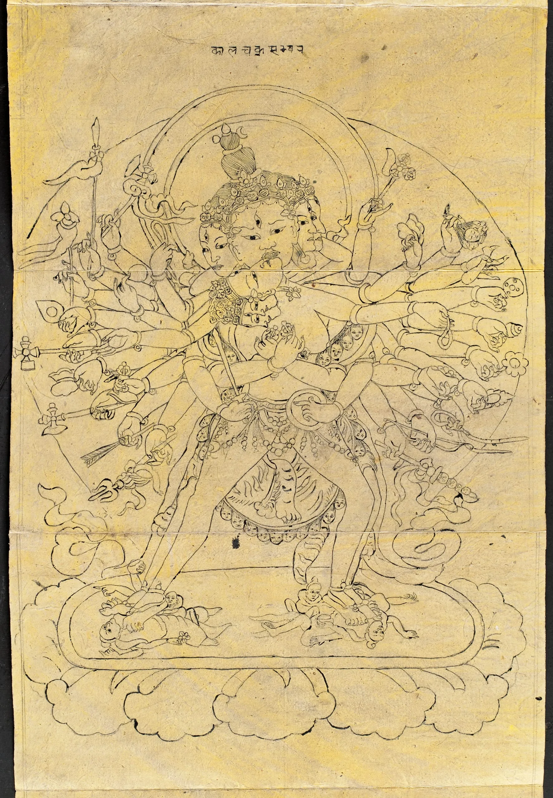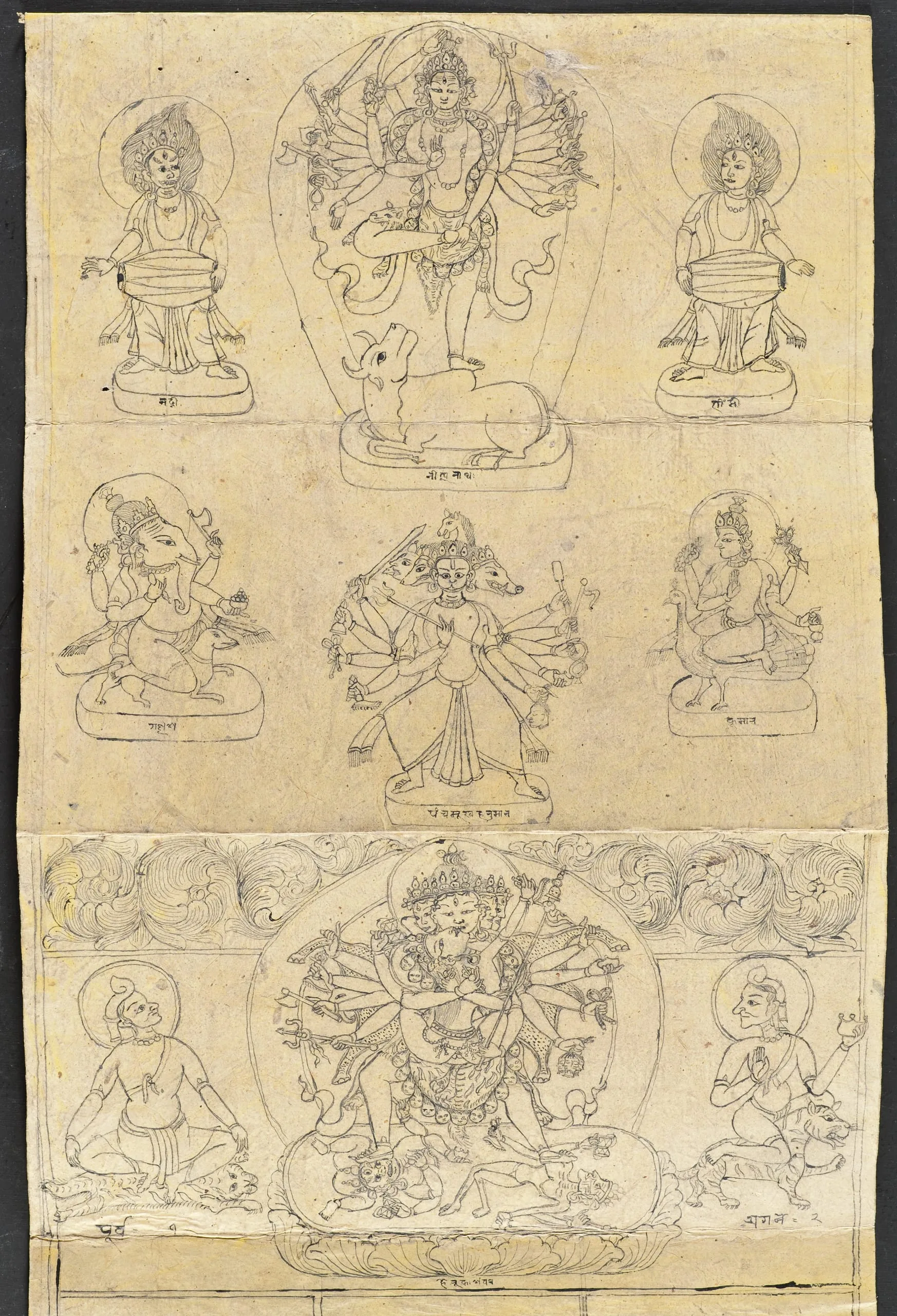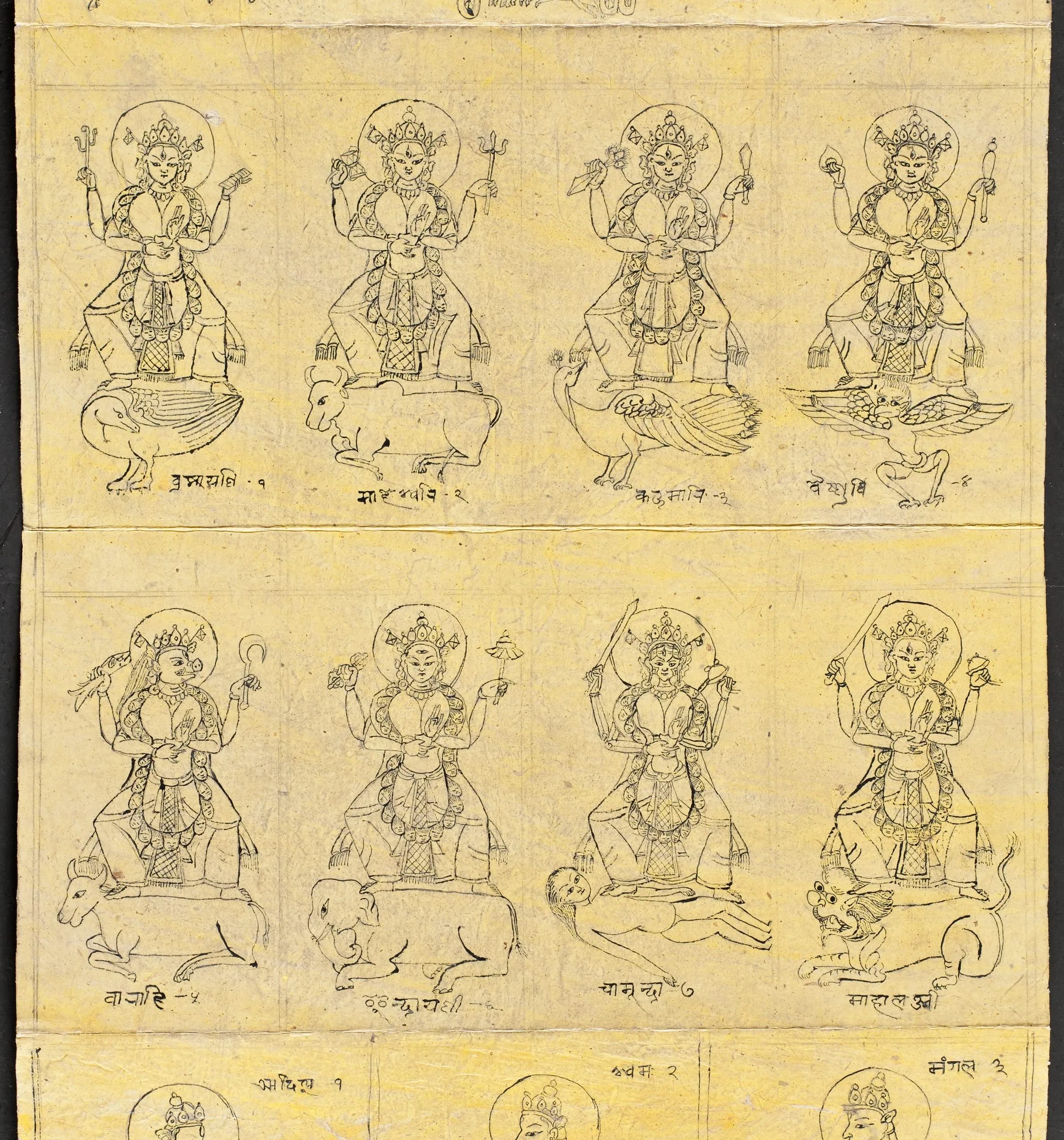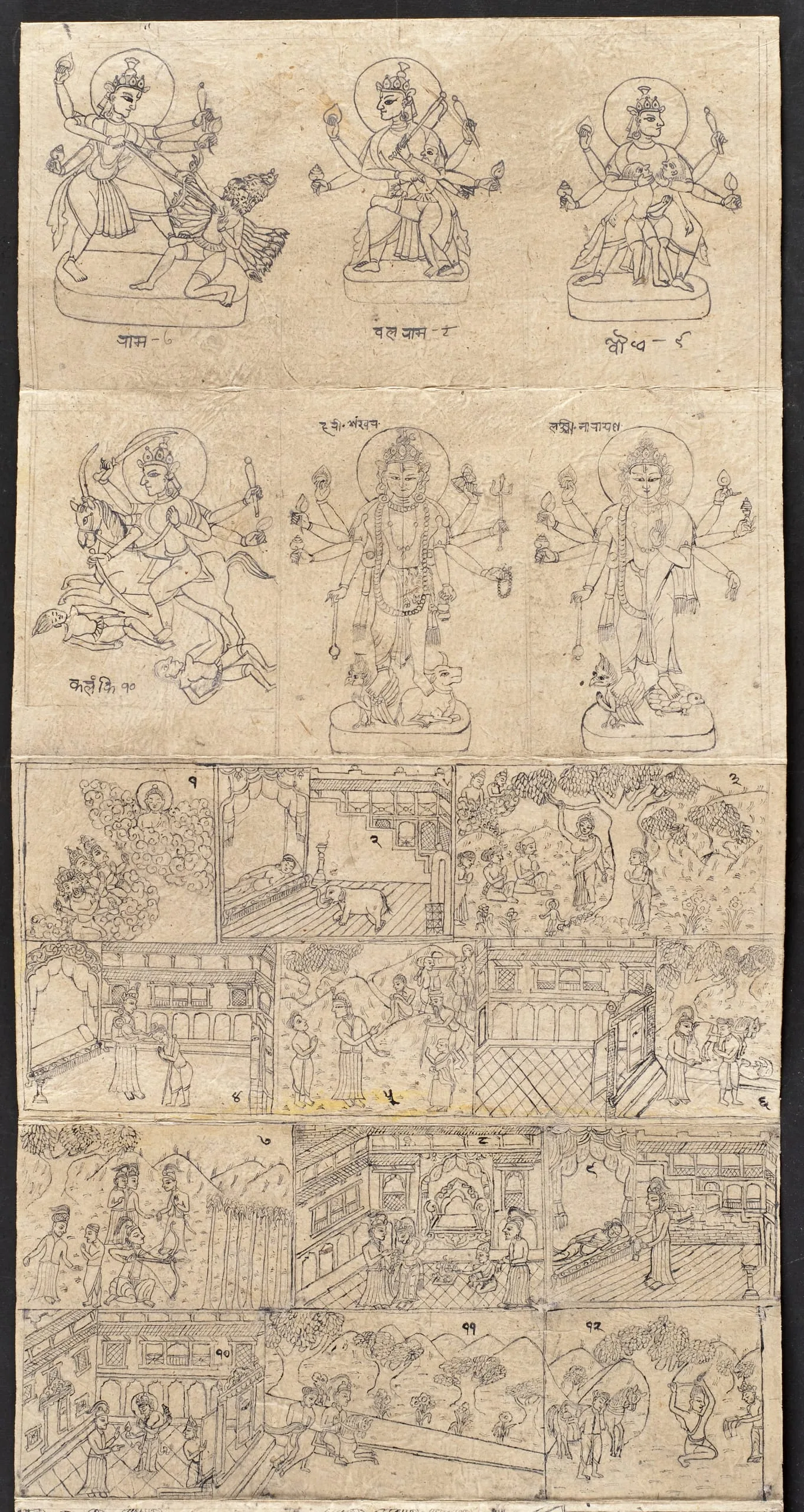 This accordion-fold book (thyasaphu) of thirty-six folios of orpiment (haritala) paper is among the best-preserved and most complete iconographic sources of Newar Buddhist and Hindu imagery. It contains 212 detailed representations of the locally significant Tantric Buddhist deities, such as the eight Mother Goddesses, the primordial goddess Guhyeshvari, and a fully developed iconography of Chakrasamvara and Vajravarahi. There are also illustrations of the life of the Buddha and Buddhist moral fables (avadanas). The book also features Hindu images, such as twelve forms of Vishnu and Shiva, each form associated with a particular month, as well as Vishnu’s twelve avatars and the eight most famous Shivalingas of Nepal.
