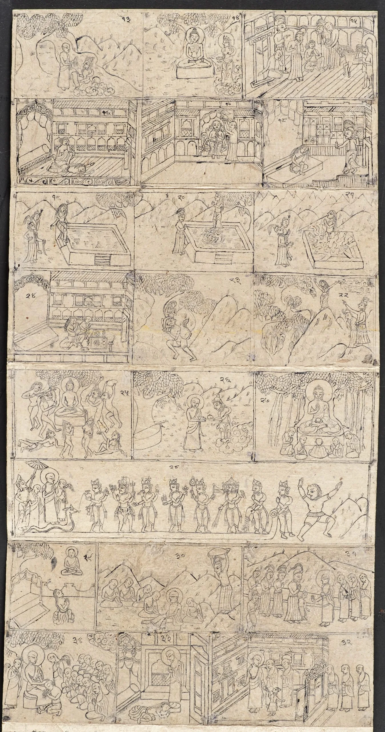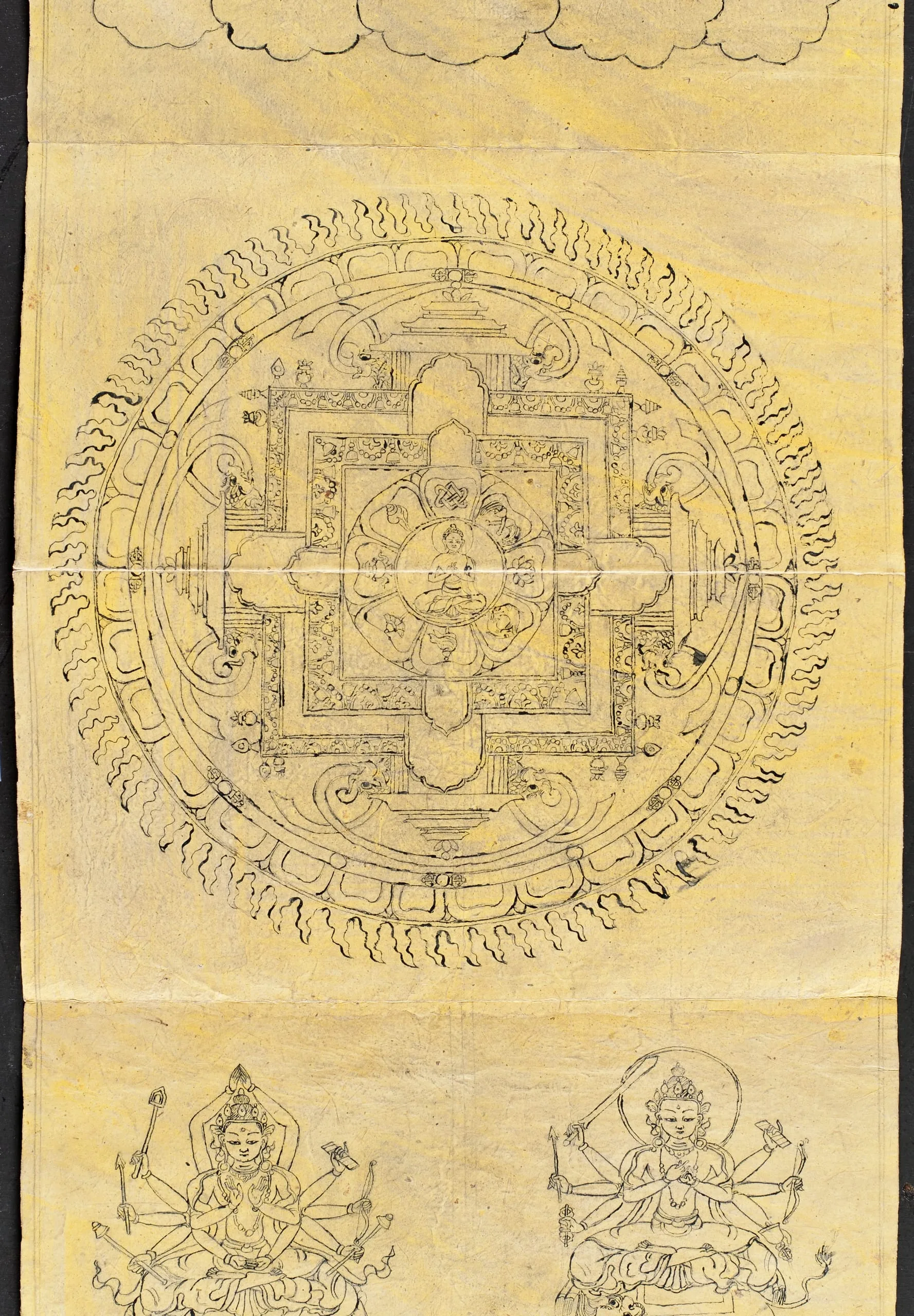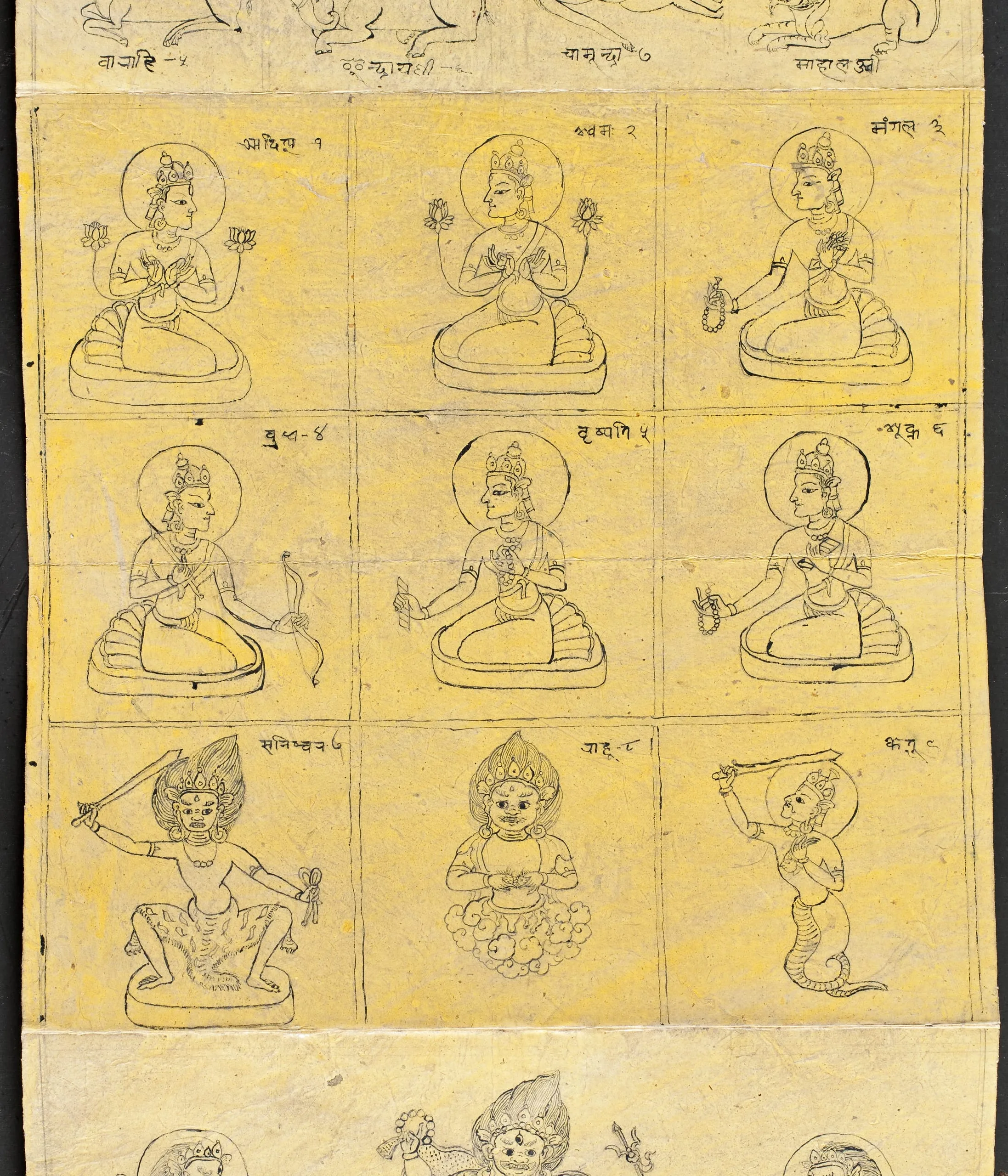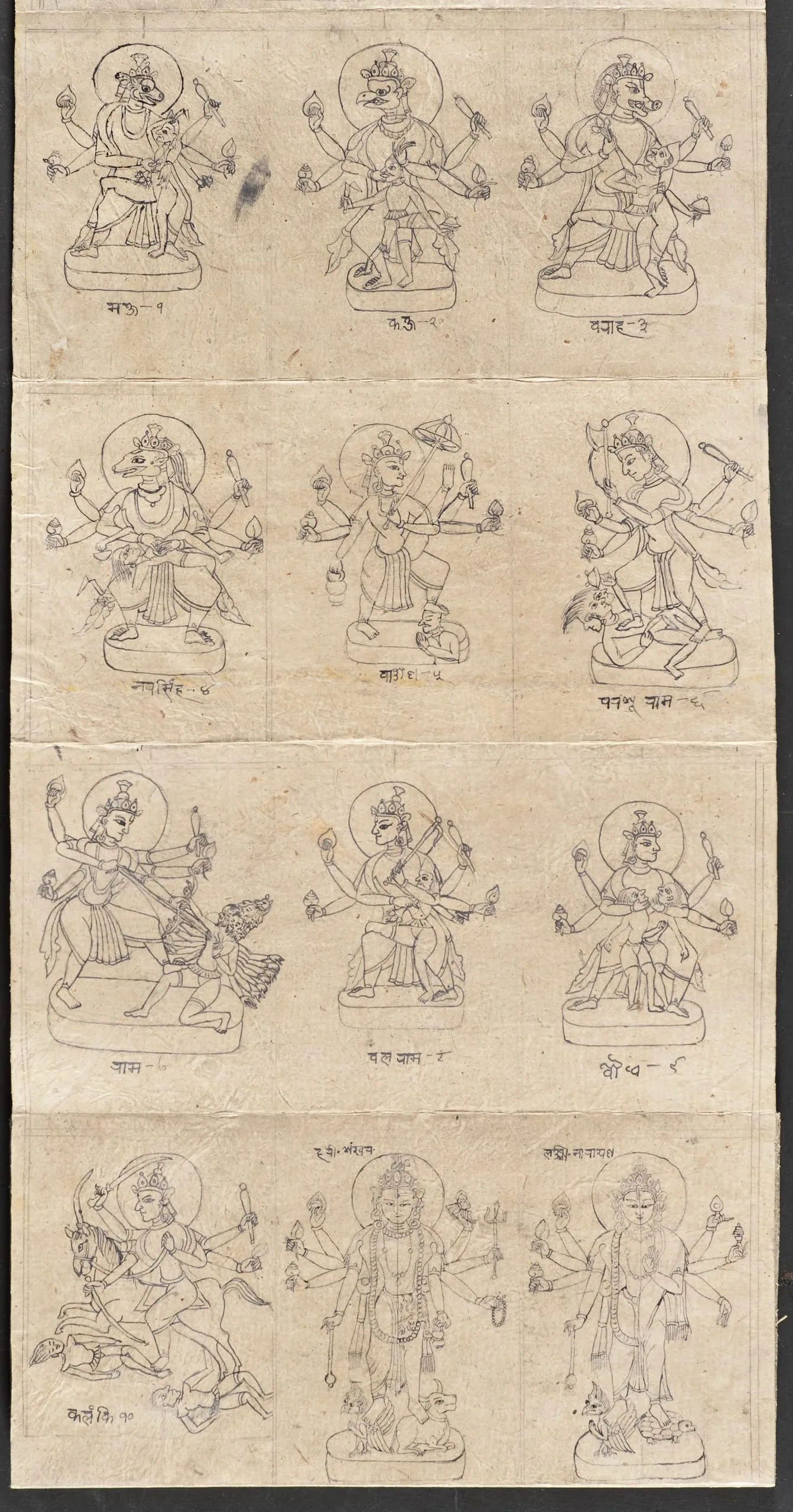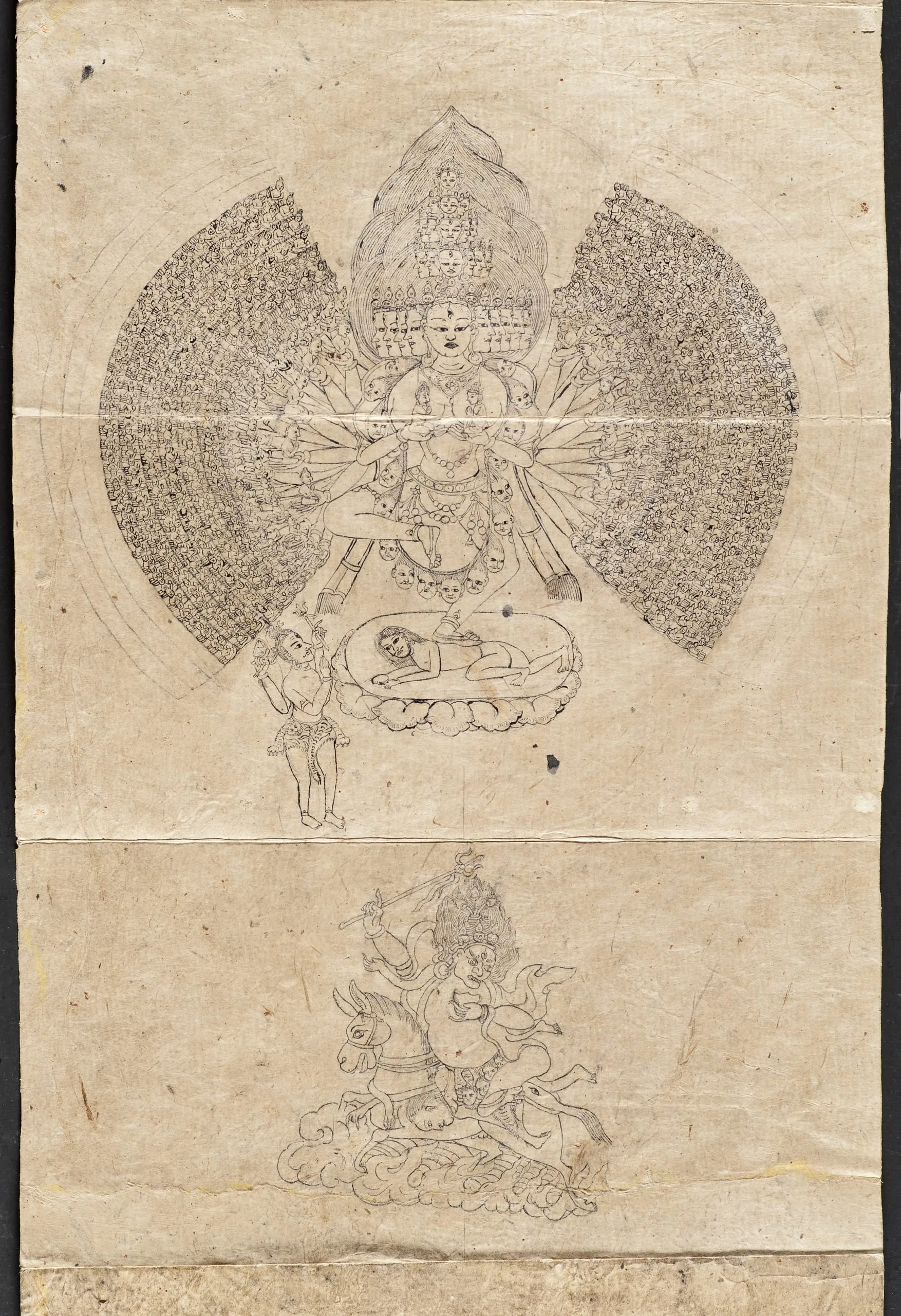 This accordion-fold book (thyasaphu) of thirty-six folios of orpiment (haritala) paper is among the best-preserved and most complete iconographic sources of Newar Buddhist and Hindu imagery. It contains 212 detailed representations of the locally significant Tantric Buddhist deities, such as the eight Mother Goddesses, the primordial goddess Guhyeshvari, and a fully developed iconography of Chakrasamvara and Vajravarahi. There are also illustrations of the life of the Buddha and Buddhist moral fables (avadanas). The book also features Hindu images, such as twelve forms of Vishnu and Shiva, each form associated with a particular month, as well as Vishnu’s twelve avatars and the eight most famous Shivalingas of Nepal.
