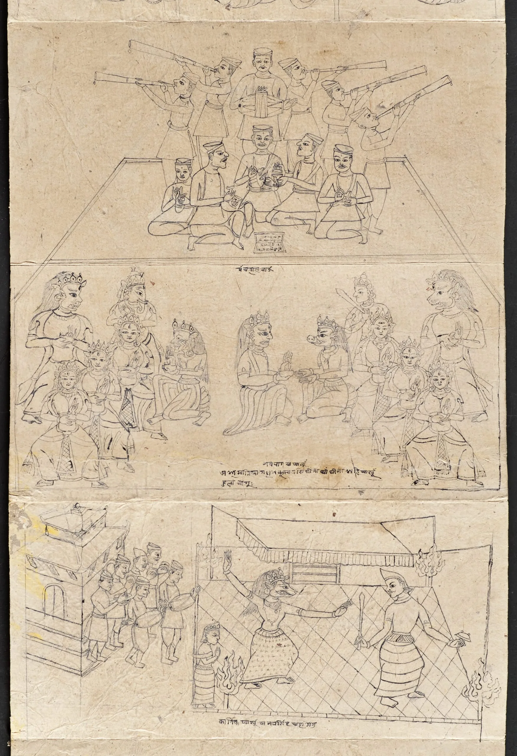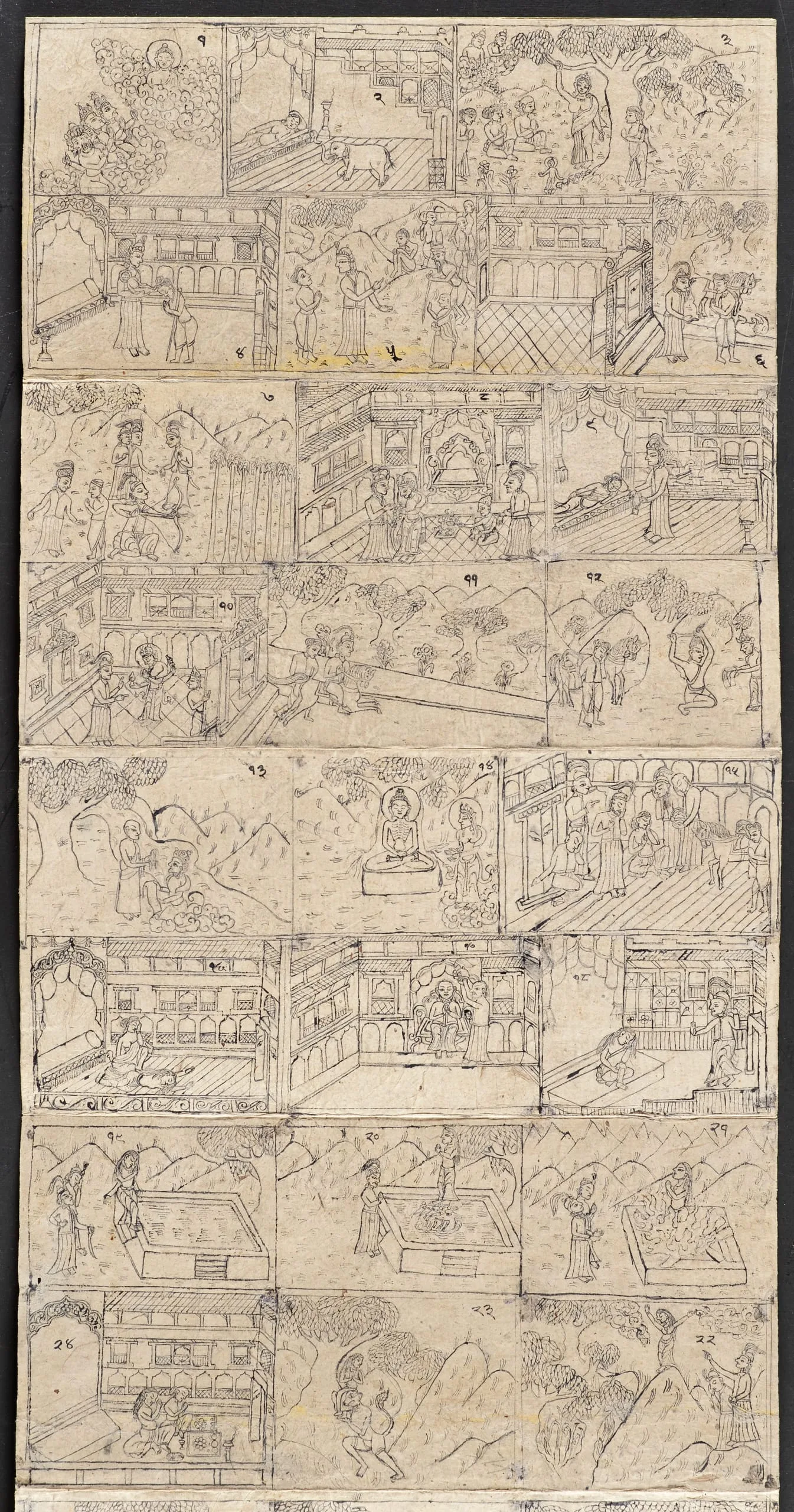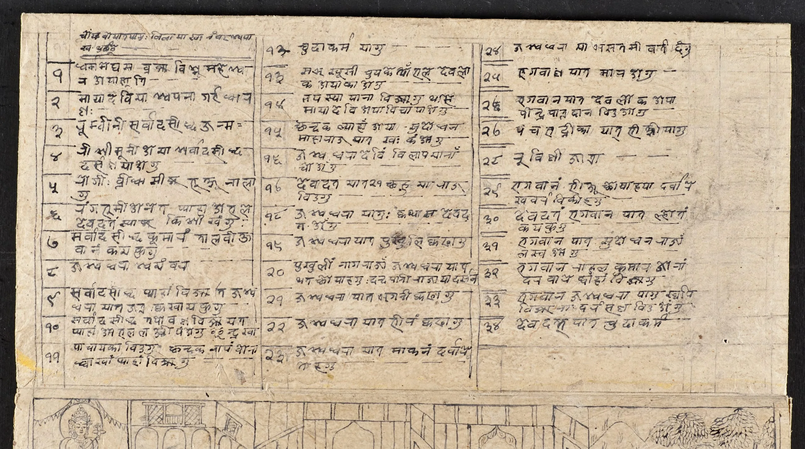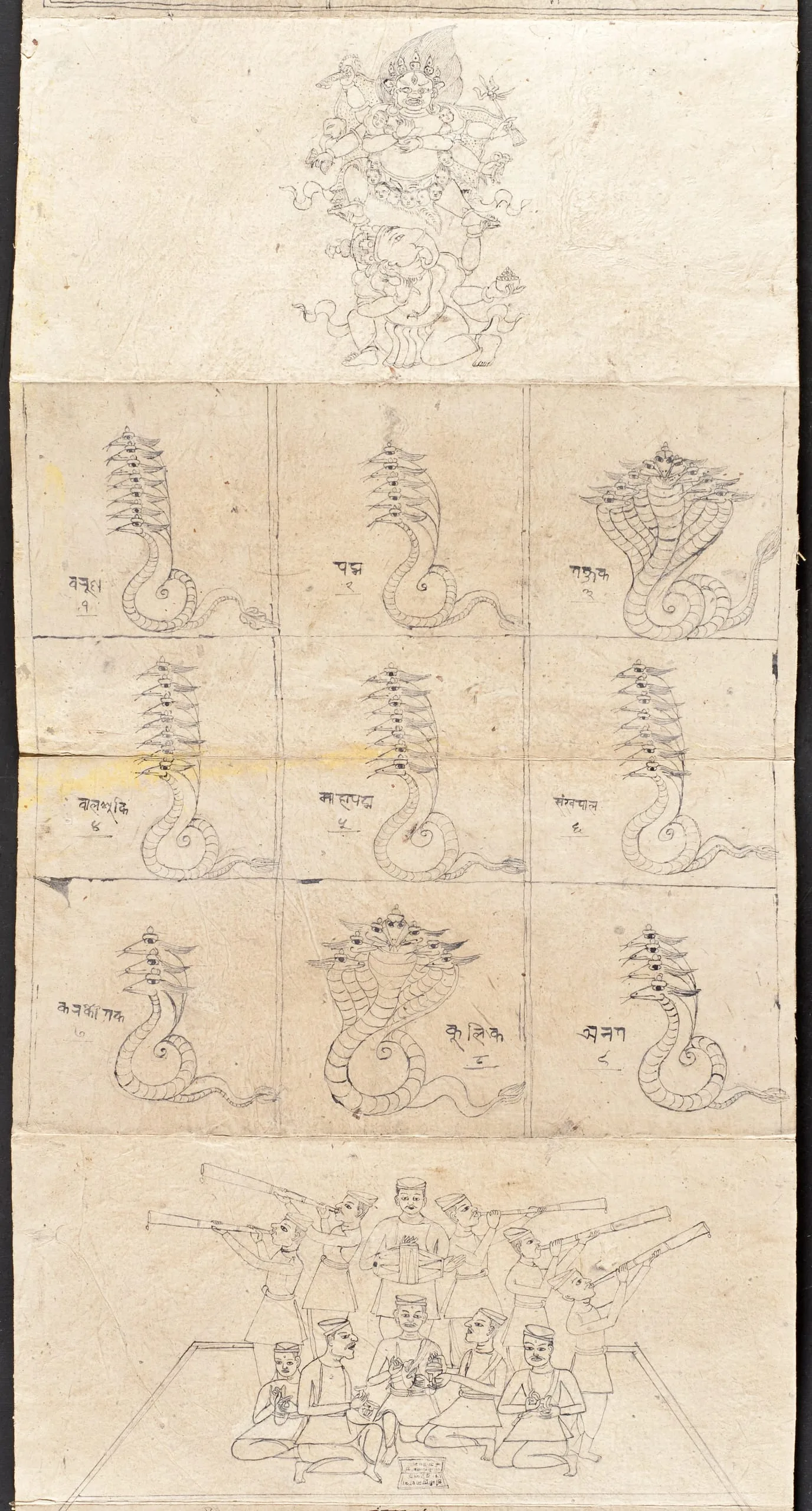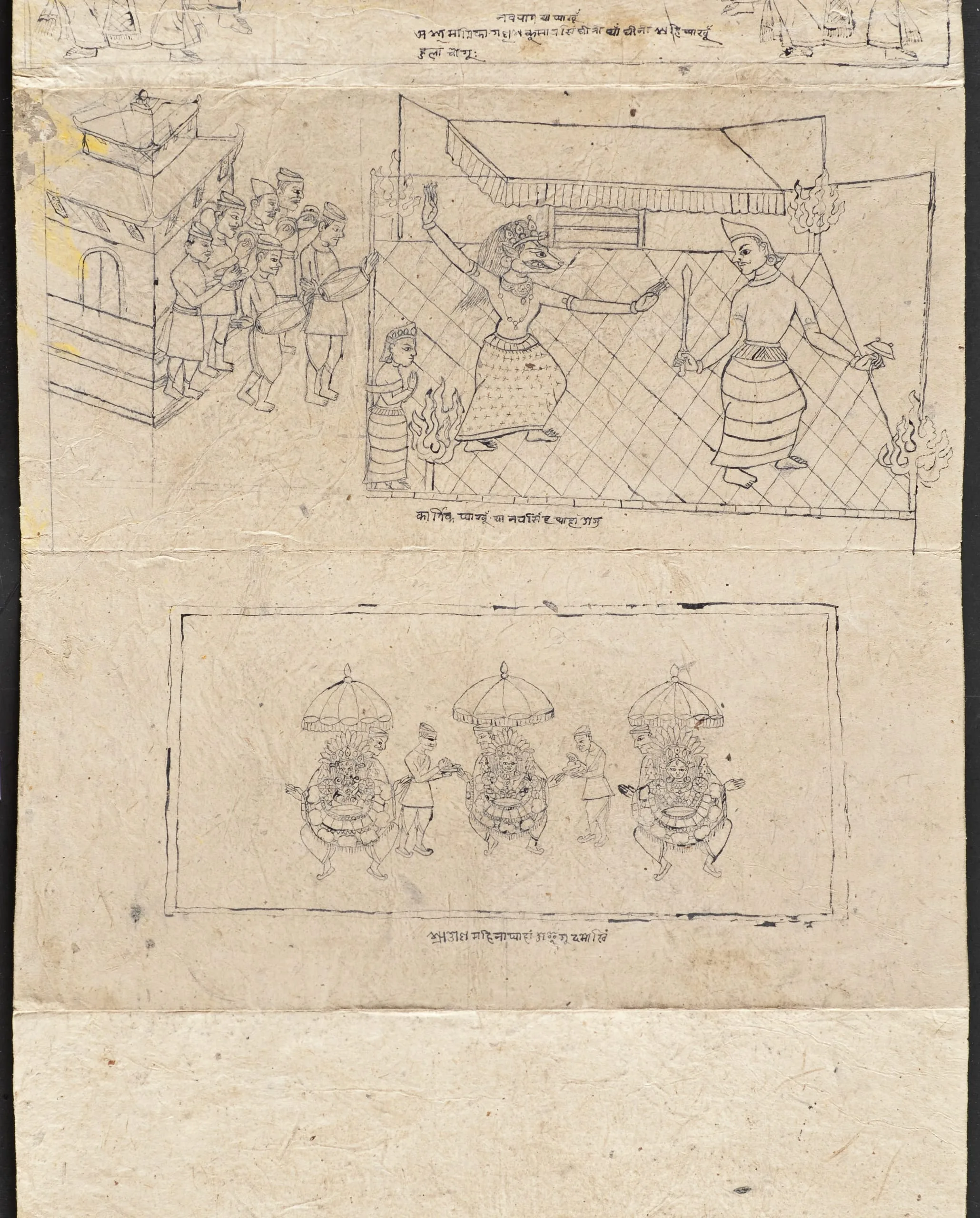 This accordion-fold book (thyasaphu) of thirty-six folios of orpiment (haritala) paper is among the best-preserved and most complete iconographic sources of Newar Buddhist and Hindu imagery. It contains 212 detailed representations of the locally significant Tantric Buddhist deities, such as the eight Mother Goddesses, the primordial goddess Guhyeshvari, and a fully developed iconography of Chakrasamvara and Vajravarahi. There are also illustrations of the life of the Buddha and Buddhist moral fables (avadanas). The book also features Hindu images, such as twelve forms of Vishnu and Shiva, each form associated with a particular month, as well as Vishnu’s twelve avatars and the eight most famous Shivalingas of Nepal.