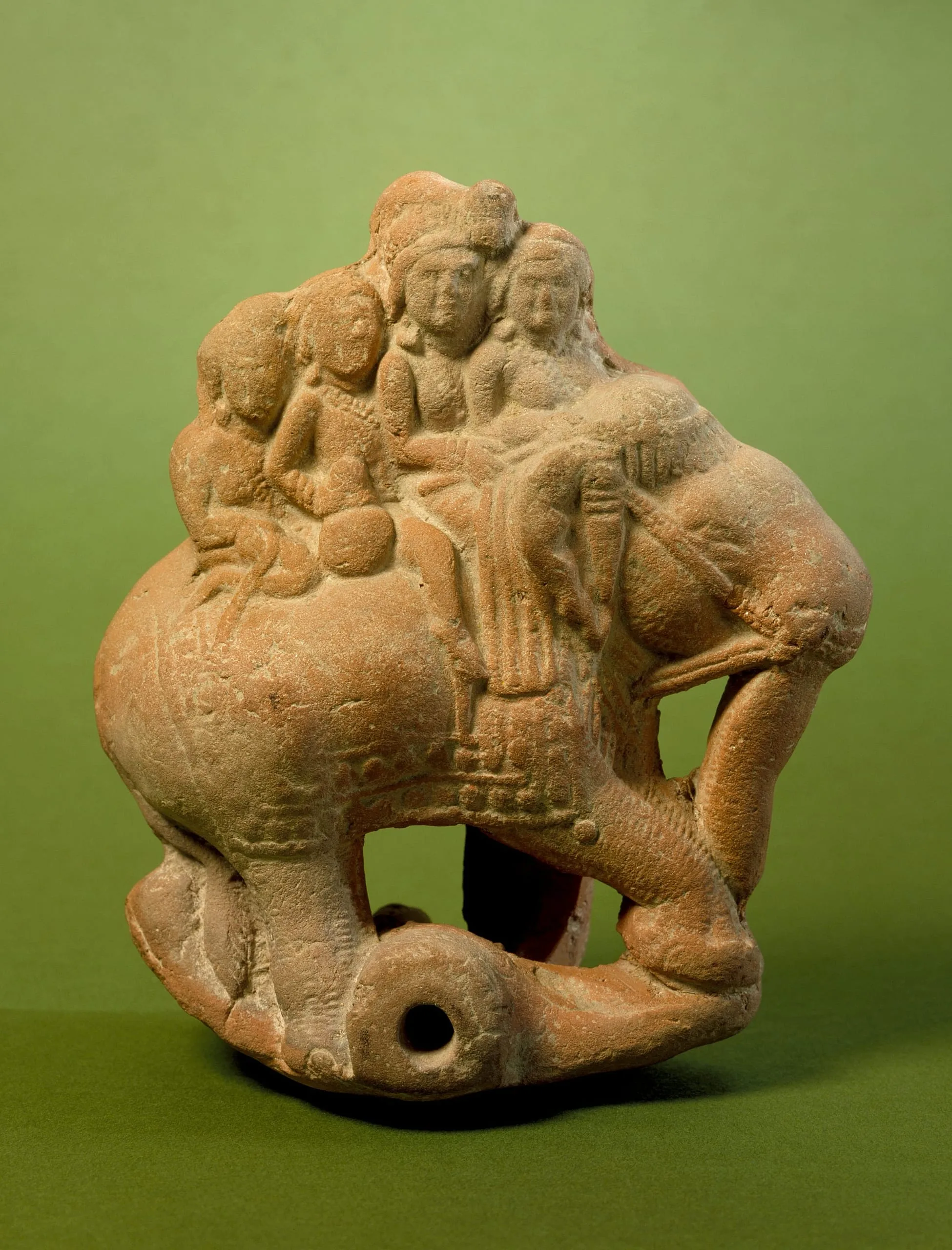 Royal riders on elephant back coming in processions to venerate the Buddha were a common motif on gateways to Buddhist funerary monuments (stupas). It has been suggested that this earthenware elephant with royal riders may depict the transportation of Buddhist relics, as the woman seated behind the turbaned Prince carries a covered urn like the type used to carry the Buddha’s relics (see M.84.151). (See Stanislaw J. Czuma, Kushan Sculpture: Images from Early India (Cleveland: Cleveland Museum of Art in association with Indiana University Press, 1985), pp. 116-117, no. 46.) Earthenware plaques depicting an elephant with royal riders from Kaushambi, attributed to the Shunga Dynasty (circa 185-73 BCE), have also been interpreted as King Udayana abducting Princess Vasavadatta, the daughter of King Mahasena of Avanti. (See Martin Lerner and Steven Kossak, The Lotus Transcendent: Indian and Southeast Asian Art from the Samuel Eilenberg Collection (New York: Metropolitan Museum of Art, 1991), pp. 57-58, no. 14; and Satish Chandra Kala, Terracotta Figurines from Kaushambi (Allahabad: Municipal Museum, 1950), pp. 39-40, 133, 135, Pls. XXX and XXXI.) Given that the LACMA portrayal was a rocking toy, however, suggests that the subject of an elephant with riders was also used for secular objects made for a child’s enjoyment.