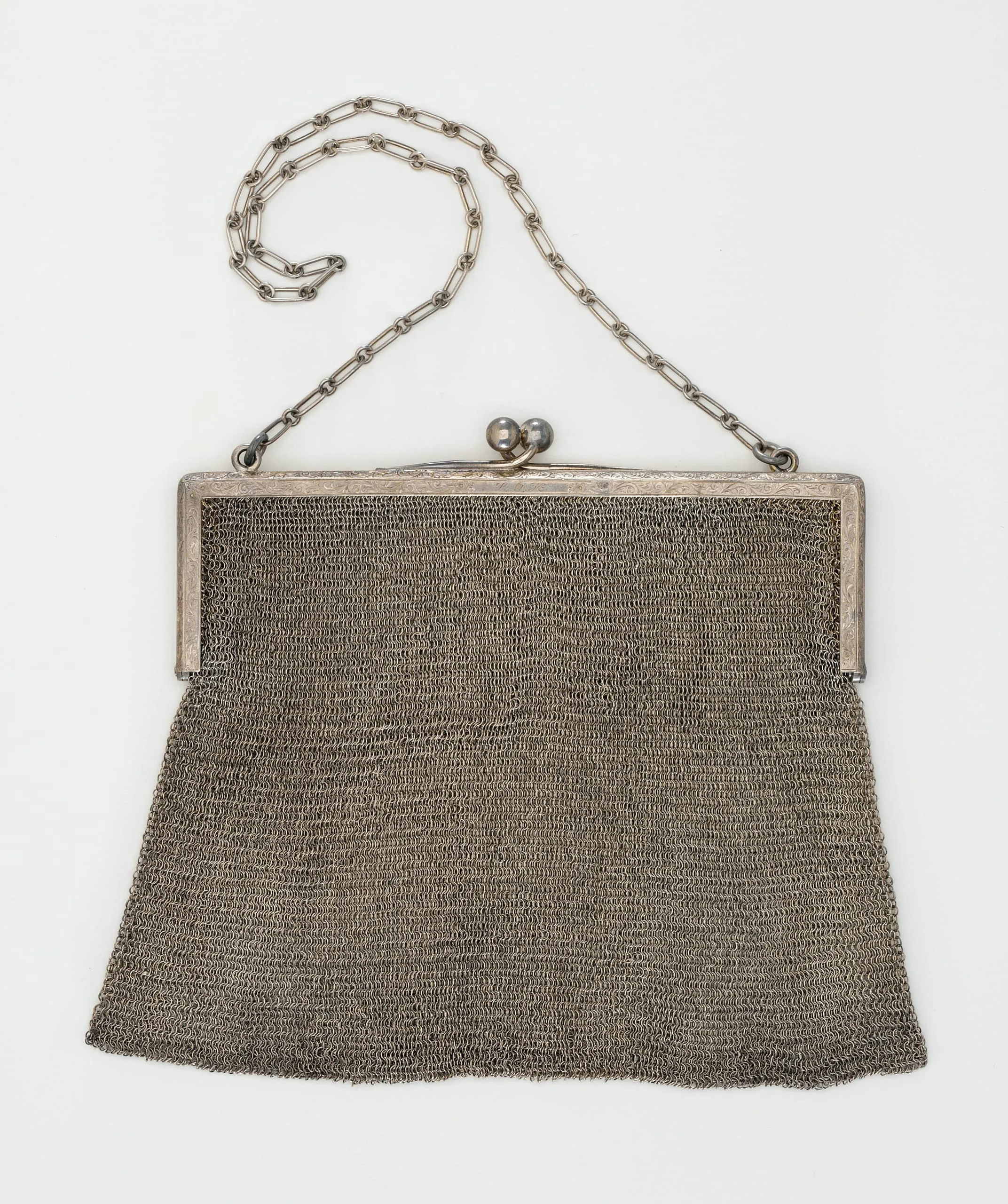 Silver-toned metal mesh handbag with a rectangular frame bar, kiss-lock closure, and oval link chain handle
