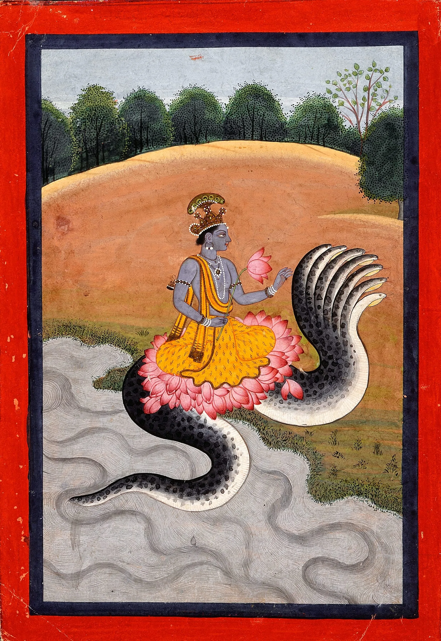 Here, the blue-skinned Krishna with his distinctive peacock feather crown and customary yellow garb is seated on a lotus pedestal on the back of the seven-headed cobra Kaliya rising out of the Yamuna River. He holds a lotus blossom in his right hand and his left hand is held in a gesture similar to ‘fear-not’ (abhaya mudra).