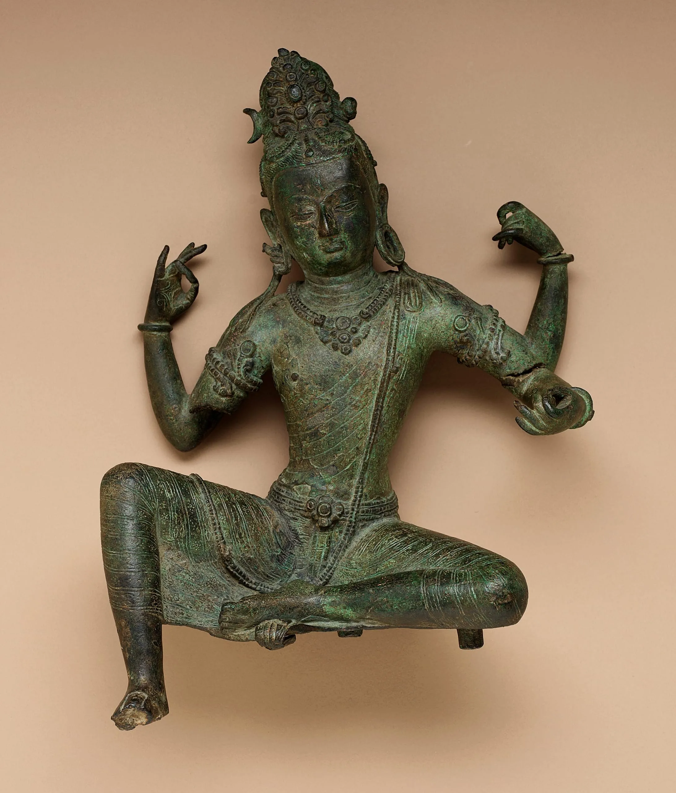 Shiva holds his upper right hand in the gesture of teaching (vitarka mudra). His upper left hand likely once held his trident attribute.