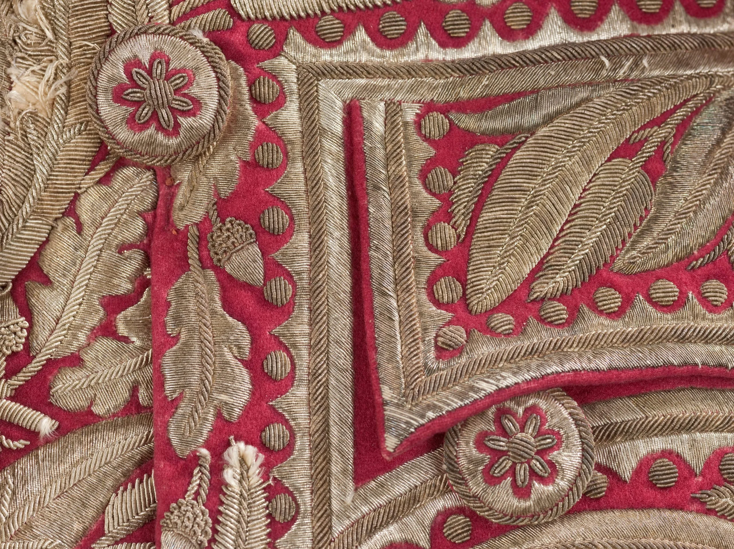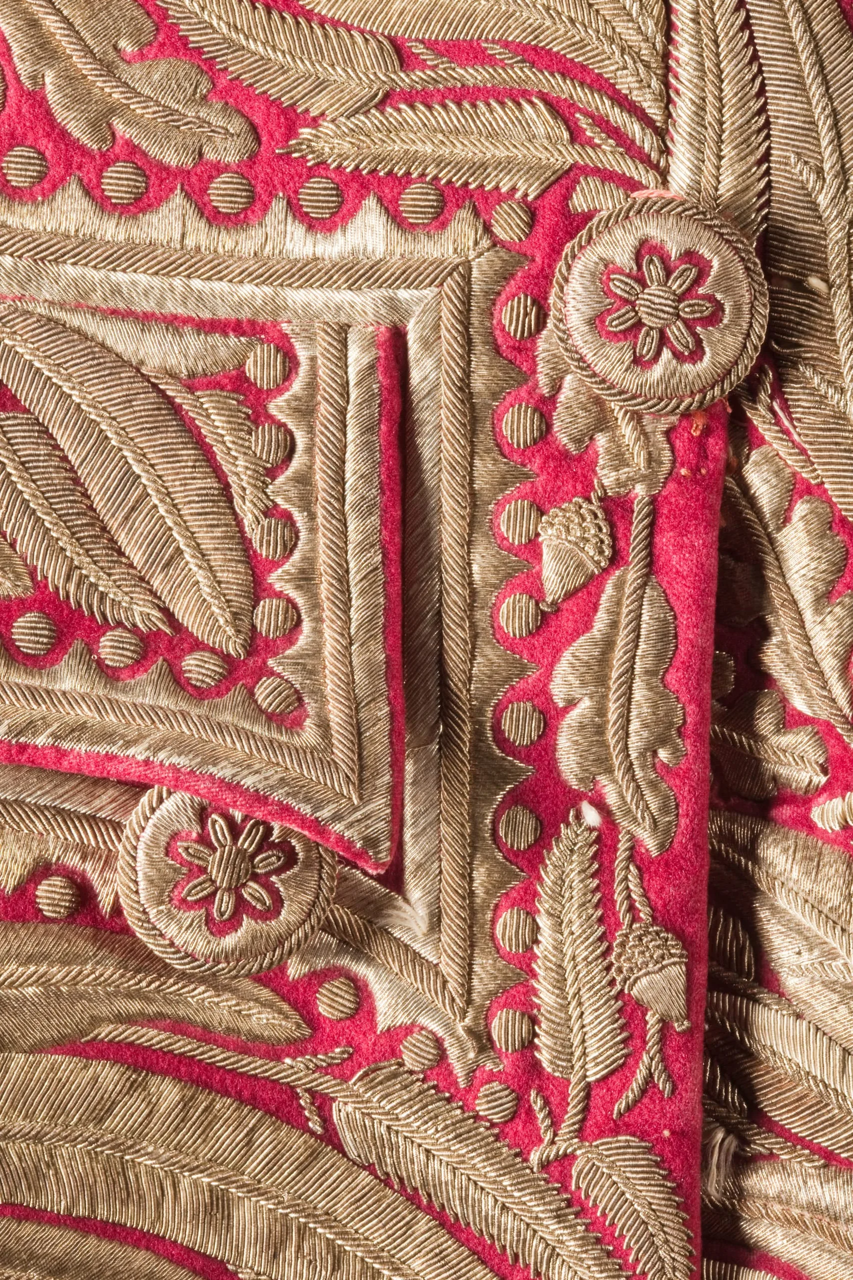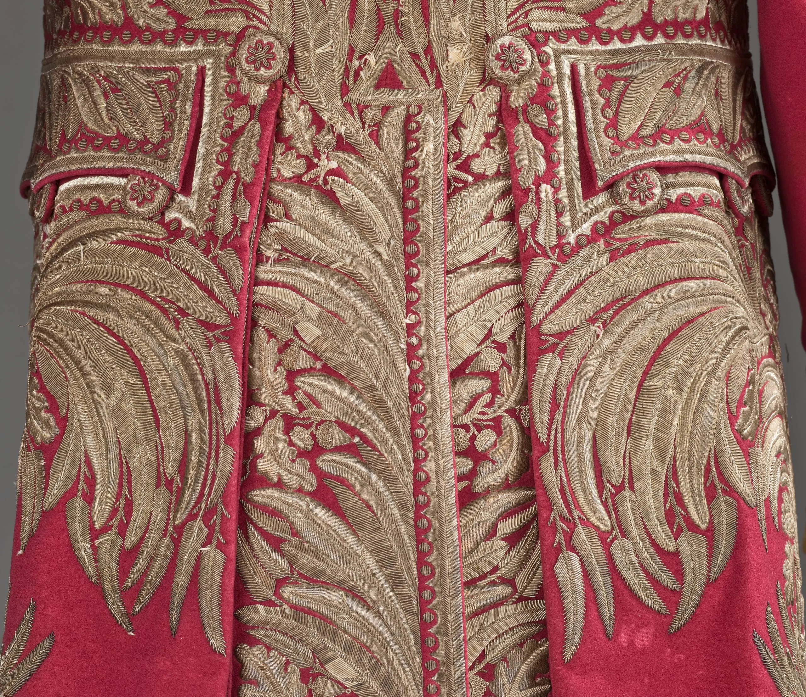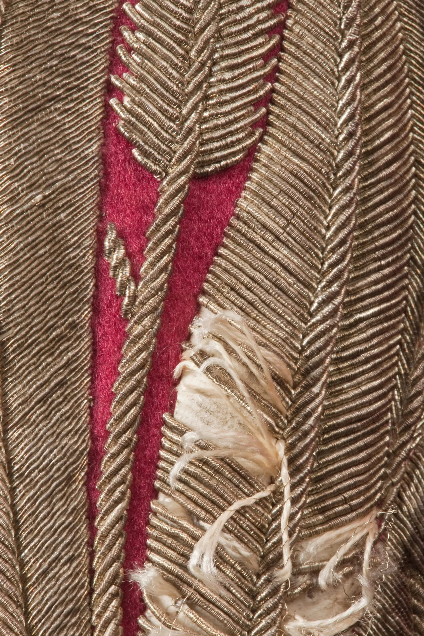- Coat: wool plain weave, full finish, with metallic-thread embroidery