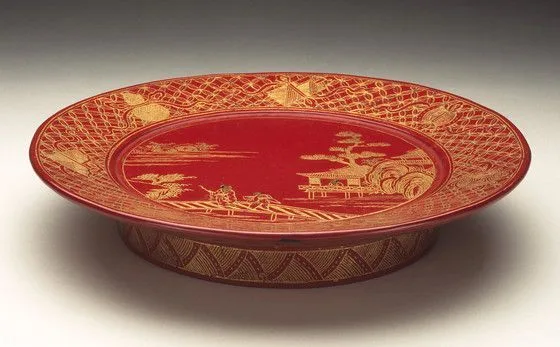 - Red lacquer on wood core with incised and gold-filled decoration (chinkin in Japanese, qiangjin in Chinese)