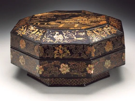 - Octagonal Food Box (Bajiao He) with Figures in a Pavilion and Floral Scrolls