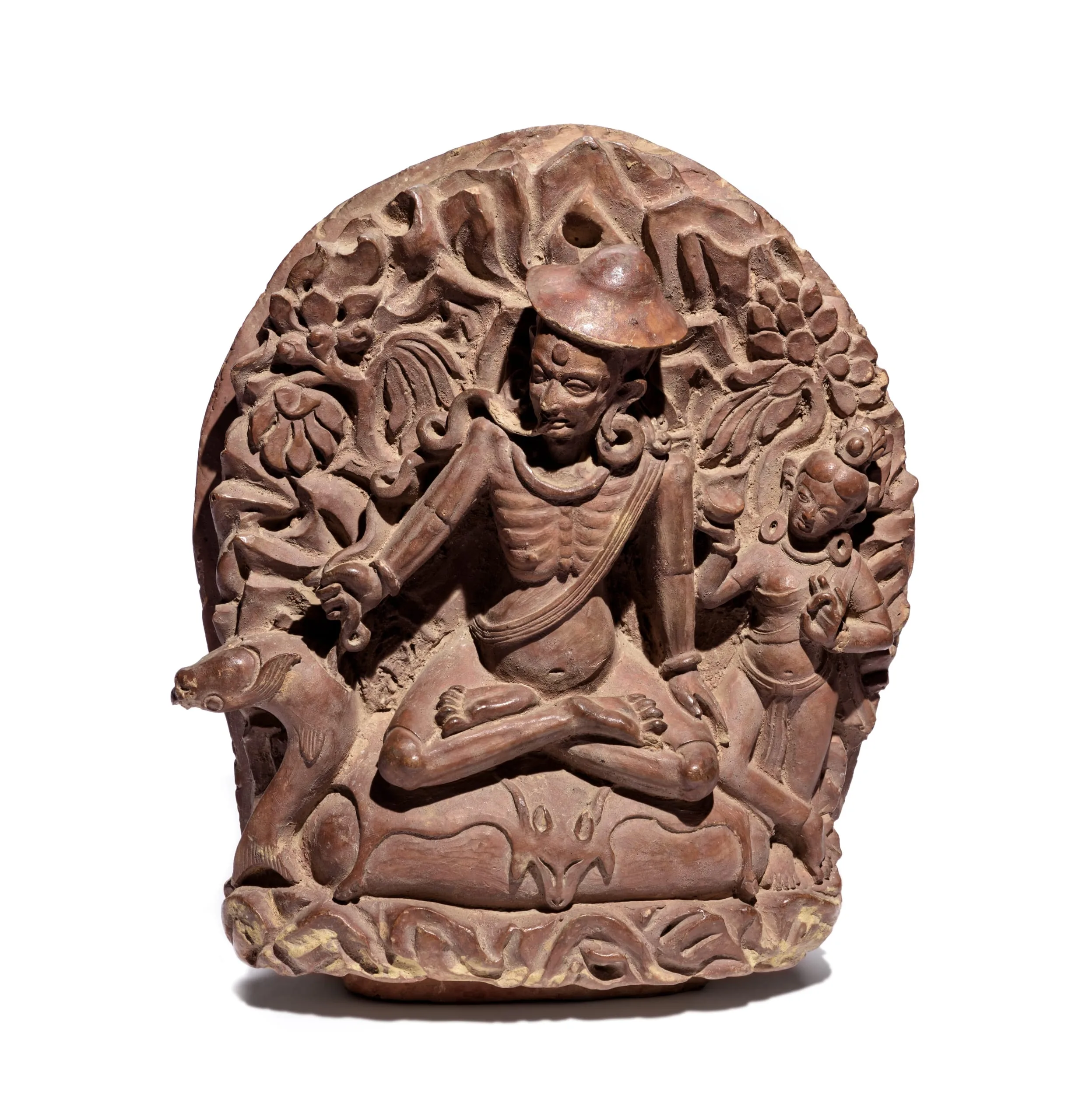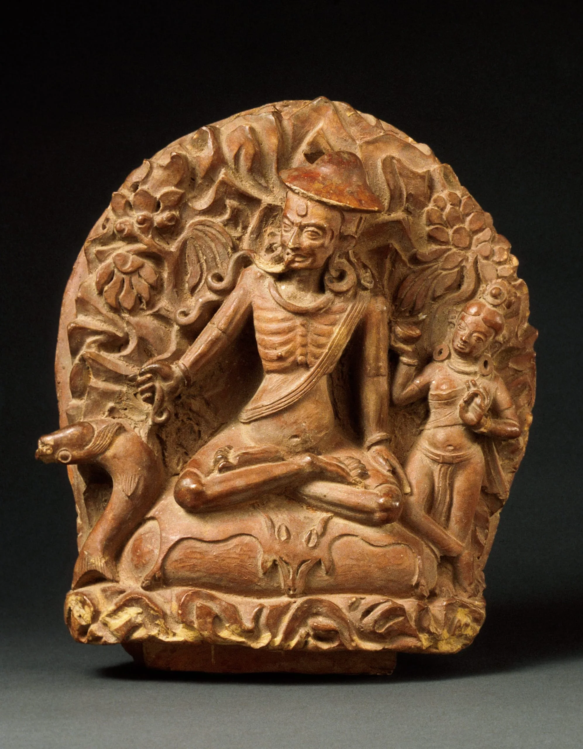 In this animated earthenware plaque, Luipa is shown in the act of eating a fish intestine that twists and curls along his right arm while his hand pulls the entrails from a large fish to his right. He is emaciated, wears a Tibetan-style hat, has a meditation band (yoga banda) draped over his left shoulder, and sits in the meditation posture (padma asana) on an antelope skin. On his left, is likely the female tantric practitioner (dakini) who offered him a cup of rotten fish to overcome his dualistic notions of suitability and unsuitability.